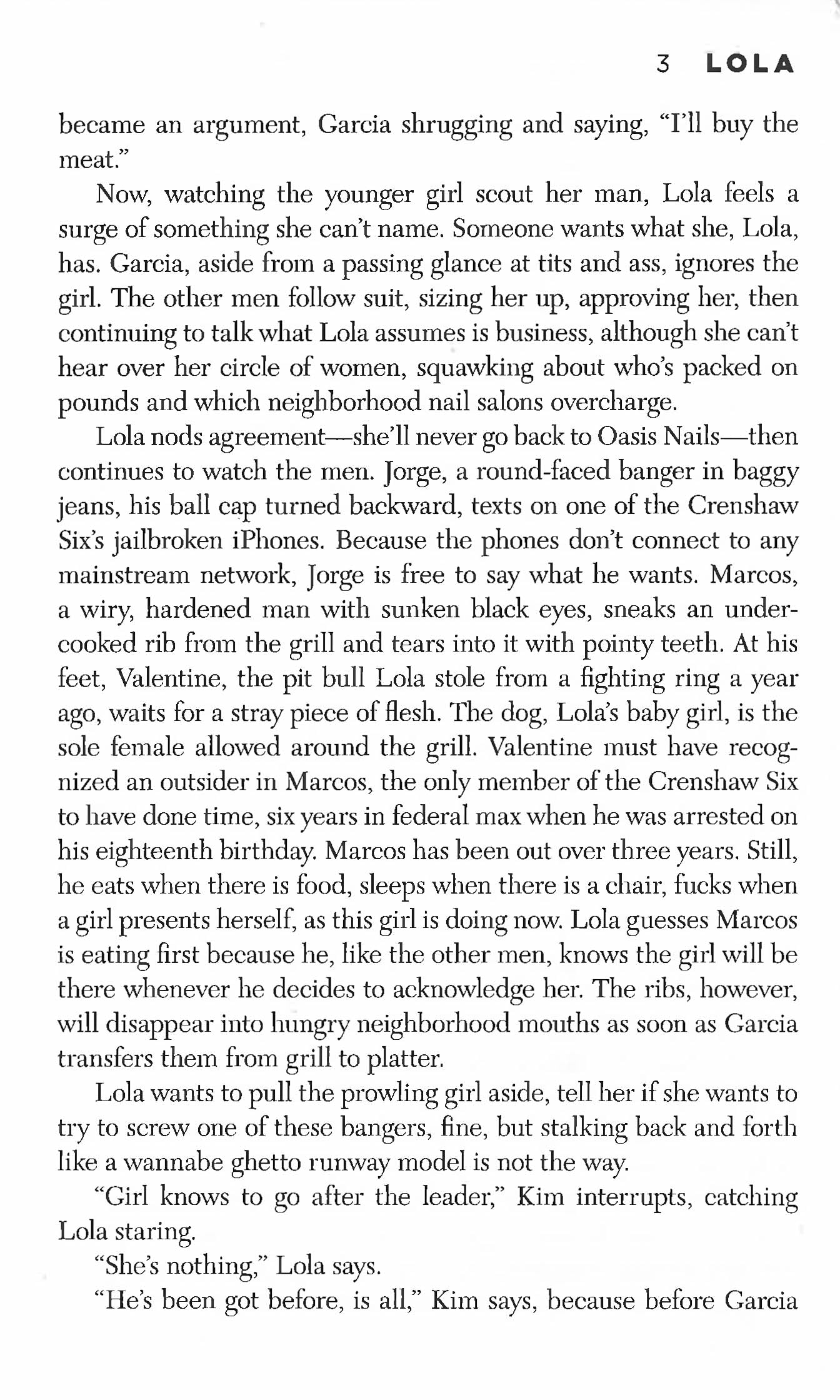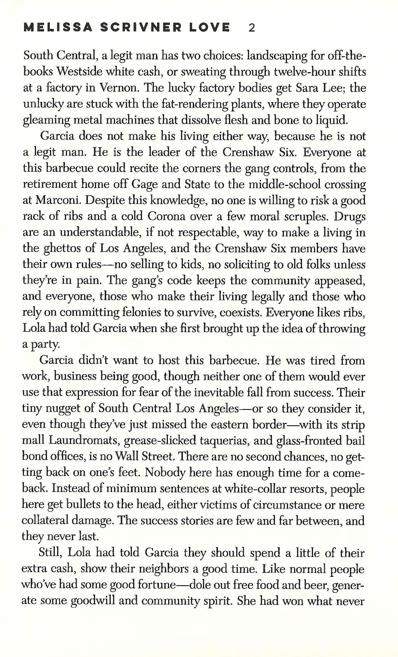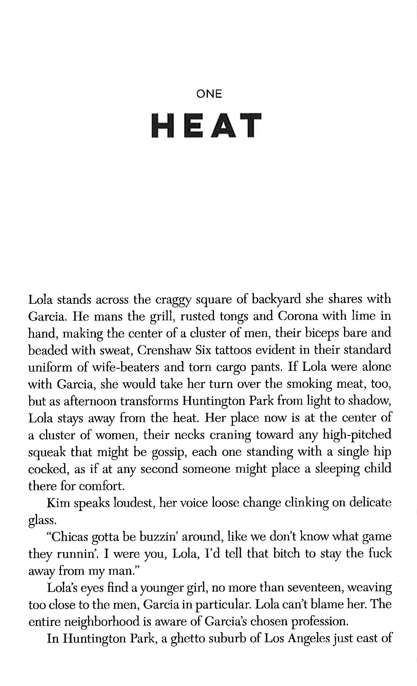 Business has been good lately in their tiny nugget of South Central Los Angeles, where a legit man has two choices: landscaping off-the-books for West Side white cash, or sweating through twelve-hour shifts at a factory in Vernon. Garcia does not make his living either way. If Lola were like the other women at her barbeque, she would spend her work day perched on a padded stool behind a dollar-store cash register. But Lola is not like the other women in Huntington Park.
