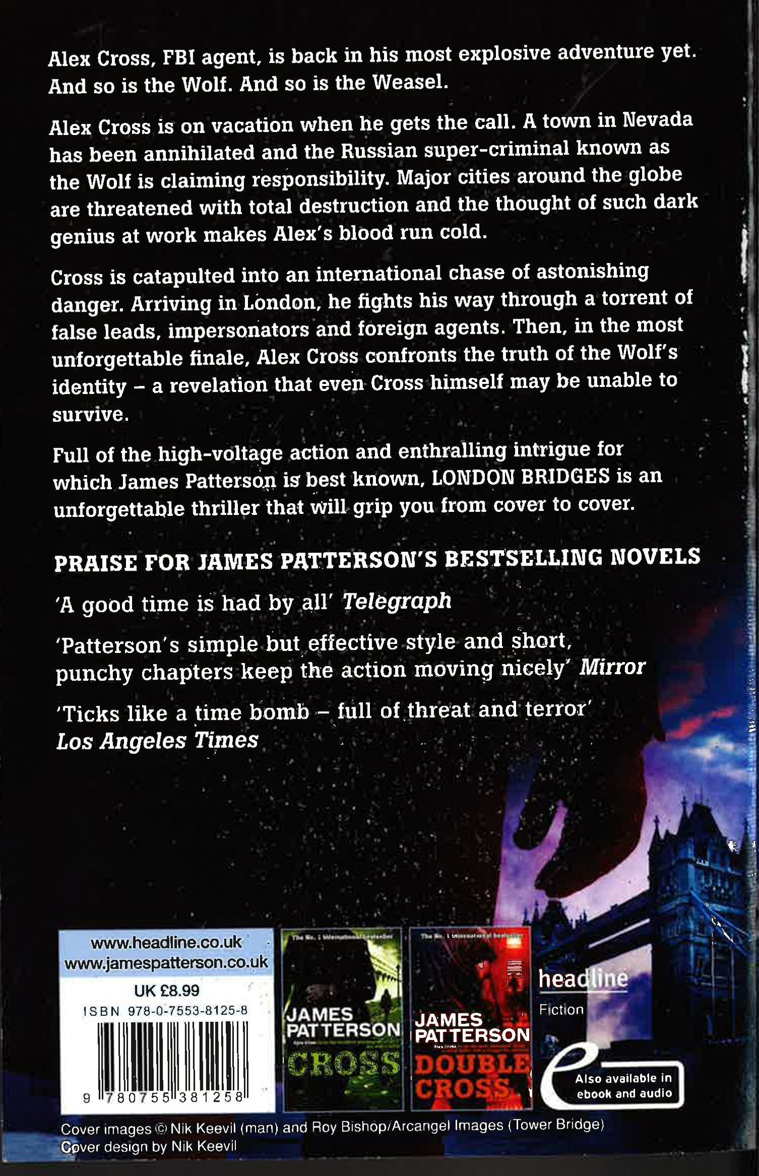 This is the tenth book in the Alex Cross series. Alex Cross, FBI agent, is back in his most explosive adventure yet. And so is the Wolf. And so is the Weasel. Alex Cross is on vacation when he gets the call. A town in Nevada has been annihilated and the Russian super-criminal known as the Wolf is claiming responsibility. Major cities around the globe are threatened with total destruction and the thought of such dark genius at work makes Alex's blood run cold. Cross is catapulted into an international chase of astonishing danger. Full of the high-voltage action and enthralling intrigue for which James Patterson is best known, London Bridges is an unforgettable thriller that will grip you from cover to cover.