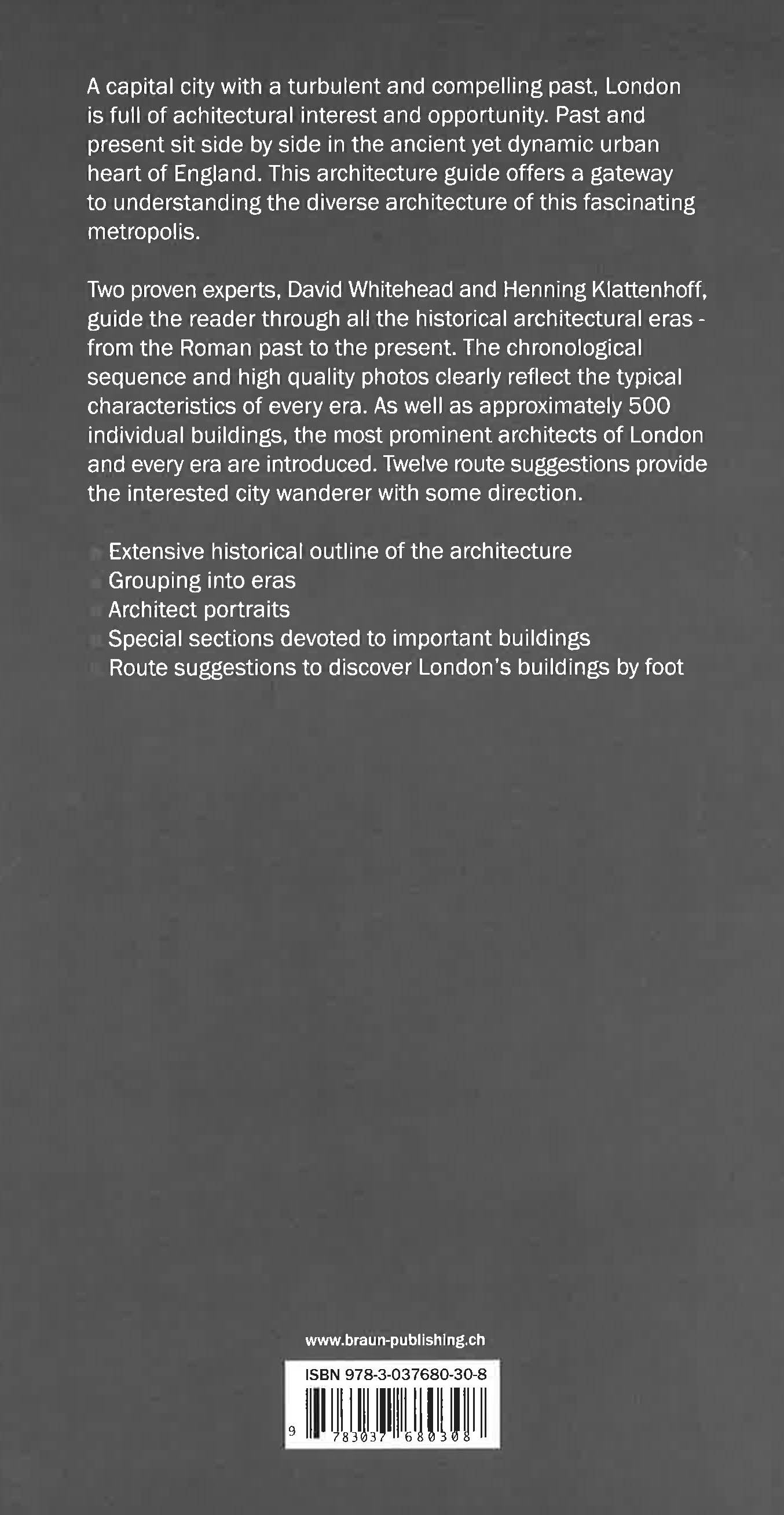 The present architectural guide opens the door to the architecture of this fascinating metropolis. Two proven experts guide the reader through all the historical architectural eras - from the Roman past to the present. The chronological sequence and the high-quality photos clearly reflect the typical characteristic of every era. As well as several hundred individual buildings, the most prominent architects of London and every period are introduced.