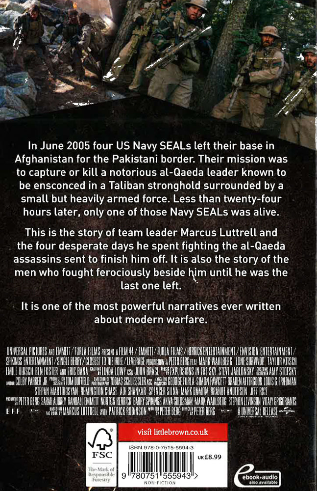 It was a top-secret US military mission. Now, the SEAL team leader finally tells the stunning true story. Now a major Hollywood film starring Mark Wahlberg and Eric Bana.In June 2005 four US Navy SEALs left their base in Afghanistan for the Pakistani border. Their mission was to capture or kill a notorious al-Qaeda leader known to be ensconced in a Taliban stronghold surrounded by a small but heavily armed force. Less than twenty-four hours later, only one of those Navy SEALs was alive.This is the story of team leader Marcus Luttrell, the sole survivor of Operation Redwing. Blasted unconscious by a rocket grenade, blown over a cliff, but still armed and still breathing, Luttrell endured four desperate days fighting the al-Qaeda assassins sent to kill him, before finding unlikely sanctuary with a Pashtun tribe who risked everything to protect him from the circling Taliban killers.