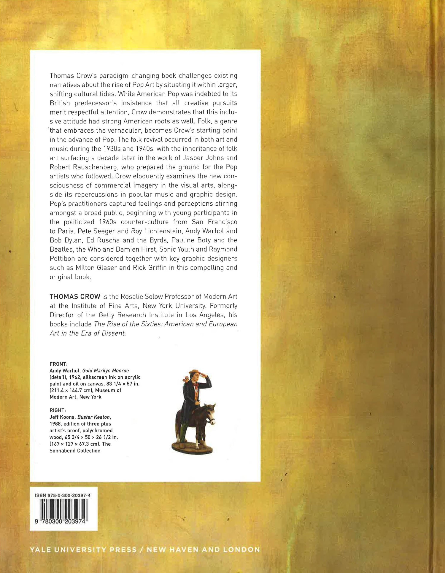 Thomas Crow's paradigm-changing book challenges existing narratives about the rise of Pop Art by situating it within larger cultural tides. While American Pop was indebted to its British predecessor's insistence that any creative pursuit is worthy of aesthetic consideration, Crow demonstrates that this inclusive attitude also had strong American roots. Folk becomes Crow's starting point in the advance of Pop. The folk revival occurred chiefly in the sphere of music during the 1930s and '40s, while folk art surfaced a decade later in the work of Jasper Johns and Robert Rauschenberg. Crow eloquently examines the subsequent explosion of commercial imagery in visual art, alongside its repercussions in popular music and graphic design. Pop's practitioners become defined as artists whose distillation of the vernacular is able to capture the feelings stirring among a broad public, beginning with young participants in the politicized 1960s counterculture. Woody Guthrie and Roy Lichtenstein, Andy Warhol and Bob Dylan, Ed Ruscha and the Byrds, Pauline Boty and the Beatles, the Who and Damien Hirst are all considered together with key graphic designers such as Milton Glaser and Rick Griffin in this engaging book.