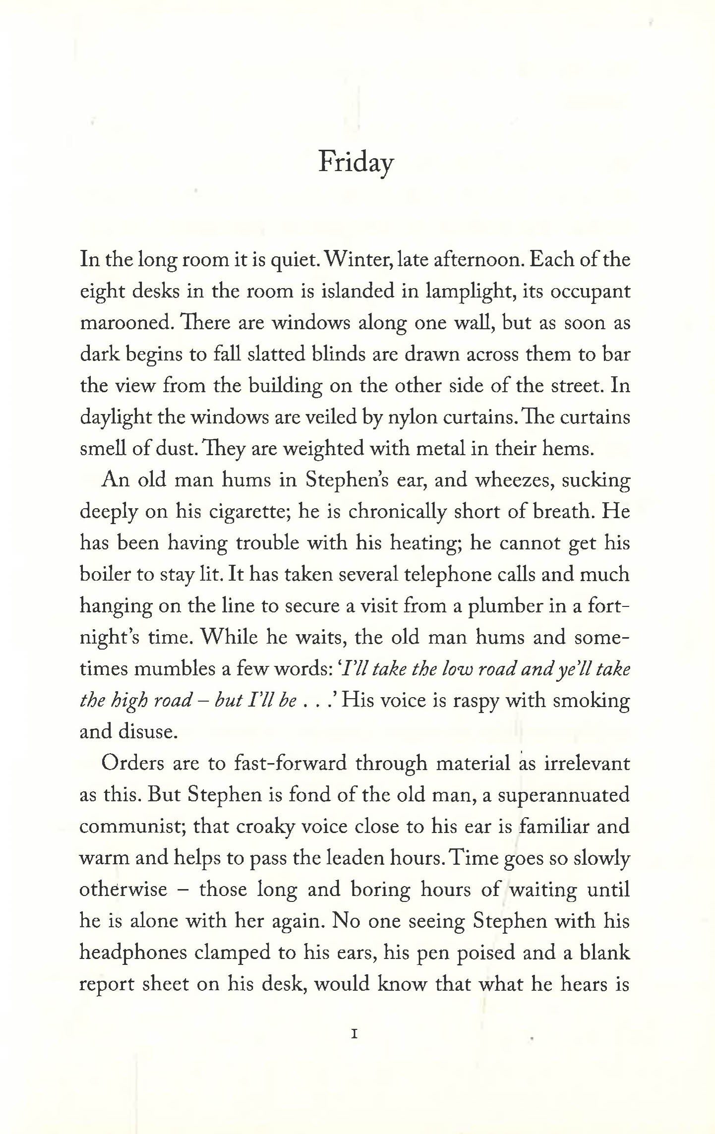What happens to a man who has his ear pressed to the lives of others but not much life of his own? When Stephen Donaldson joins the Institute, he anticipates excitement, romance and new status. Instead he gets the tape-recorded conversations of ancient communists and ineffectual revolutionaries, until the day he is assigned a new case: the ultra-secret PHOENIX. Is PHOENIX really working for a foreign power? Stephen hardly cares; it is the voice of the target's wife that mesmerises him. This is December 1981. Bombs are exploding, a cold war is being waged, another war is just over the horizon and the nation is transfixed by weekly instalments of Brideshead Revisited. Dangerously in love, and lonely, Stephen sets himself up for a vertiginous fall that will forever change his life. As beautiful as it is intense, The Long Room is the dazzling new novel from an award-winning writer. With her mastery of the perfect detail, Francesca Kay explores a mind under pressure and the compelling power of imagination.