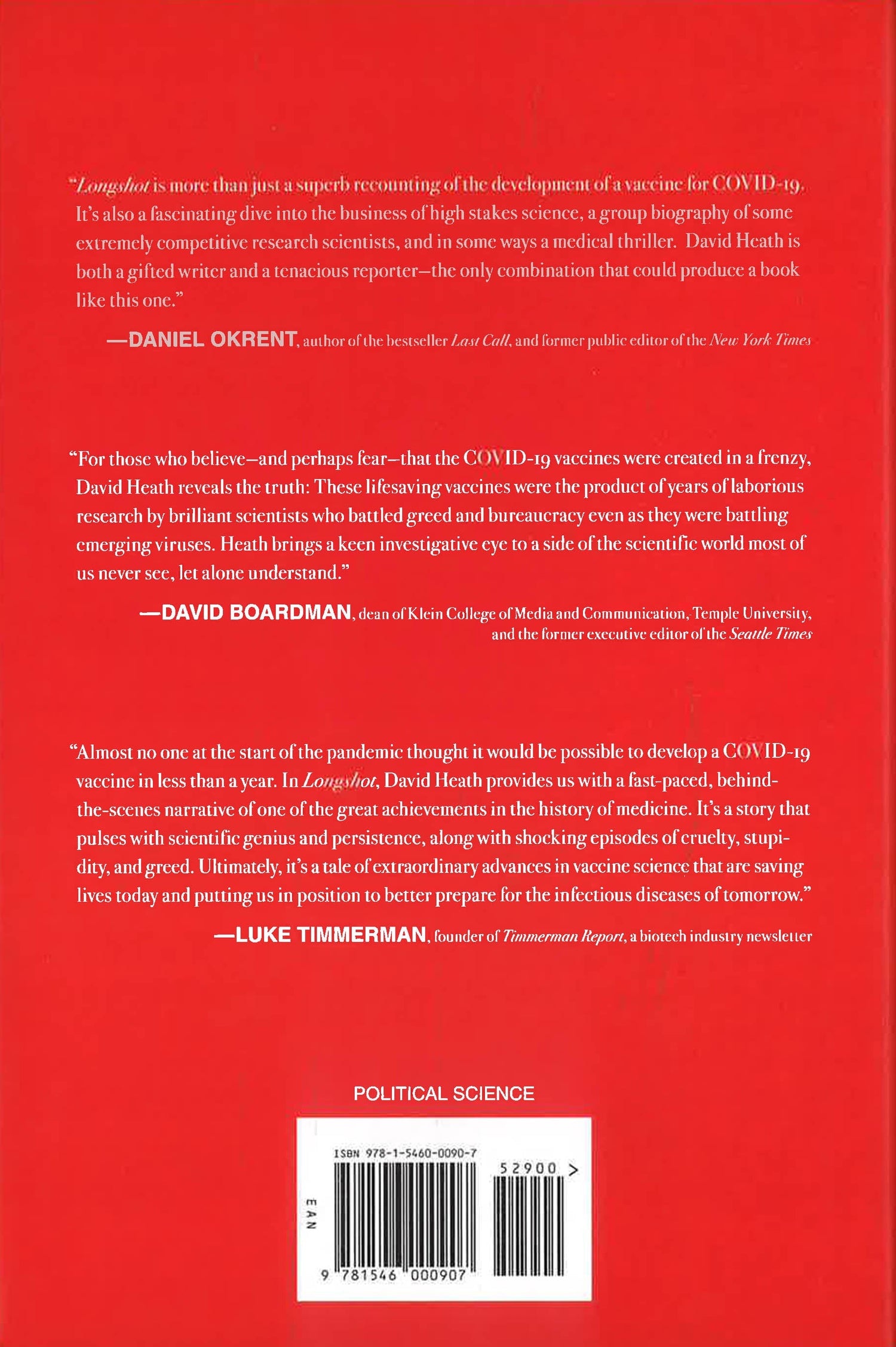 In Longshot, investigative journalist David Heath takes readers inside the small group of scientists whose groundbreaking work was once largely dismissed but whose feat will now eclipse the importance of Jonas Salk's polio vaccine in medical history. With never-before-reported details, Heath reveals how these scientists overcame countless obstacles to give the world an unprecedented head start when we needed a COVID-19 vaccine.