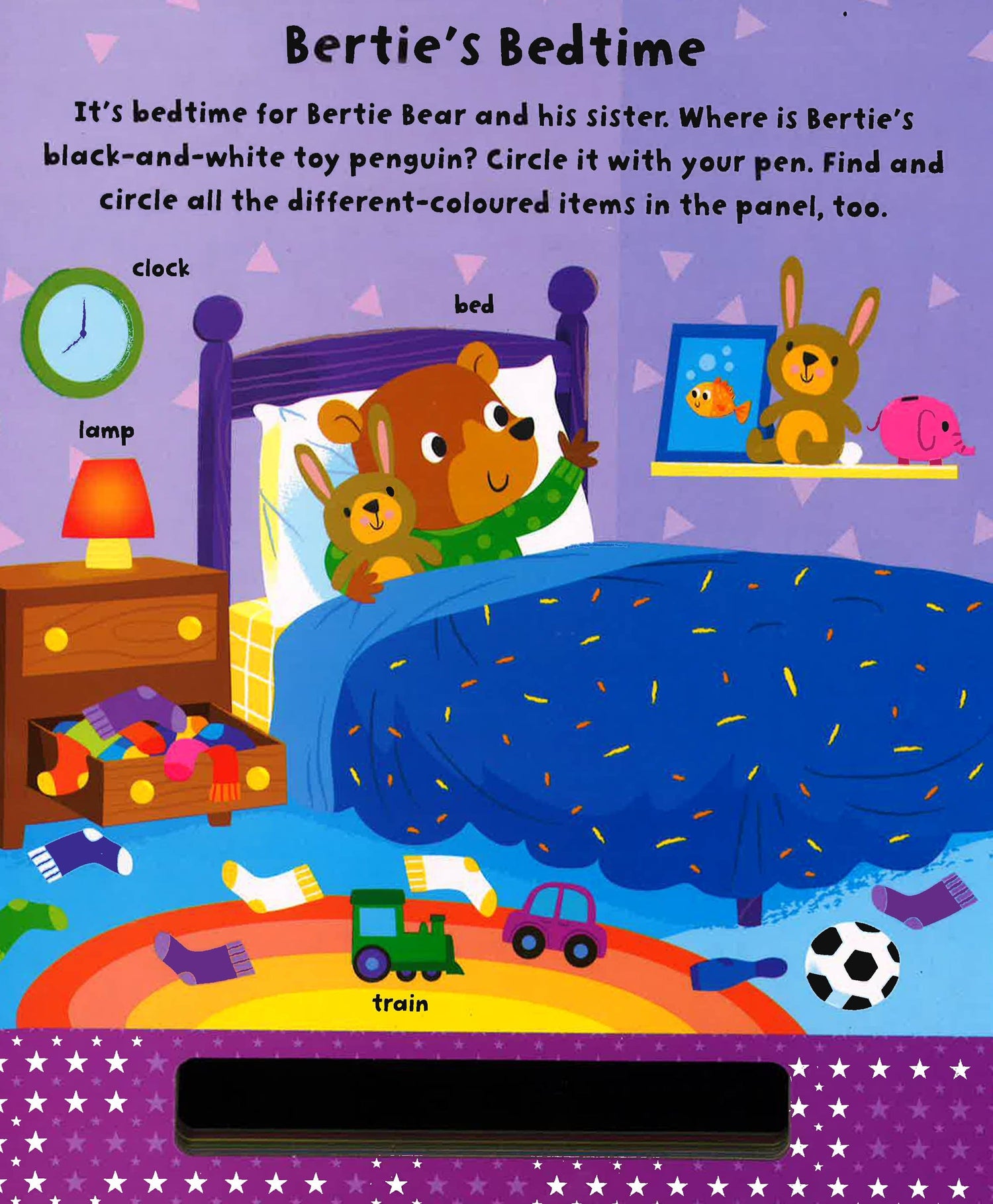 Join Bertie Bear for a colourful playtime in this wipe-clean book full of finding fun! Discover a different colour in every scene, as you find and circle the items. There are over 50 first words to learn, too. With wipe-clean pages and a pen, toddlers can enjoy look-and- find fun again and again.