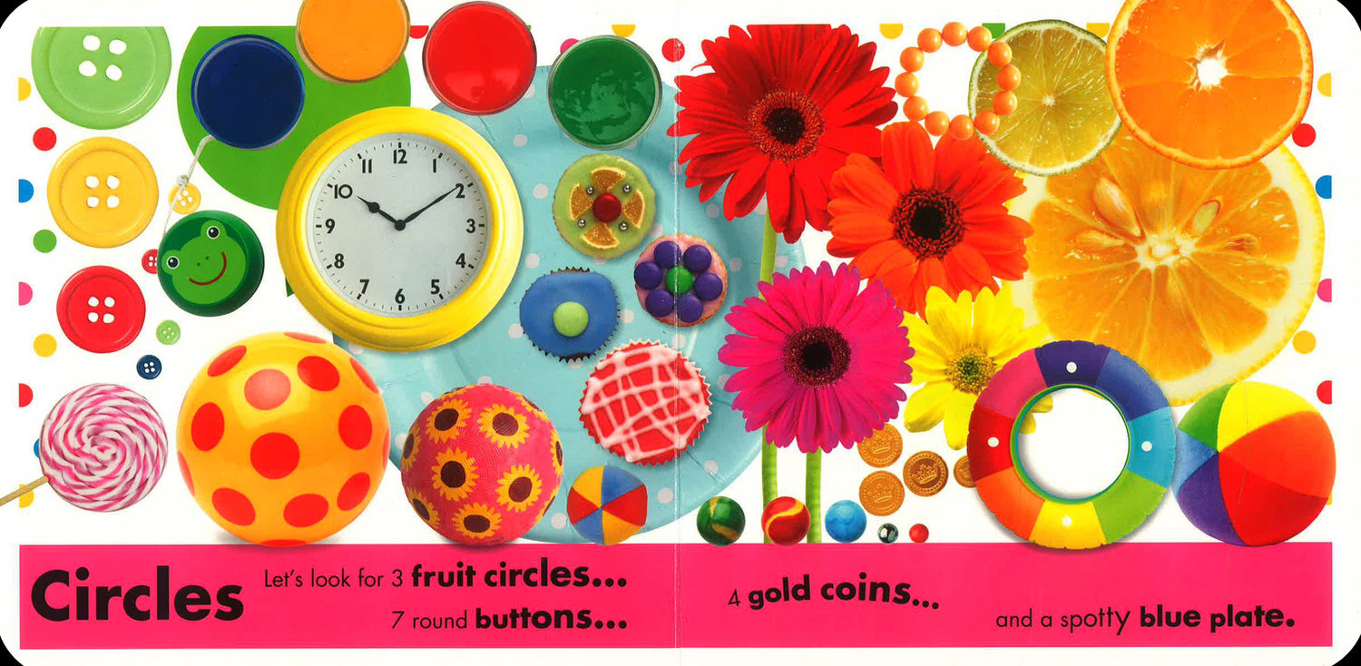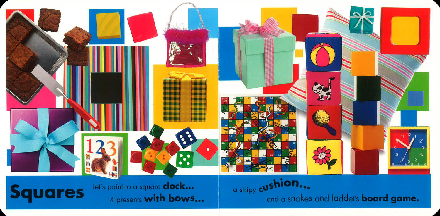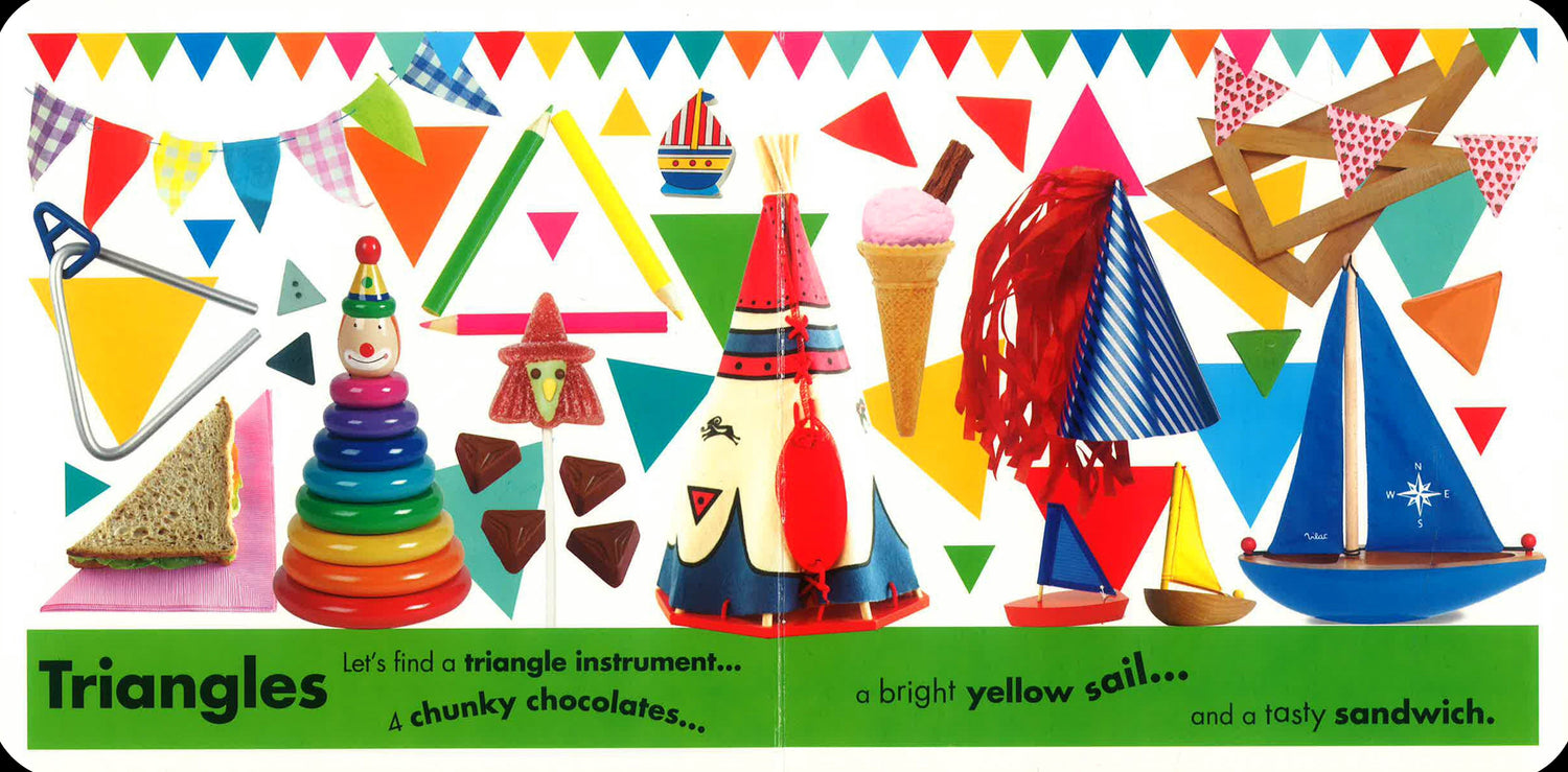 Let's look for 3 fruit circles.Let's find 4 chocolate triangles.Let's point to the postage stamp that's a rectangle. Packed with pictures, this fun-filled photo quiz is perfect for children and adults to share together.Just look and find!