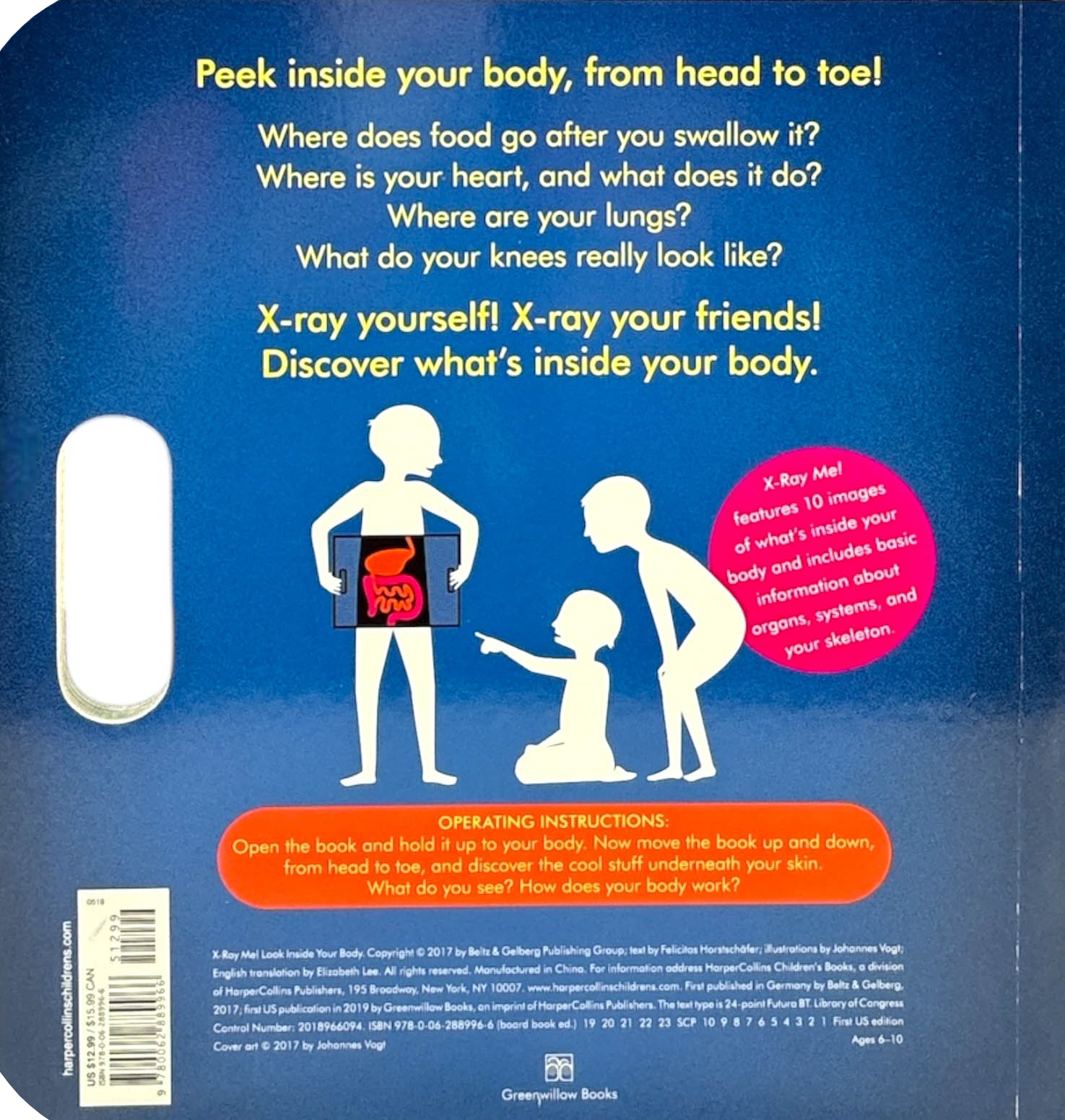 Open the book and hold it up to your body. Now move the book up and down, from head to toe, and discover the cool stuff underneath your skin. What do you see? How does your body work?