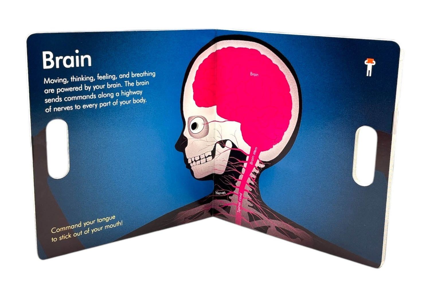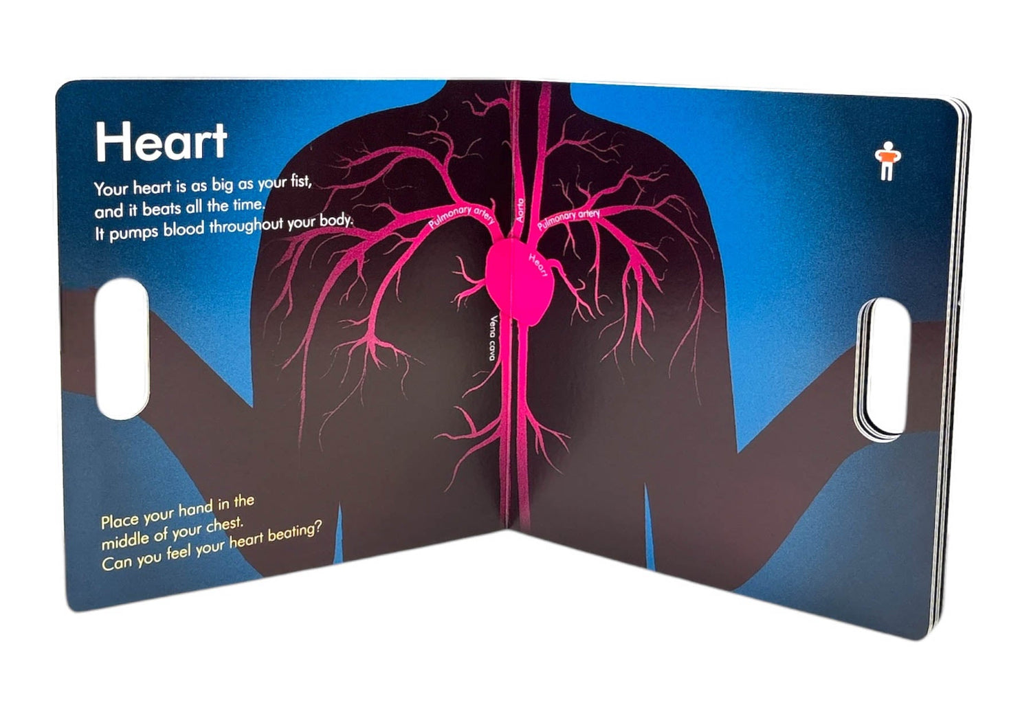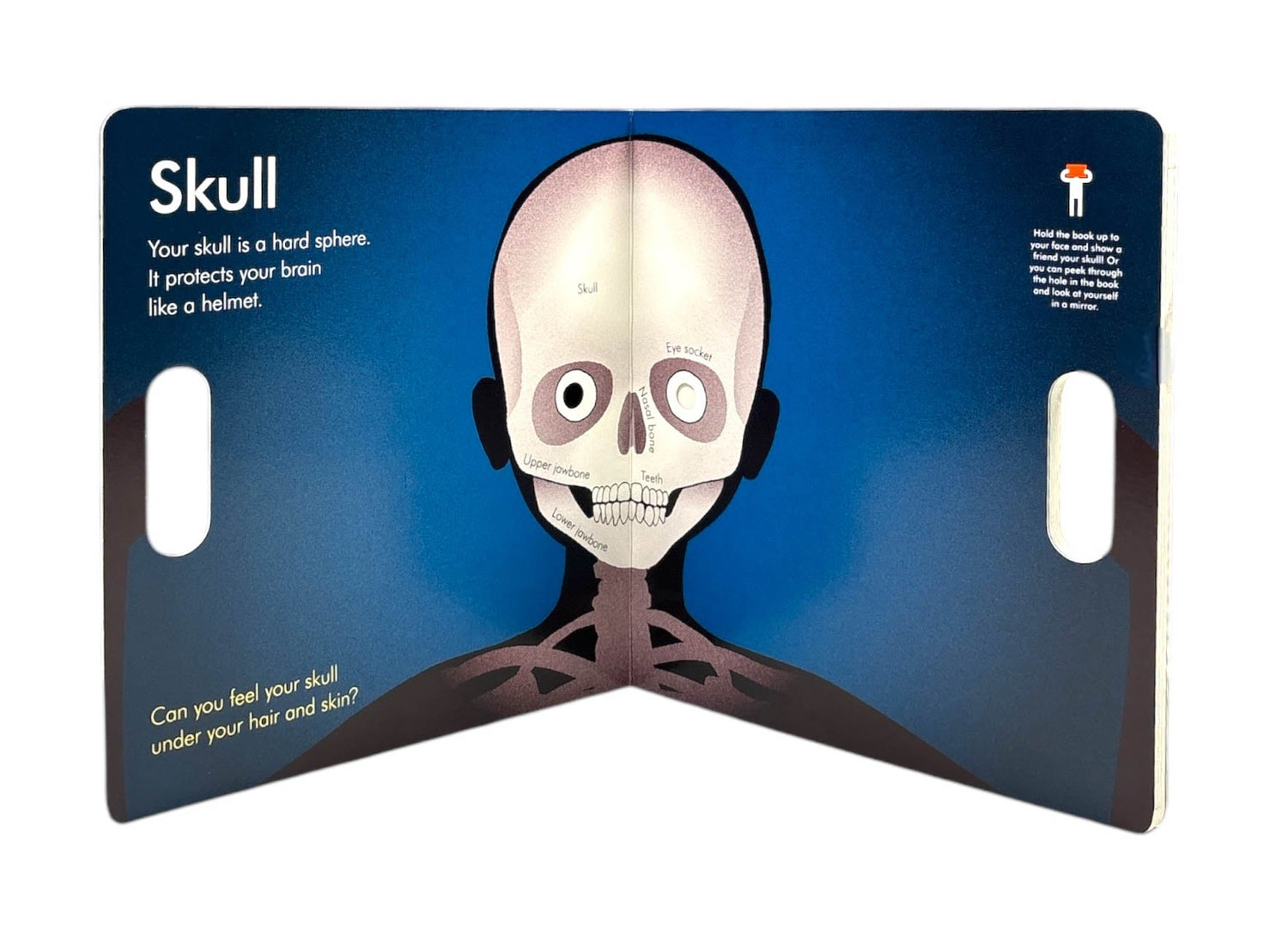 Two die-cut handles allow readers to hold the book up to their bodies and visualize various body parts and organs—including bones, the brain, lungs, heart, and many more. This unique book is perfect for sharing with friends and sharing in the classroom!
