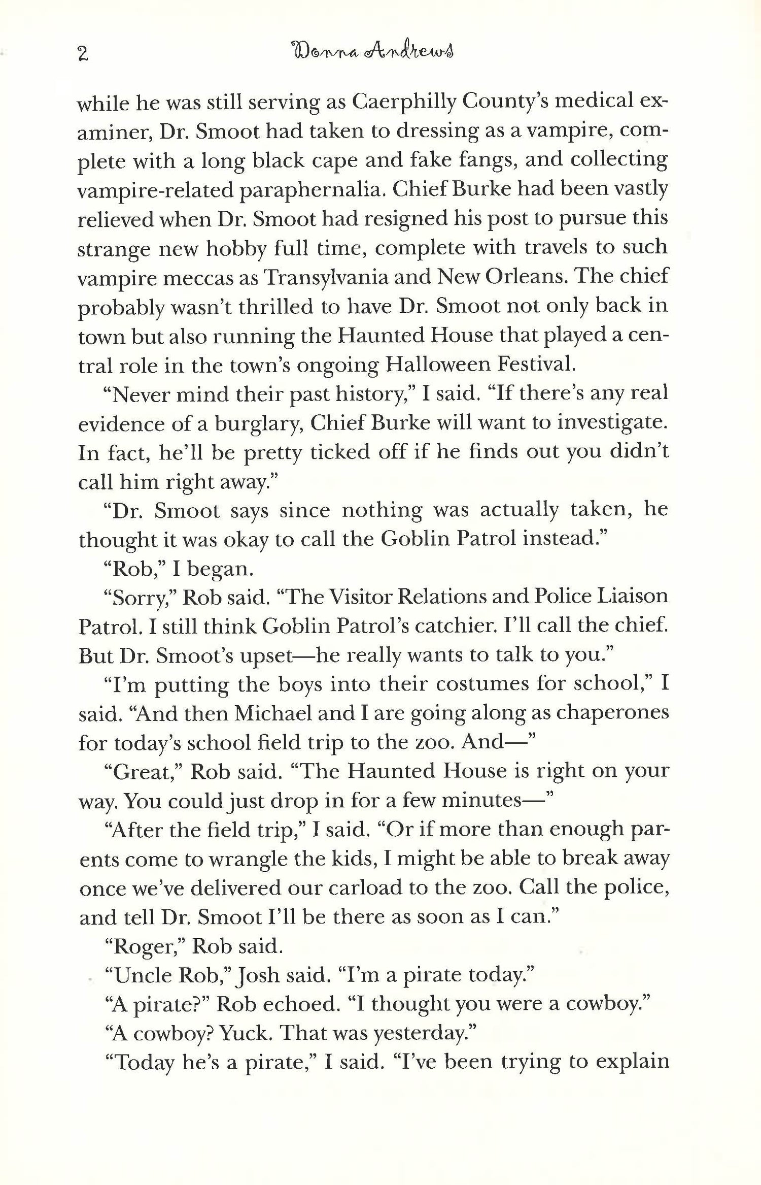 A new side-splitting Meg Langslow mystery from award-winning,New York Times bestselling author of The Good, The Bad, and The Emus. The brilliantly funny Donna Andrews delivers another winner in the acclaimed avian-themed series that mystery readers have come to love. The eighteenth book in her New York Times best-selling series continues to surprise and delight in this next knee-slapping adventure featuring Meg Langslow and all the eccentric characters that make up her world. It's another holiday and Mayor Randall Shiffley has turned Caerphilly, Virginia into Spooky City, USA. The residents are covering every window with cobwebs and roaming the streets in costume to entertain the tourists, and Meg's grandfather is opening a new "Creatures of the Night" exhibit in the zoo. When a real body at the zoo and a suspicious fire at the Haunted House threaten to mar the town's creepy fun, it's up to Meg Langslow to save Halloween.