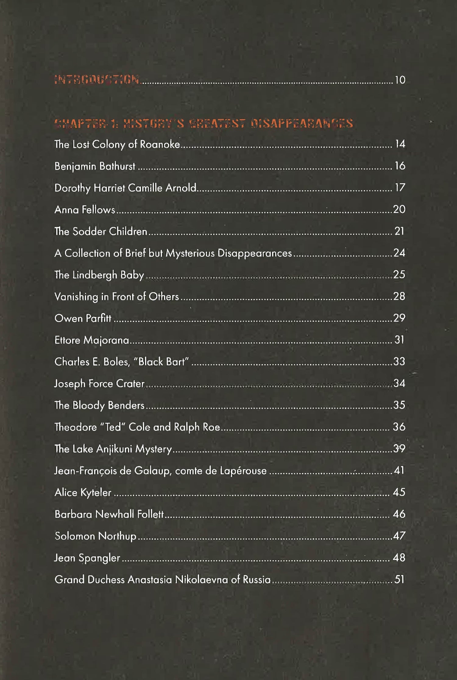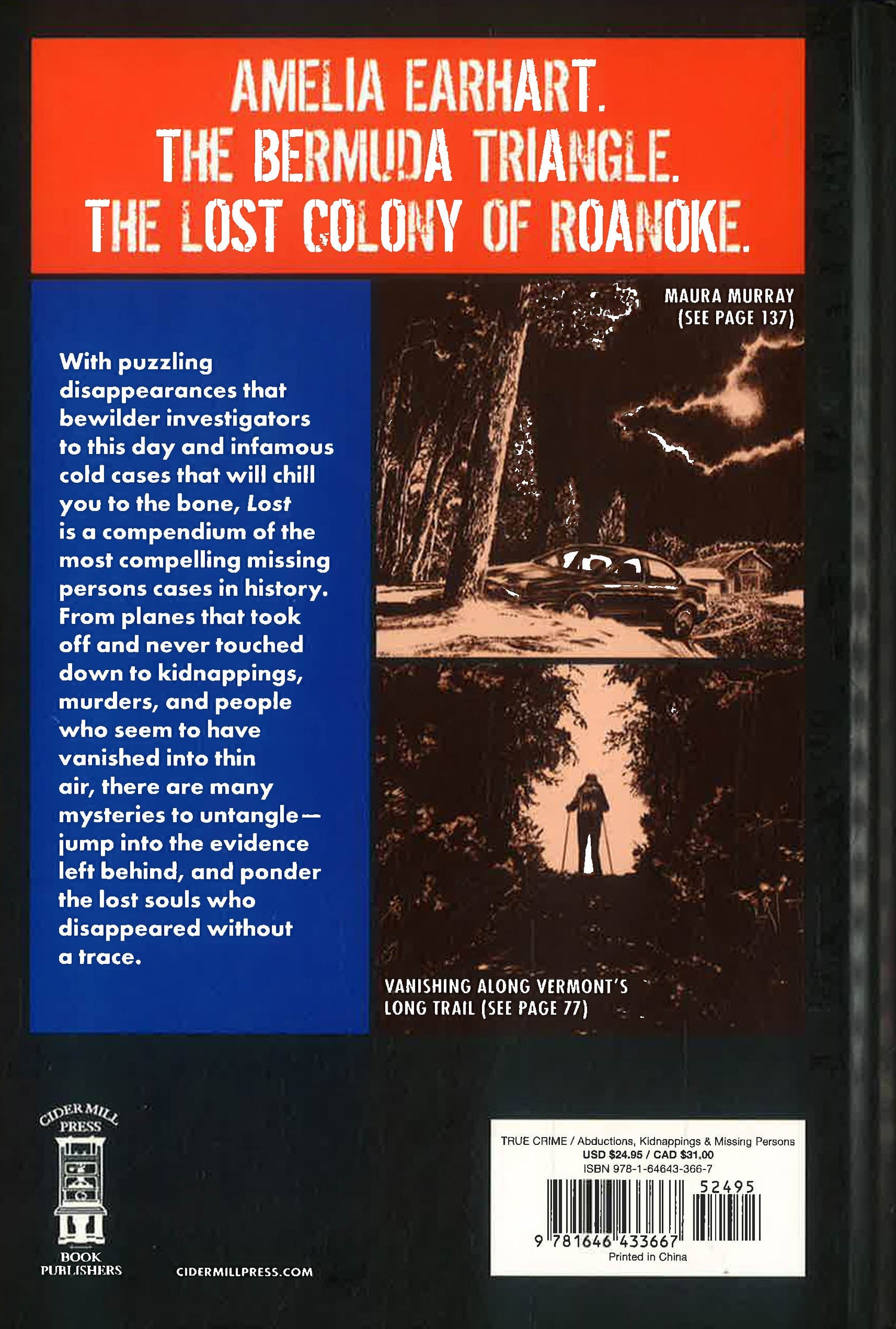The Bermuda Triangle. Amelia Earhart. The Mary Celeste. D.B. Cooper. The lost colony of Roanoke. The Lindbergh baby. With puzzling disappearances that bewilder investigators to this day and infamous cold cases that will chill you to the bone, Lost is a compendium of the most compelling missing persons cases in history. These notorious stories will have true crime fans on the edge of their seats. From planes that took off and never touched down to kidnappings, murders, and people who seem to have vanished into thin air, jump into the evidence left behind to untangle these mysteries—and ponder the lost souls who disappeared without a trace.