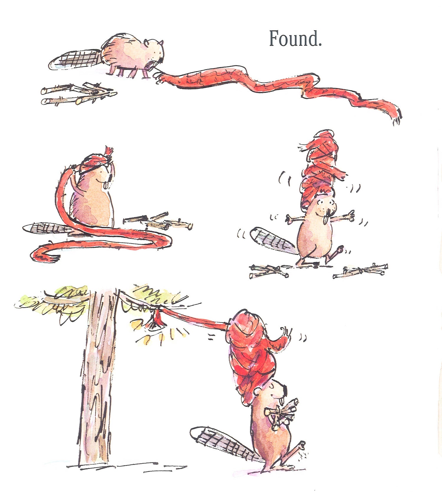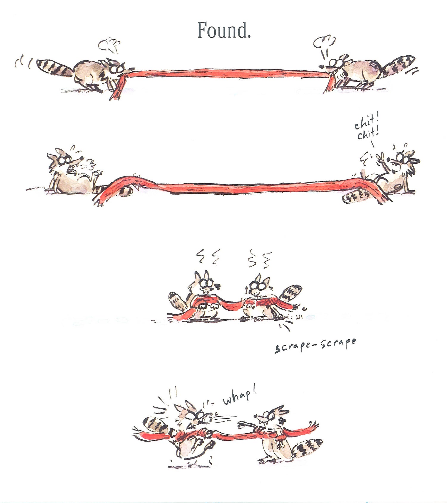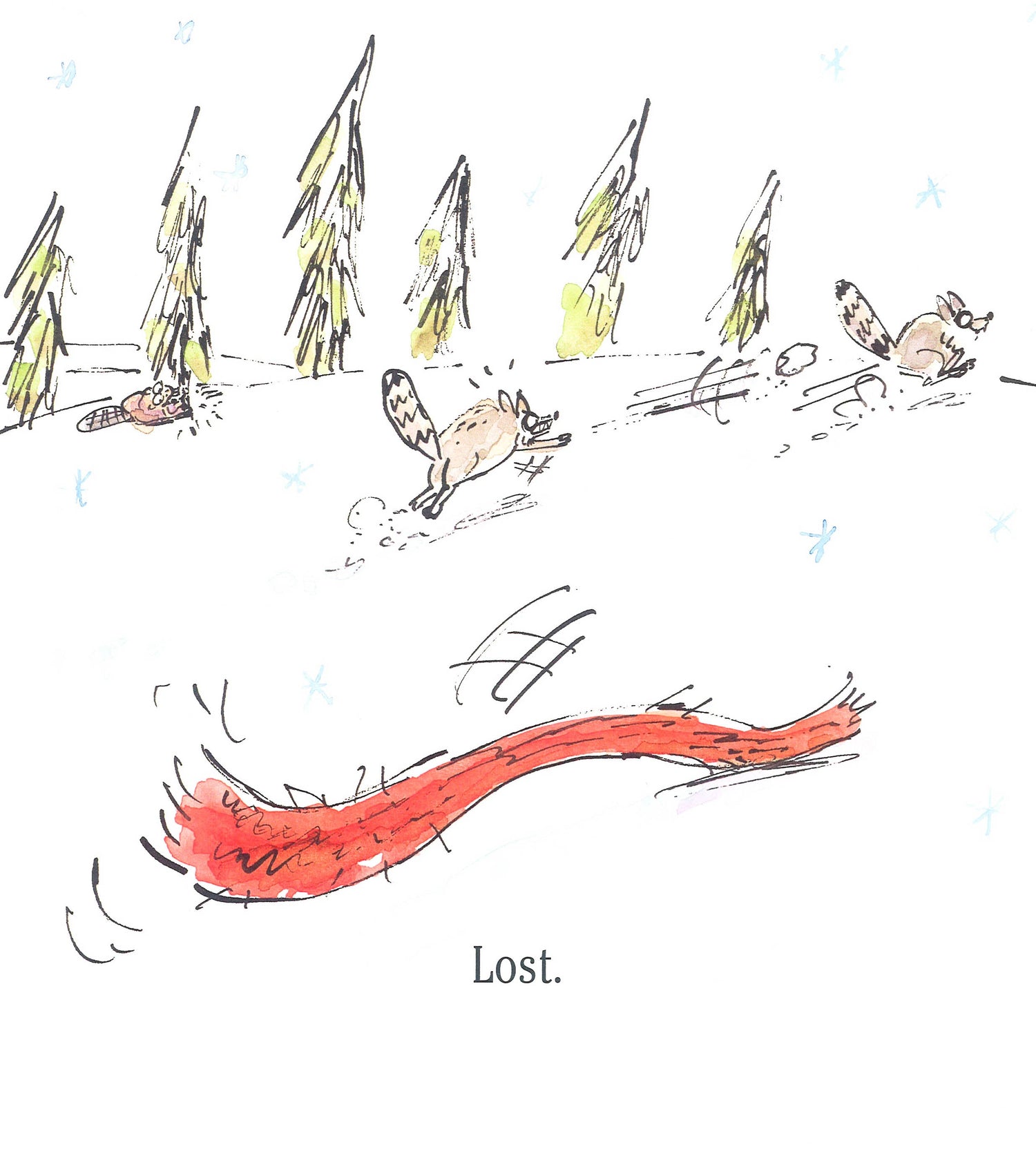 On a cold day, a bear loses his soft red scarf. The wind carries it *whoosh* to a couple of playful raccoons who find it and use it to play tug-o-war. Once they run off, the scarf is abandoned until a woodchuck finds it and decides it will make the perfect warm hat. It gets stuck on a tree branch only to be found and lost again by a fox, a mouse and s a couple of squirrels among others. When all the animals lay claim to the scarf, calamity ensues that can only be fixed by a bear, a little patience, and friendship in this nearly wordless, clever picture book.