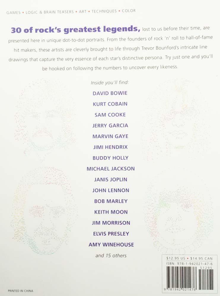 Music fans will enjoy watching the beloved faces of these lost icons emerge as they complete the puzzle. The book includes 30 rock 'n' roll idols, such as John Lennon, Prince, David Bowie, Freddie Mercury, Kurt Cobain, Janis Joplin and Amy Winehouse. Then, after all the dots are connected, fans can colour the picture! Each page is single-sided and perforated for easy removal, and the book comes in an attractive large format.