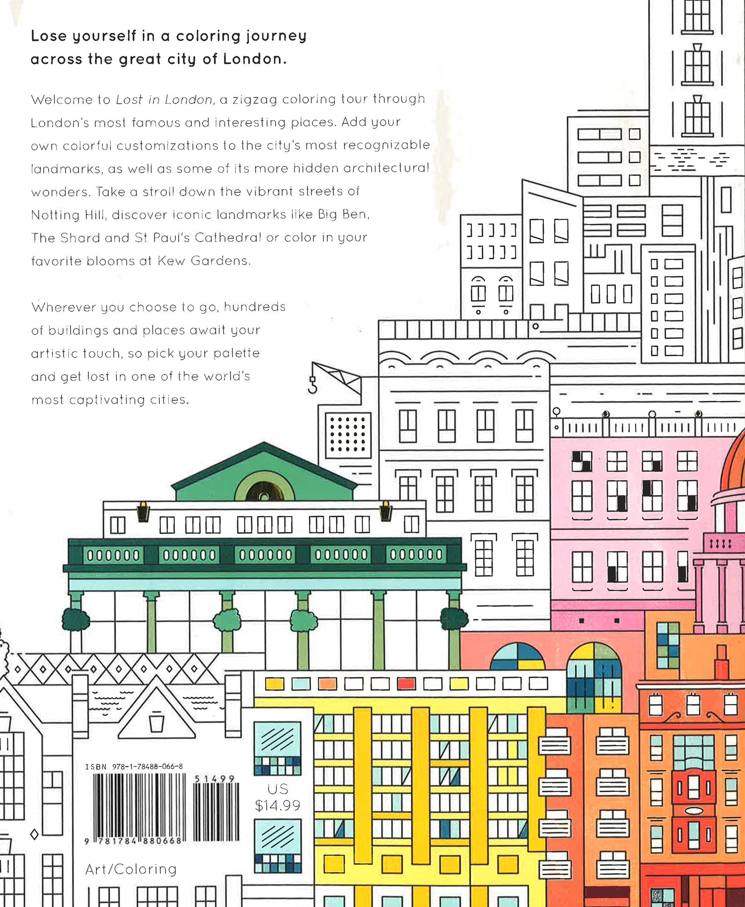 Get your digital detox by meandering through the streets of London With highly detailed, graphic images of the landmarks of one of the world's most exciting cities, this is a novel way to take a tour of London. Take a stroll down Portobello Road, discover famous attractions including Big Ben and The London Eye, and color in your favorite blooms at Columbia Road Flower Market. As well as top historic and cultural attractions, this insider book reveals lesser-known areas and London's leafy escapes and green spaces. Every building has its own character and its own story to tell. Fun facts and quotes about each destination are included alongside the incredibly detailed line drawings that are designed to help you to immerse yourself in London's story as you color.
