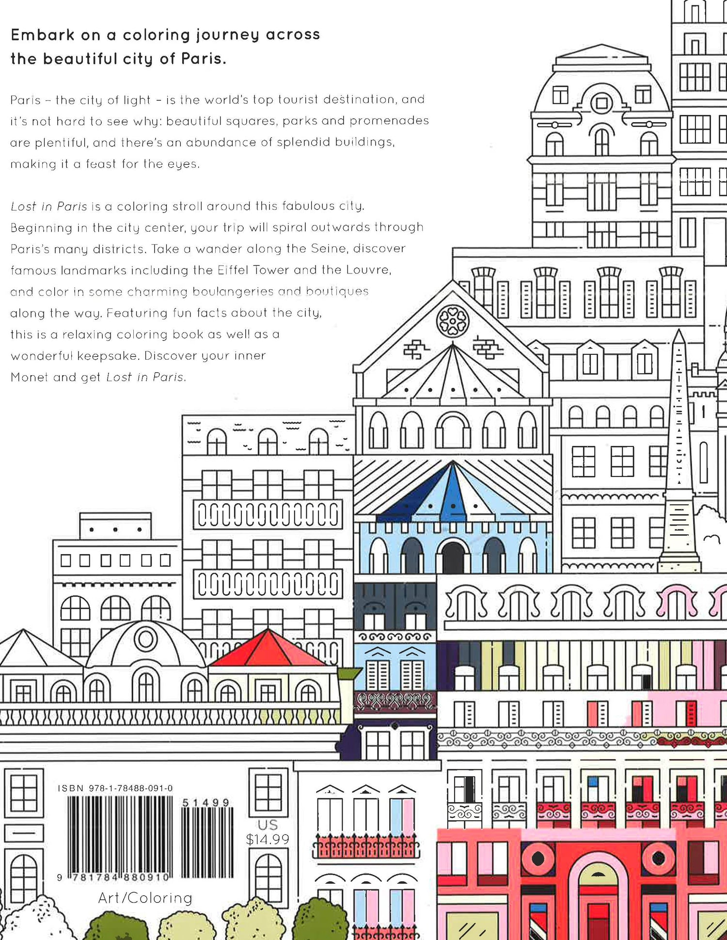 Paris - the city of light - is the world's top tourist destination, and it's not hard to see why: beautiful squares, parks, and promenades are plentiful, and there's an abundance of splendid buildings, making it a feast for the eyes. From the Bibliothèque Sainte Geneviève, to the more modern architecture such as Maison Européenne de la Photographie, the skyline is mixed, giving Paris a wonderful, unique personality. Lost in Paris is a coloring-in stroll around this fabulous city. Featuring fun facts and quotes about the city alongside the illustrations, this is a relaxing coloring book as well as a wonderful keepsake. Take a wander along the Seine, discover famous landmarks including the Eiffel Tower and the Louvre, and color in come charming boulangeries and boutiques along the way. Paris is one of the world's most romantic, beautiful cities, and in Lost in Paris you will travel to the most well-known places, as well as some hidden gems, waiting to be brought to life. So whether you're looking for a digital detox, to relax, meditate, or just feel like some therapeutic coloring, this special book is the perfect escape.