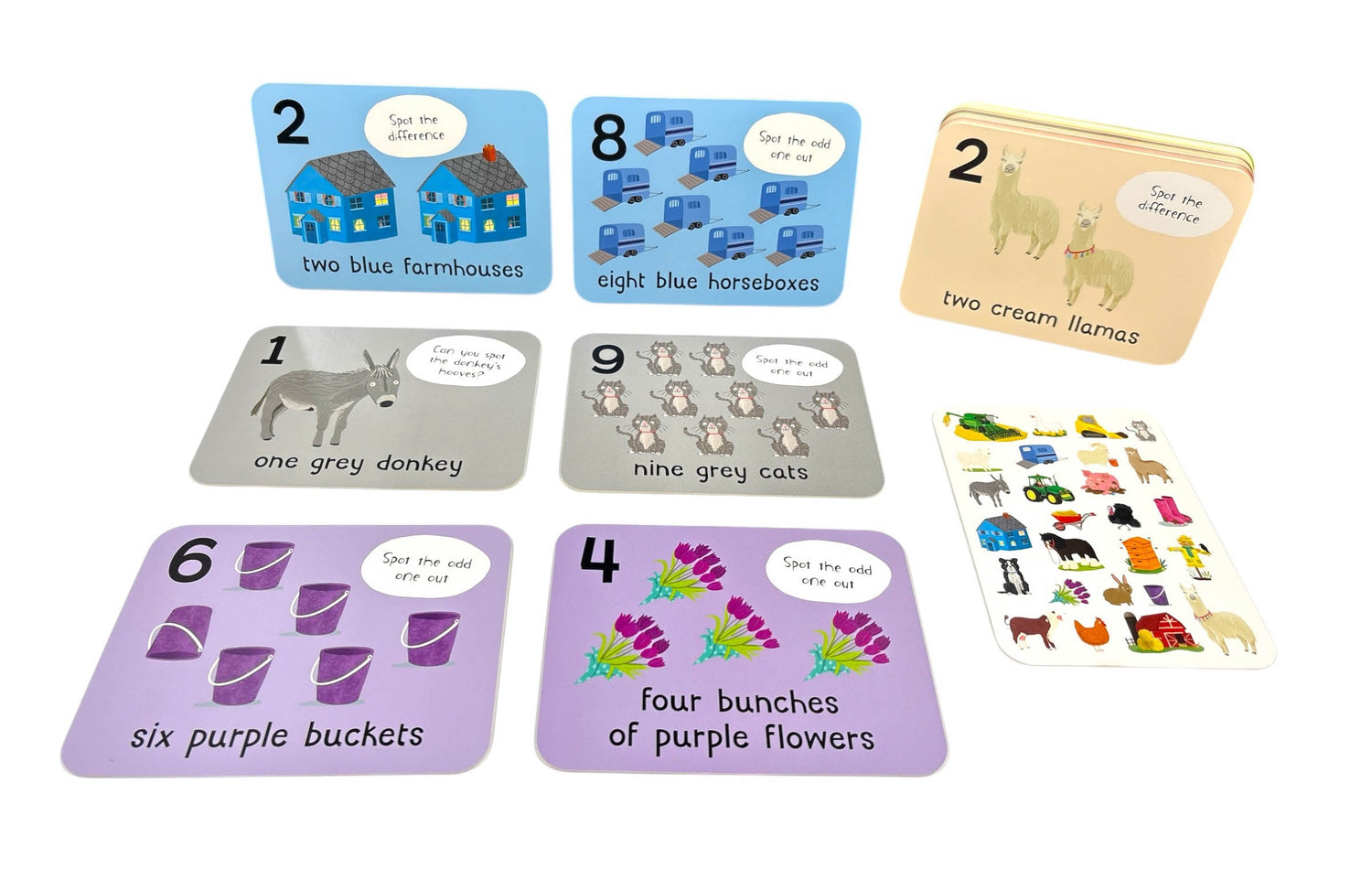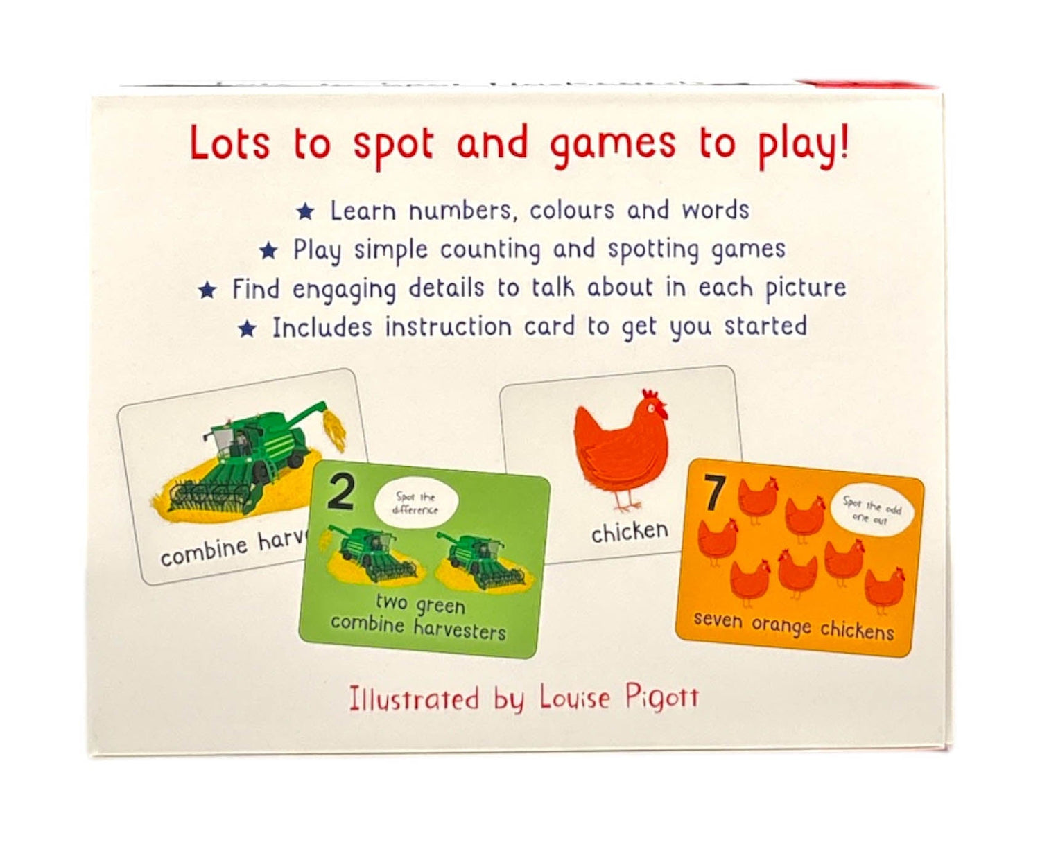 This captivating set of double-sided flashcards is designed to engage young children as they learn numbers, colours and simple words of recognisable animals and machines found on the farm. The bold illustrations encourage learning through playing games and having fun. The durable cards are perfect for use at home and while travelling.