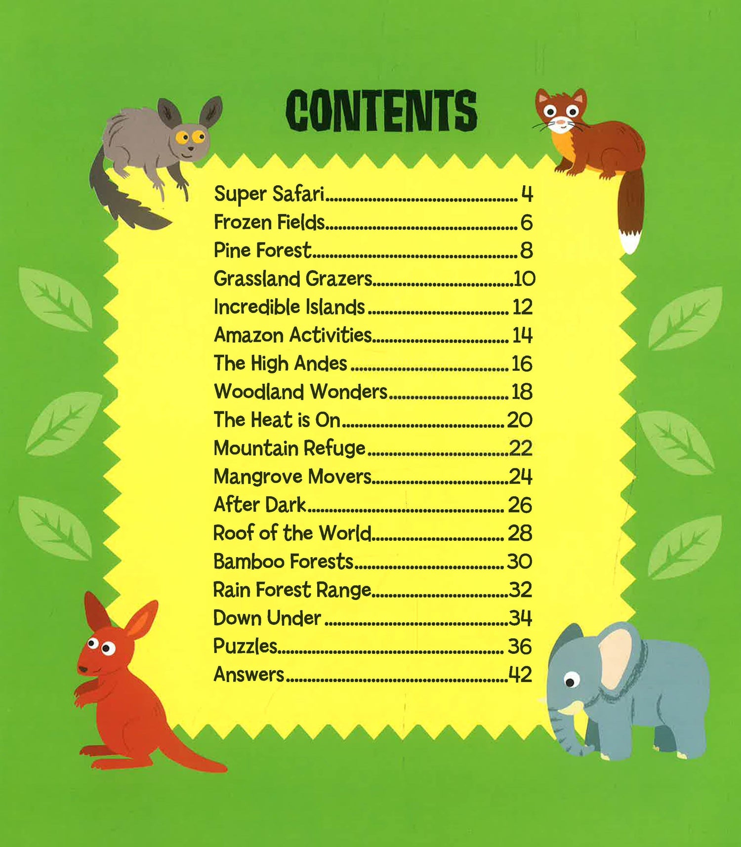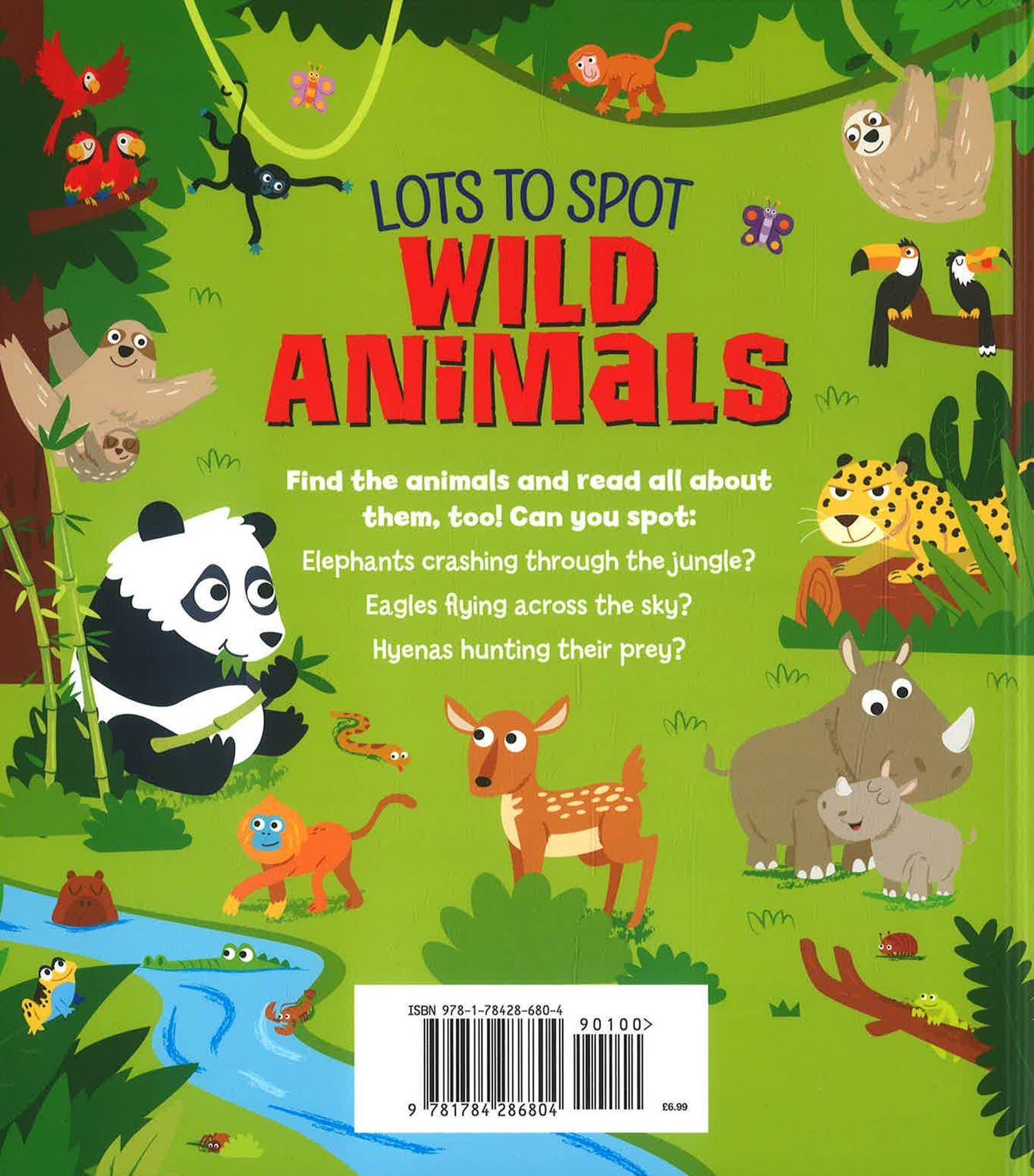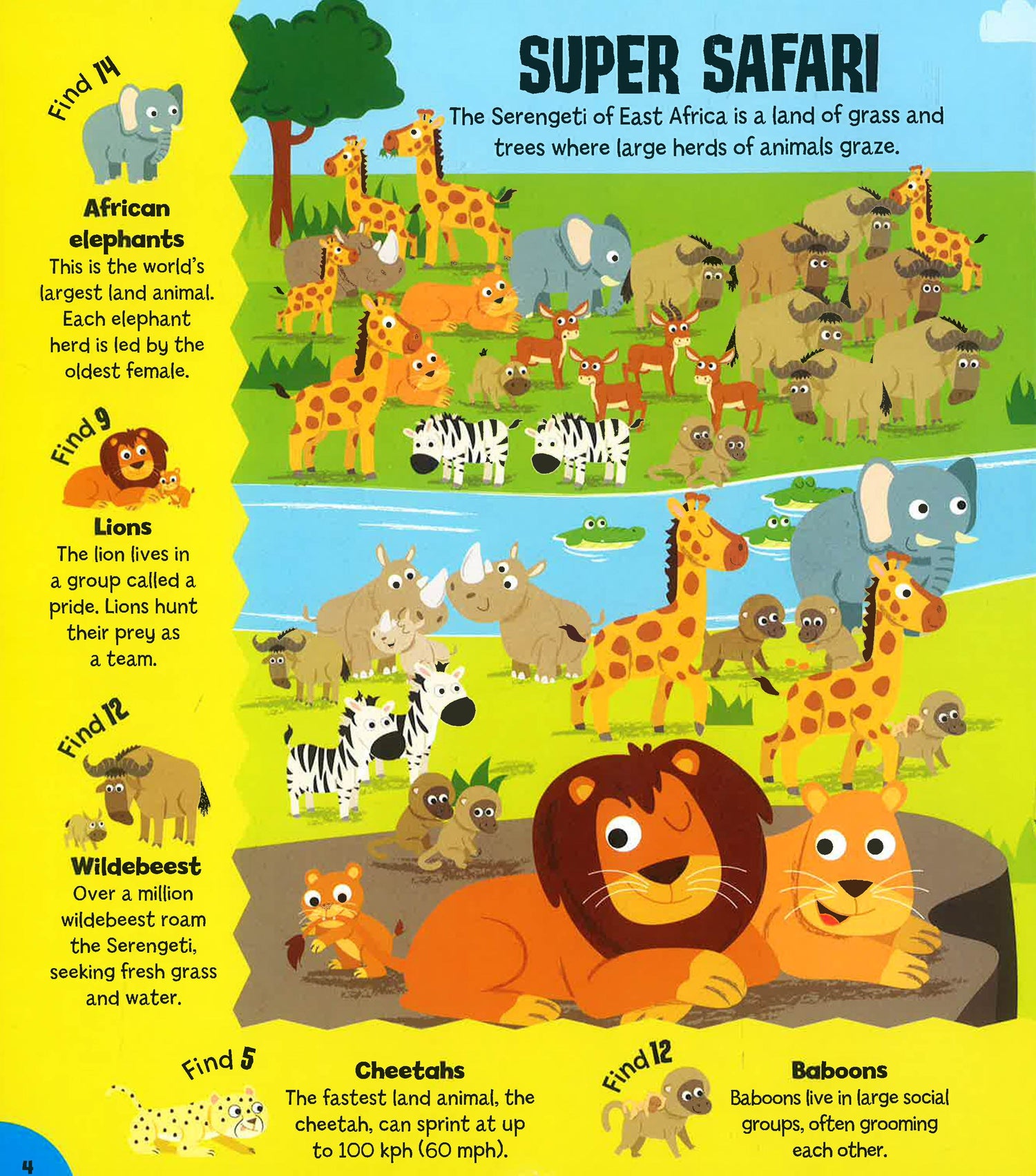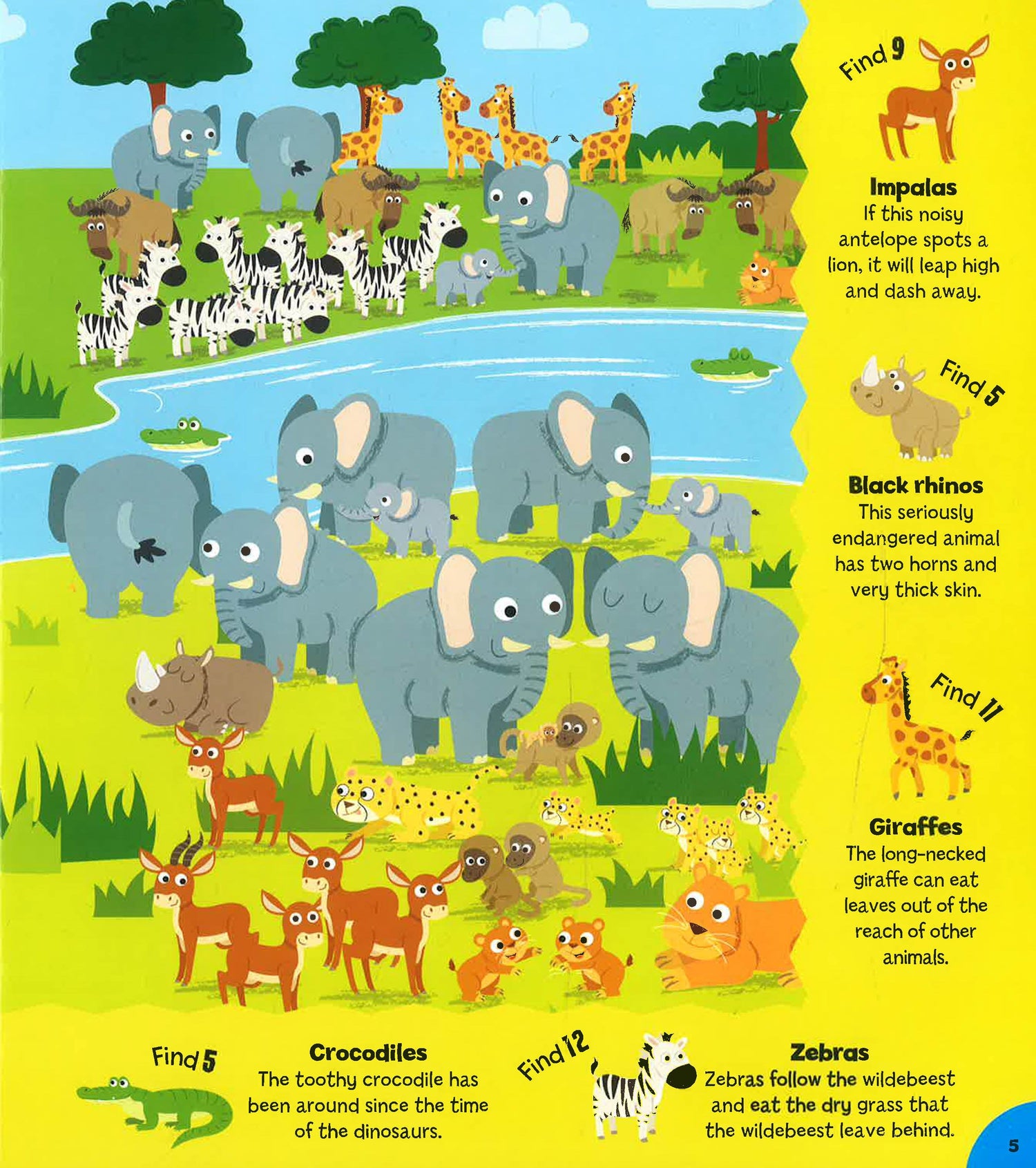 Find the animals and read all about them, too! Can you spot: Elephants crashing through the jungle Eagles flying across the sky Hyenas hunting their prey