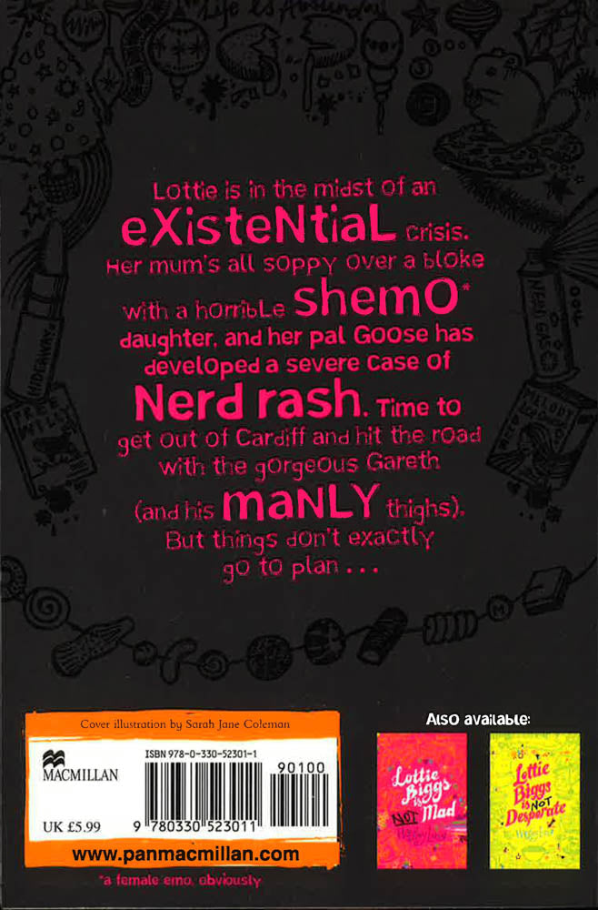 I think therefore I am, and it's about time I stopped being so ridiculously ridonkulous . . .I think therefore I am, and it's about time I stopped being so ridiculously ridonkulous . . . The final book in this heart-achingly honest and utterly hilarious series - about the life of a teenage girl and so much more. Now with a new cover look. Just when things were starting to look up for Lottie her life's gone a bit pear-shaped, wonk-ways and downside up again. Her mum's all soppy over a bloke with a horrible shemo* daughter, her best pal Goose has disappeared in a cloud of nerd-gas and Lottie's in the midst of an existential crisis. There's only one thing to do - get the hell out of Cardiff and go on the road with the gorgeous Gareth Stingecombe (and his manly thighs). But things don't go to plan, and Lottie starts to realise she might have been a bit me me me lately. . . *a female emo, obviously The wit of Louise Rennison meets the depth of Jacqueline Wilson.