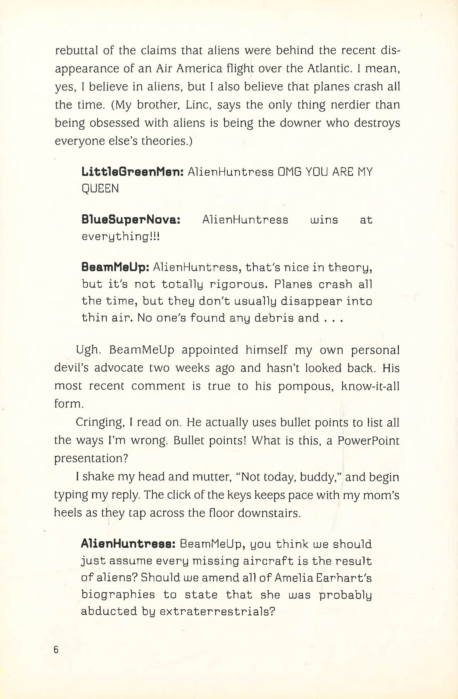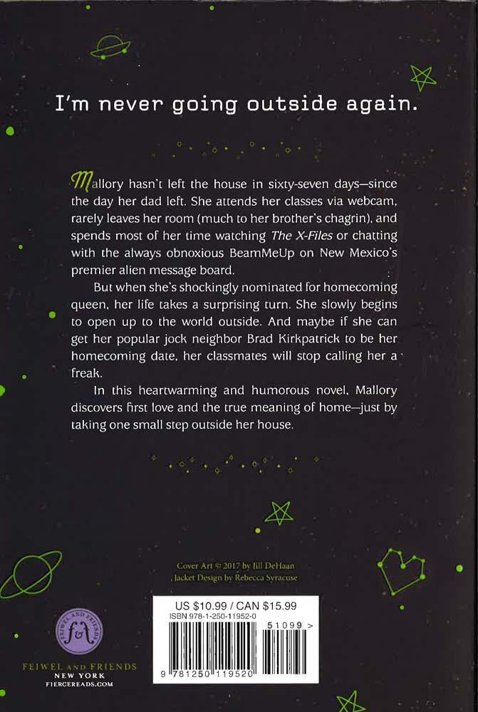 Mallory hasn't left the house in sixty-seven days--since the day her dad left. She attends her classes via webcam, rarely leaves her room (much to her brother's chagrin), and spends most of her time watching The X-Files or chatting with the always obnoxious BeamMeUp on New Mexico's premier alien message board. But when she's shockingly nominated for homecoming queen, her life takes a surprising turn. She slowly begins to open up to the world outside. And maybe if she can get her popular jock neighbor Brad Kirkpatrick to be her homecoming date, her classmates will stop calling her a freak. In this heartwarming and humorous debut, Mallory discovers first love and the true meaning of home--just by taking one small step outside her house.