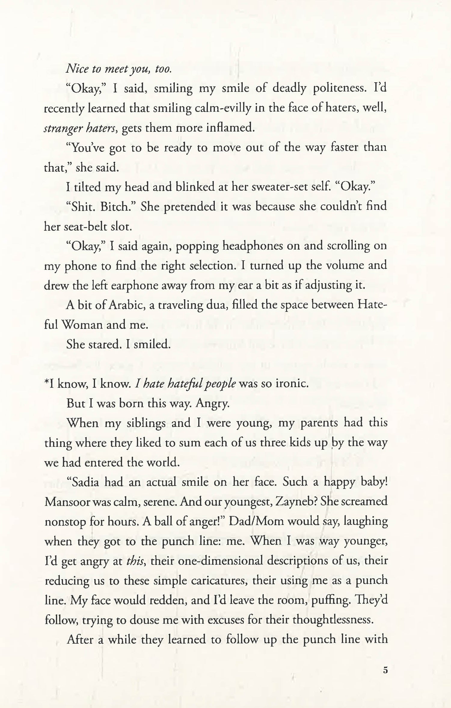 An oddity: whatever gives you pause. Like the fact that there are hateful people in the world. Like Zayneb’s teacher, who won’t stop reminding the class how “bad” Muslims are.