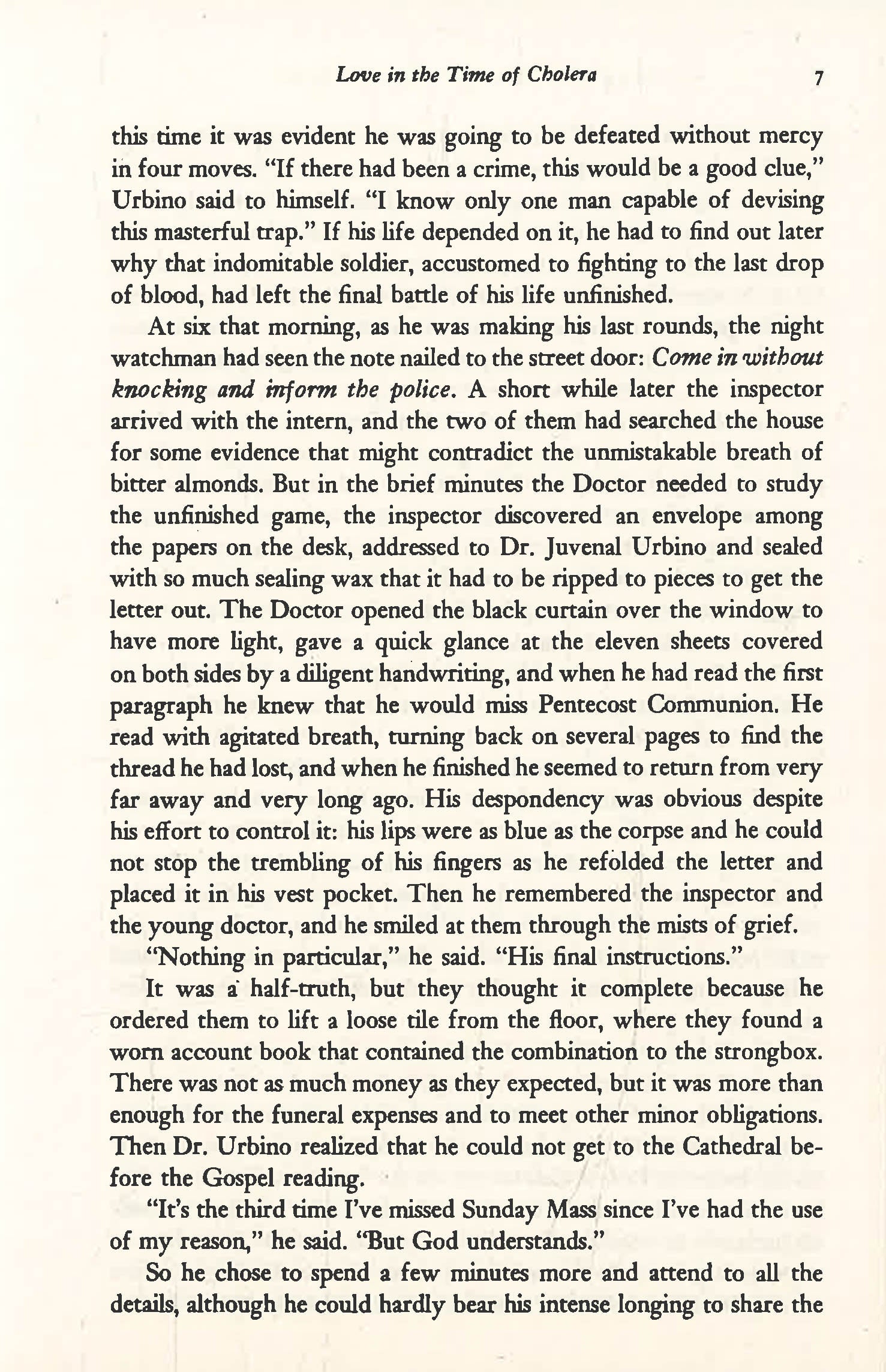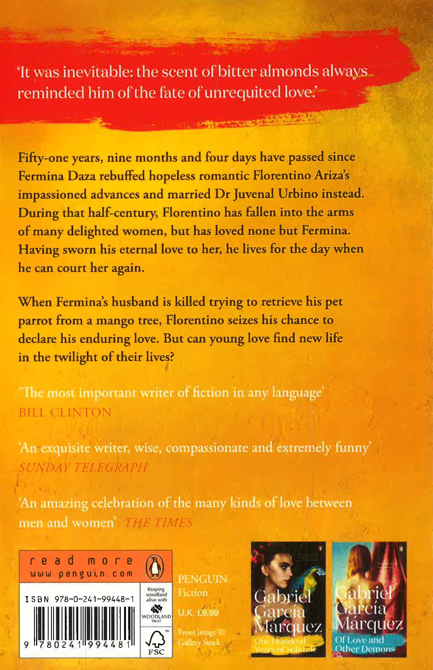 Fifty-one years, nine months and four days have passed since Fermina Daza rebuffed hopeless romantic Florentino Ariza's impassioned advances and married Dr. Juvenal Urbino instead. During that half-century, Flornetino has fallen into the arms of many delighted women, but has loved none but Fermina.