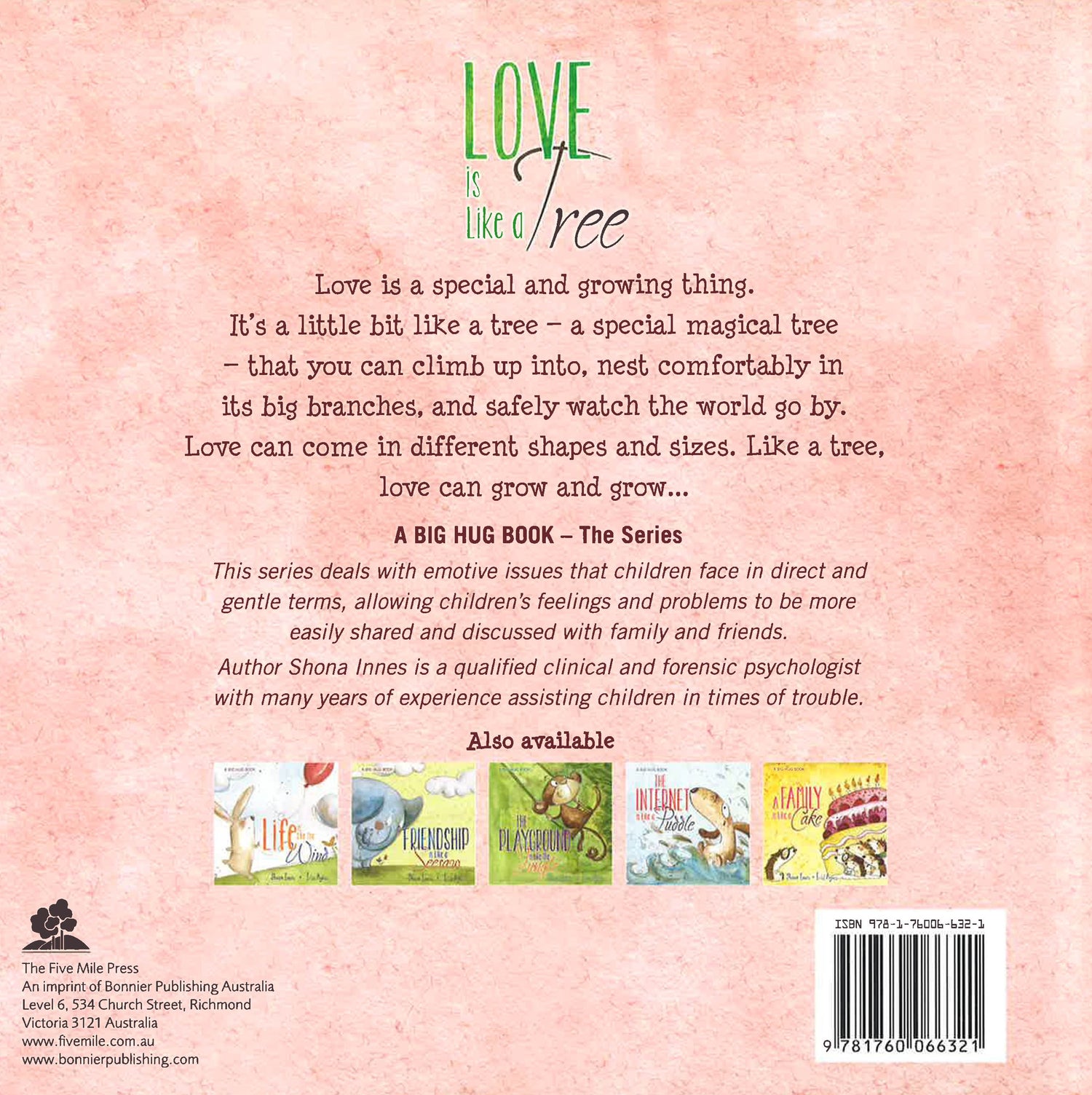 Love is a special and growing thing. It's a little bit like a tree a special magical tree that you can climb up into, nest comfortably in its big branches, and safely watch the world go by. Love can come in different shapes and sizes. Like a tree, love can grow and grow. The Big Hug books grew out of letters sent to children and their families after their psychology sessions.