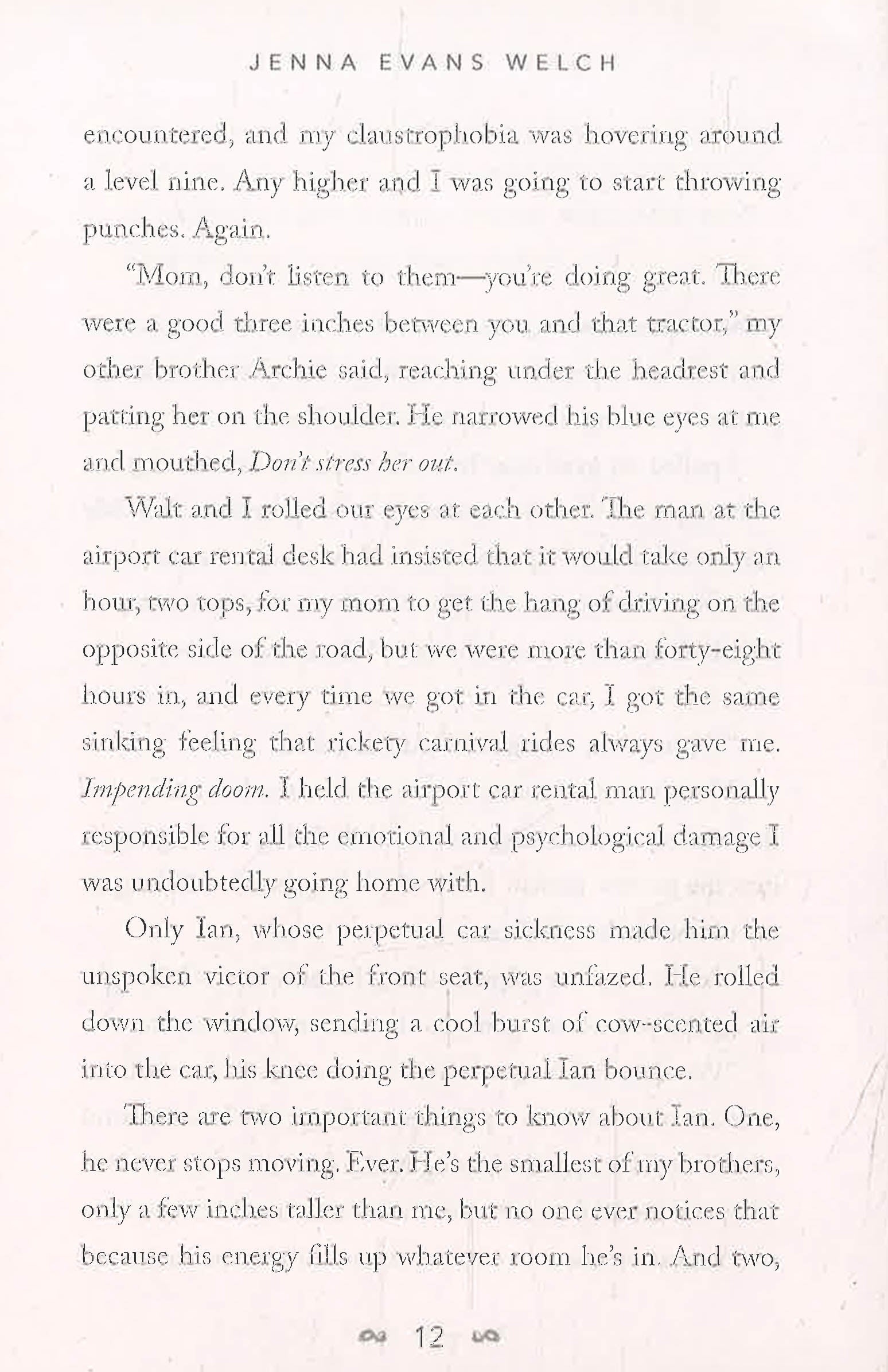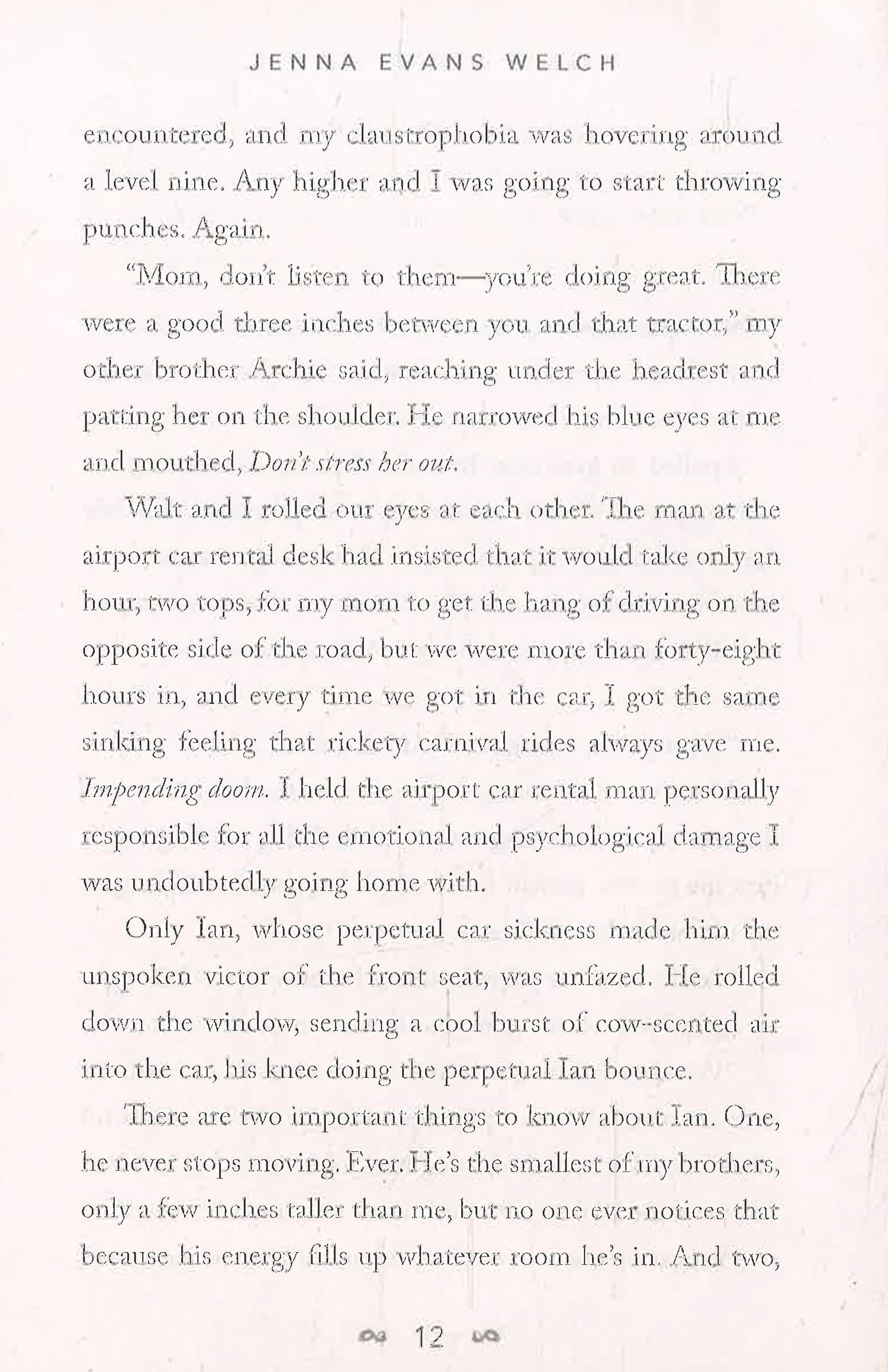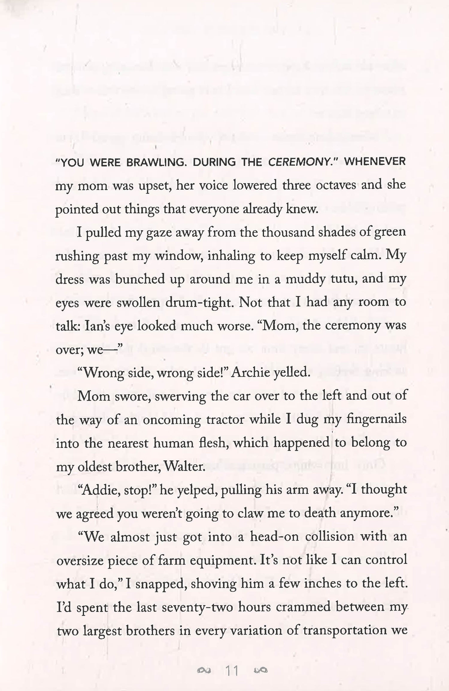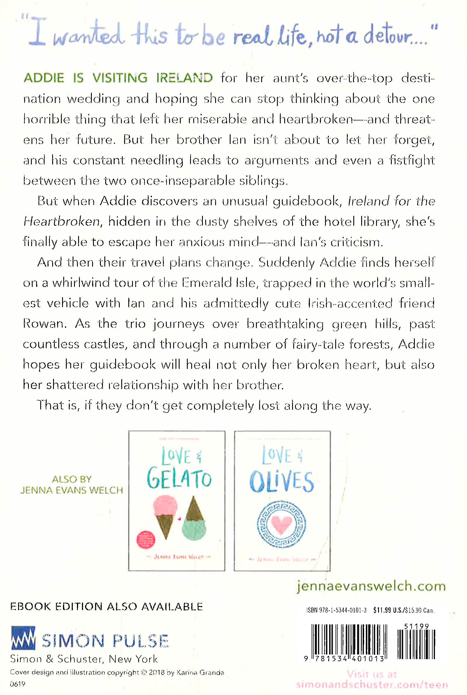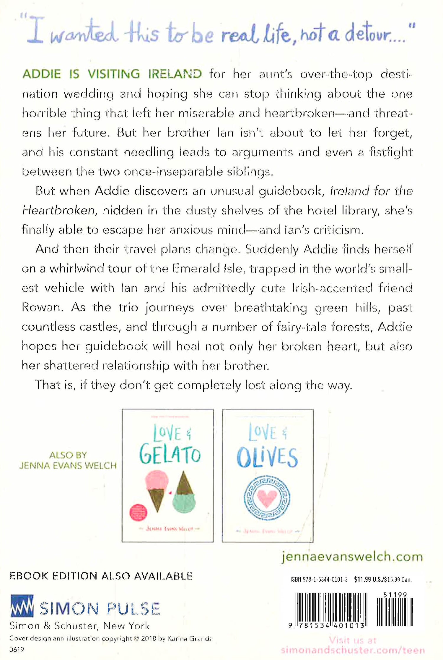 And then their travel plans change. Suddenly Addie finds herself on a whirlwind tour of the Emerald Isle, trapped in the world’s smallest vehicle with Ian and his admittedly cute, Irish-accented friend Rowan. As the trio journeys over breathtaking green hills, past countless castles, and through a number of fairy-tale forests, Addie hopes her guidebook will heal not only her broken heart, but also her shattered relationship with her brother.
