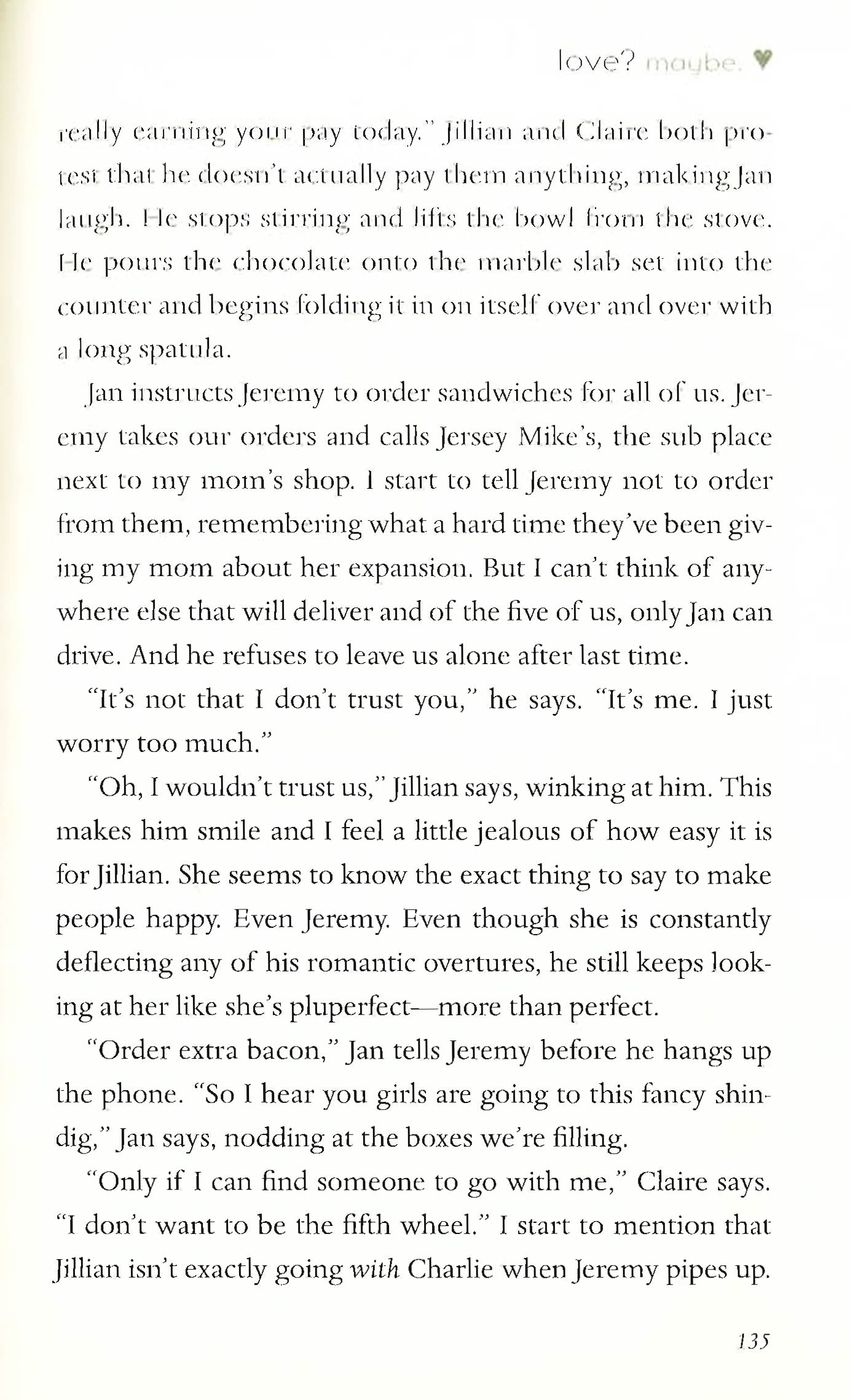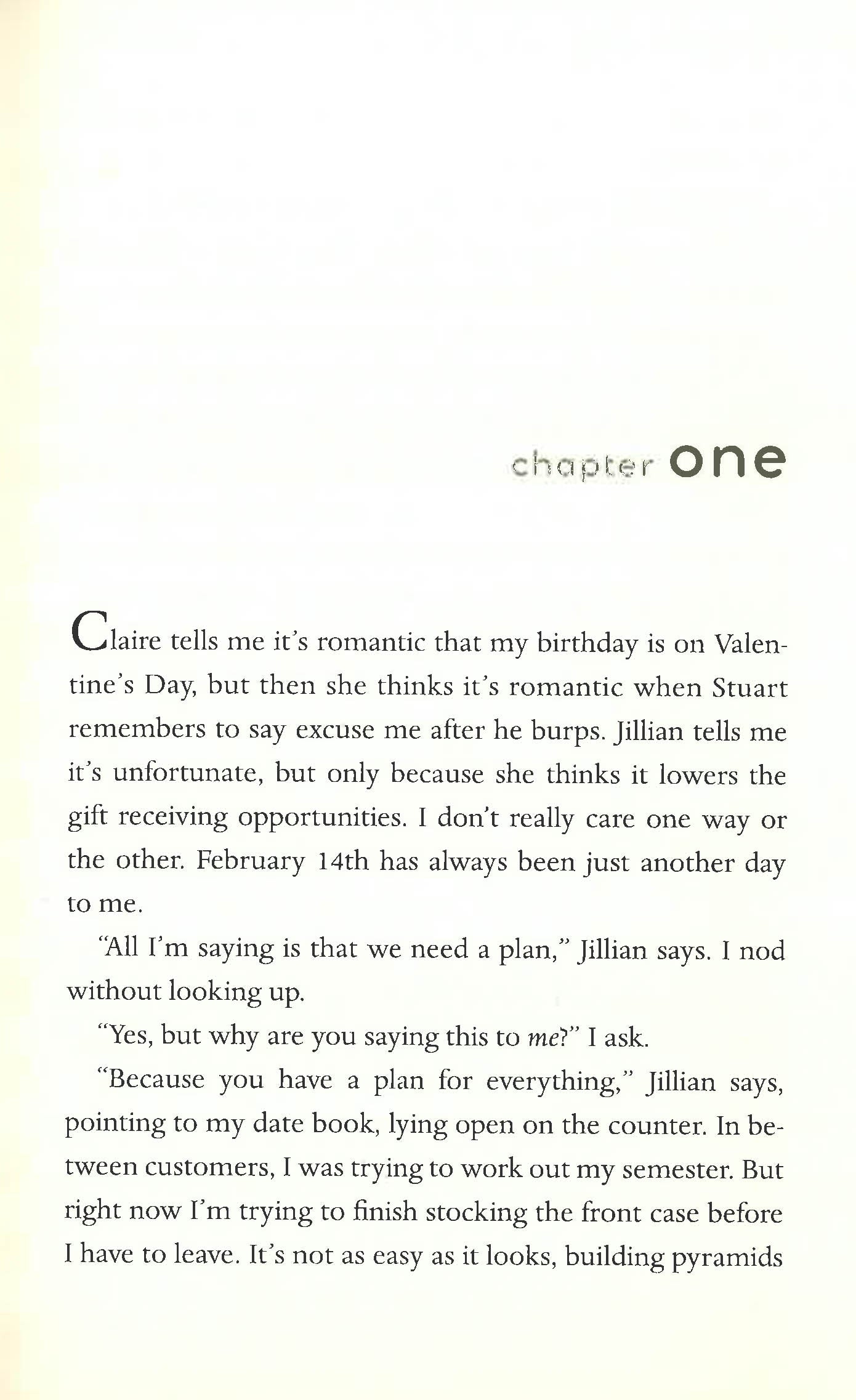 Just because Piper's birthday is on Valentine's Day does not mean she's a romantic. In fact, after watching her father and then her stepfather leave, she's pretty sure she doesn't believe in love at all. Then her friends concoct a plan to find them all Valentine's dates, and somehow Piper finds herself with the most popular guy in school. But true love never follows a plan, and a string of heartfelt gifts from a secret admirer has Piper wondering if she might be with the wrong guy.