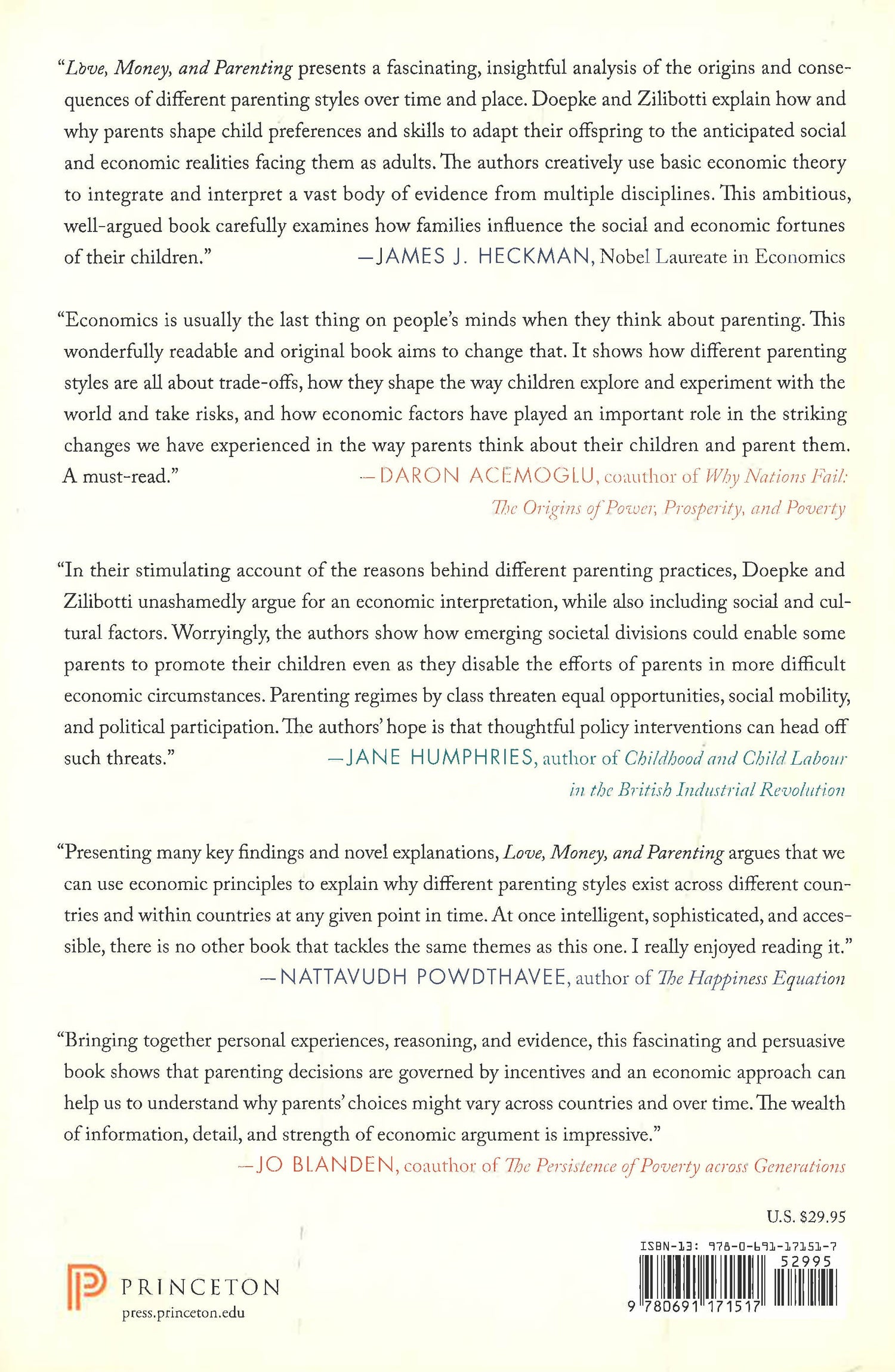 Through personal anecdotes and original research, Doepke and Zilibotti show that in countries with increasing economic inequality, such as the United States, parents push harder to ensure their children have a path to security and success. Economics has transformed the hands-off parenting of the 1960s and ’70s into a frantic, overscheduled activity. Growing inequality has also resulted in an increasing “parenting gap” between richer and poorer families, raising the disturbing prospect of diminished social mobility and fewer opportunities for children from disadvantaged backgrounds. In nations with less economic inequality, such as Sweden, the stakes are less high, and social mobility is not under threat. Doepke and Zilibotti discuss how investments in early childhood development and the design of education systems factor into the parenting equation, and how economics can help shape policies that will contribute to the ideal of equal opportunity for all.