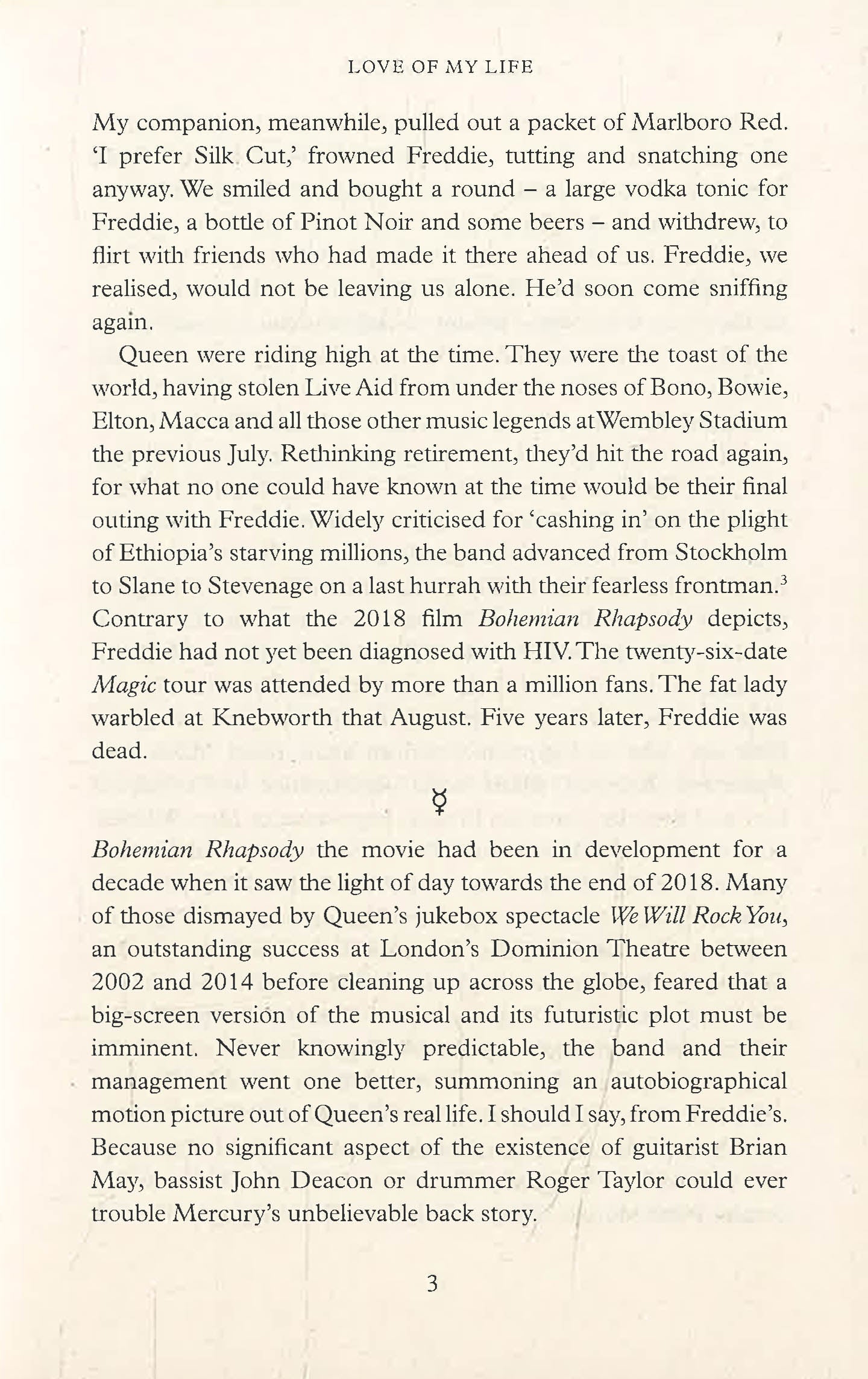 In Love of My Life, the author follows him through his obsessions with former shop girl Mary, German actress Barbara Valentin and Irish-born barber boyfriend Jim Hutton. She explores his adoration of globally fêted Spanish soprano Montserrat Caballé. She delves into his intimate friendship with Elton John, and probes his imperishable bonds with his fellow band members. She deconstructs his complicated relationship with the 'food of love' - his music - and examines closely his voracious appetite for - what some would call his fatal addiction to - sex. Which of these was the real love of Freddie Mercury's life? Was any of them?