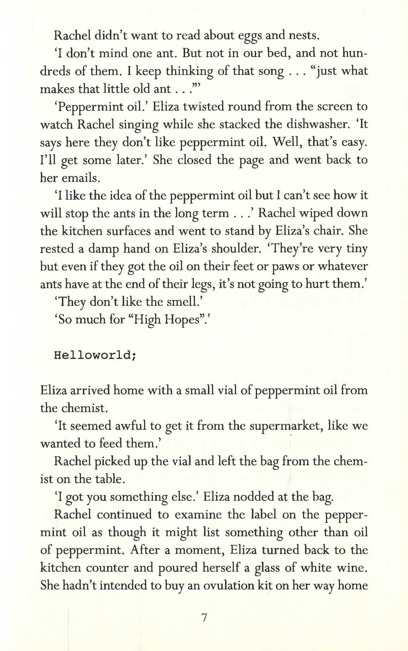 Rachel and Eliza are planning their future together. One night in bed Rachel wakes up terrified and tells Eliza that an ant has crawled into her eye and is stuck there. Rachel is certain; Eliza, a scientist, is sceptical. Suddenly their entire relationship is called into question. What follows is a uniquely imaginitive sequence of interlinked stories ranging across time, place and perspective to form a sparkling philosophical tale of love, lost and found across the universe.