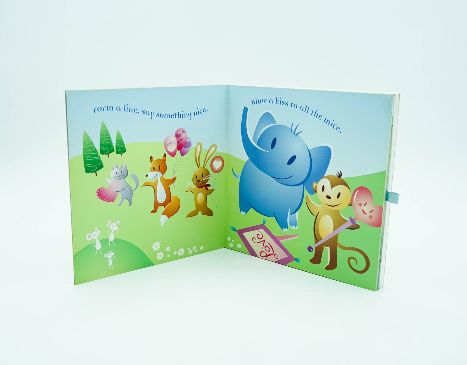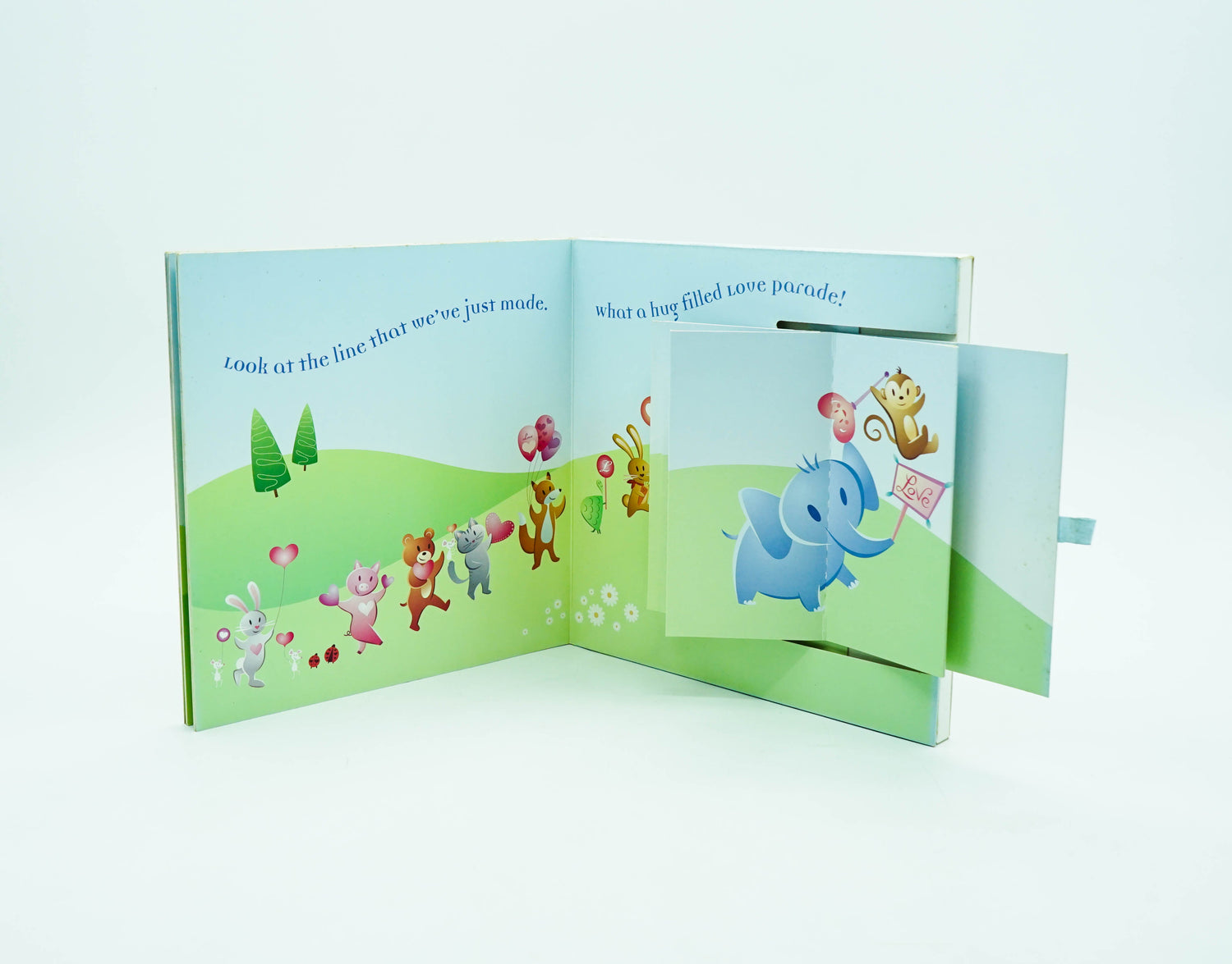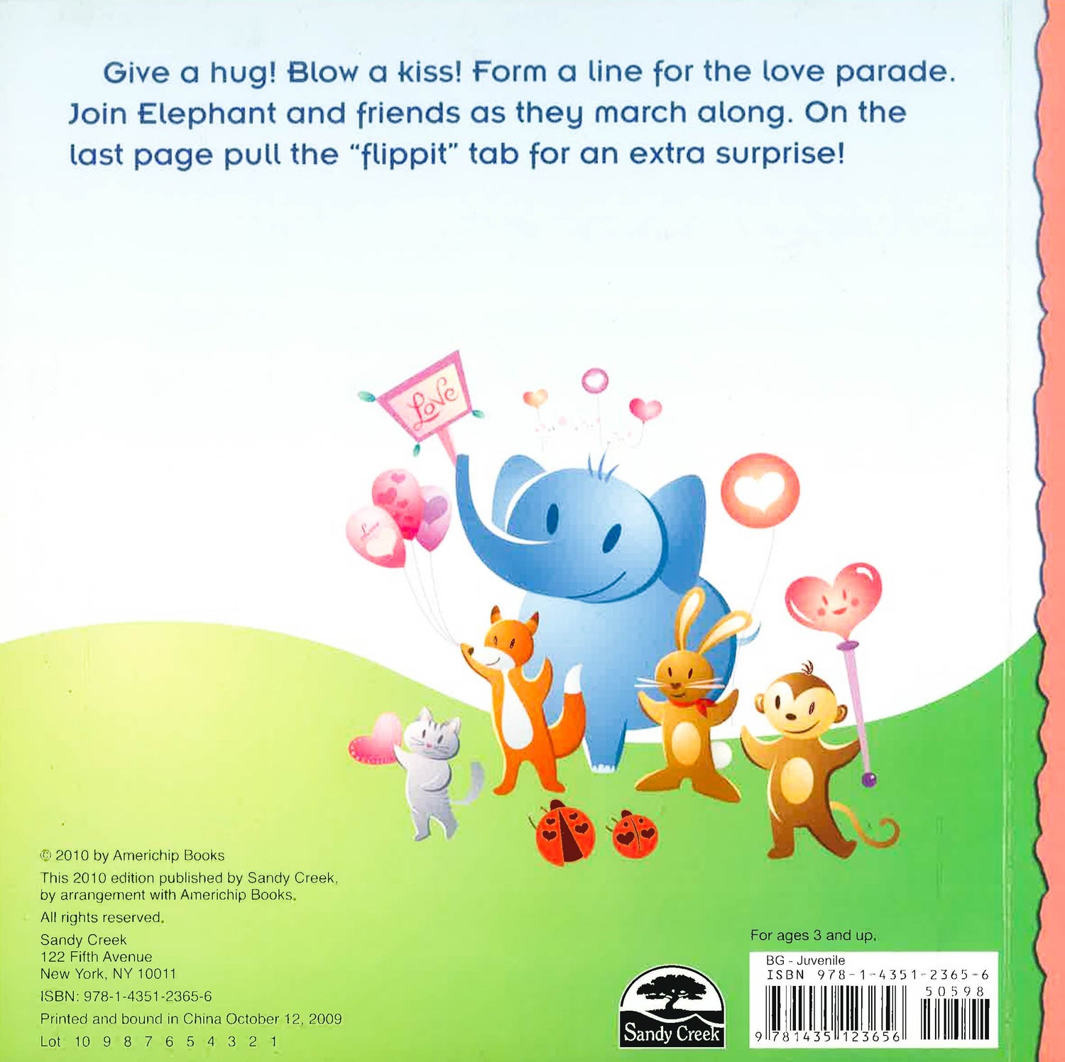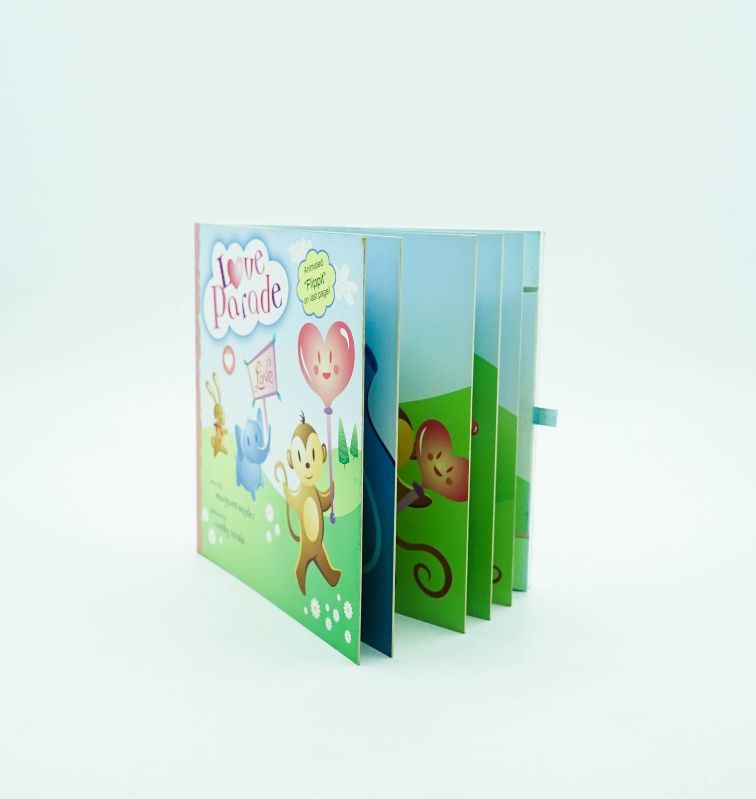 Give a hug! Blow a kiss! From a line for the love parade. Join elephant and friens as they march along. On the last page pull the "flippit" tab for an extra surprise!