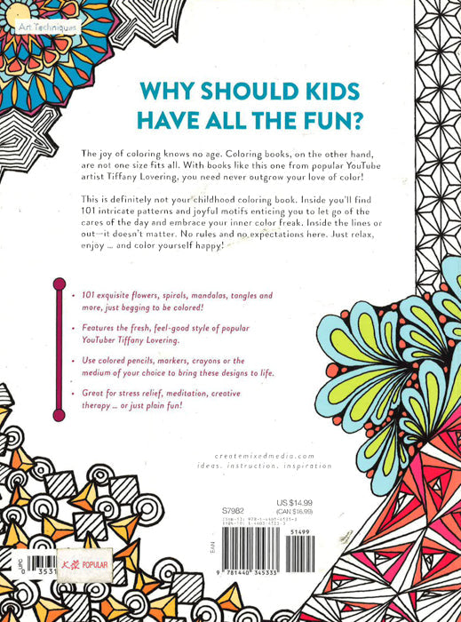 Why should kids have all the fun? The joy of coloring knows no age. Coloring books, on the other hand, are not one size fits all. With books like this one from popular YouTube artist Tiffany Lovering, you need never outgrow your love of color! This is definitely not your childhood coloring book. Inside you'll find 101 intricate patterns and joyful motifs enticing you to let go of the cares of the day and embrace your inner color freak. Inside the lines or out--it doesn't matter. No rules and no expectations here. Just relax, enjoy...and color yourself happy! 101 exquisite flowers, spirals, mandalas, tangles and more, just begging to be colored! Features the fresh, feel-good style of popular YouTuber Tiffany Lovering. Use colored pencils, markers, crayons or the medium of your choice to bring these designs to life. Great for stress relief, meditation, creative therapy...or just plain fun!