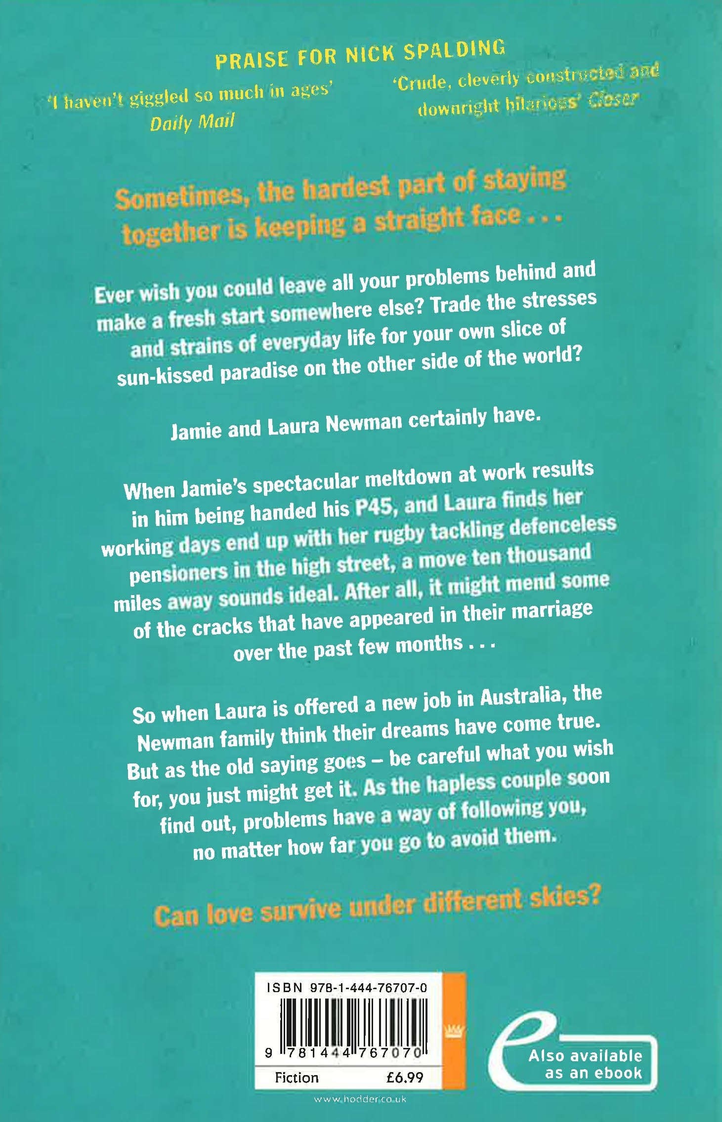 Sometimes, the hardest part of staying together is keeping a straight face...Ever wish you could leave all your problems behind and make a fresh start somewhere else? Trade the stresses and strains of everyday life for your own slice of sun-kissed paradise on the other side of the world? Jamie and Laura Newman certainly have. When Jamie's spectacular meltdown at work results in him being handed his P45, and Laura finds her working days end up with her rugby tackling defenceless pensioners in the high street, a move ten thousand miles away sounds ideal. After all, it might mend some of the cracks that have appeared in their marriage over the past few months...So when Laura is offered a new job in Australia, the Newman family think their dreams have come true. But as the old saying goes - be careful what you wish for, you might just get it. As the hapless couple soon find out, problems have a way of following you, no matter how far you go to avoid them. Can love survive under different skies?