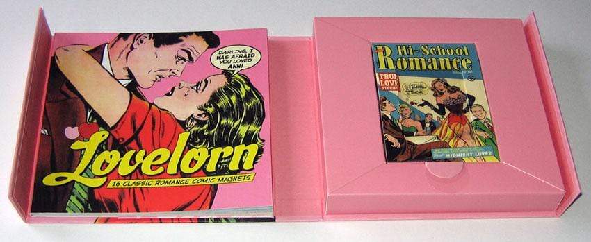 This pack of ! wondrously camp fridge magnets celebrates the Golden Age of romance comics, and is guaranteed to add a romantic sparkle to any kitschen! American romance comics reached their peak in the...fs with over EURO different titles on the shelves every month, many of them selling over one million copies per issue! This unique pack revels in that era. Each magnet features a single cover that tells a bodice-ripping, heart warming, heartbreaking, or steamy, passionate tale whether they're Exotic Romances, Confessions of the Lovelorn, Untamed Love or the girl who sinned in secret and paid in public. The accompanying EURO-page book provides a brief history of American romance comics and background stories for each magnet. Whether they're unlucky in love, or happily settled with the one, Lovelorn is the perfect gift for all fans of comics; pop culture kitsch; and hopeless romantics everywhere.