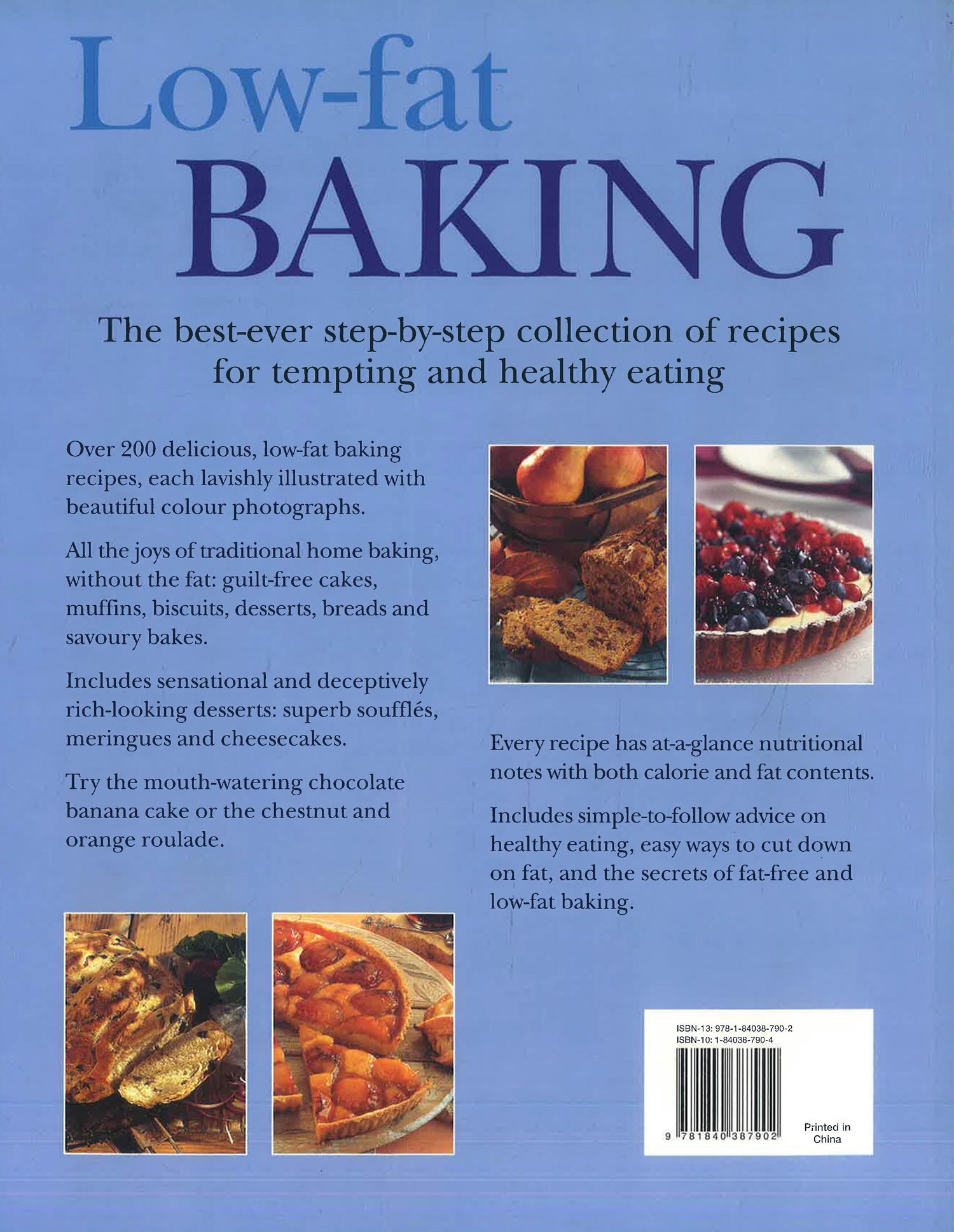 All the joys of traditional home-baking without the fat: guilt-free cakes, cookies, desserts and breads. Nothing equals the satisfaction of home baking, with the enticing aromas that fill the house and the pride of having created such wonderful goodies yourself. Rediscover the pleasures and rewards of home baking with this delicious selection of healthy, low-fat cakes and baked goods. From best-loved classics to modern twists, this bumper recipe collection contains low-fat or no-fat baking recipes for every occasion. Try Lemon Chiffon Cake, Strawberry Roulade, Carrot Muffins, Drop Scones, French Bread, Onion Focaccia, Sweet Sesame Loaf or Filo Fruit Baskets. There are also sensational and deceptively rich-looking desserts: superb soufflés, meringues and cheesecakes. With plenty of tips on using low-fat ingredients, this collection of recipes can be enjoyed without guilt. Over 200 delicious recipes are lavishly illustrated with beautiful photographs. Every recipe has at-a-glance nutritional notes with both calorie and fat contents, and the book includes plenty of simple-to-follow advice on healthy eating, easy ways to cut down on fat, and the secrets of fat-free and low-fat baking.