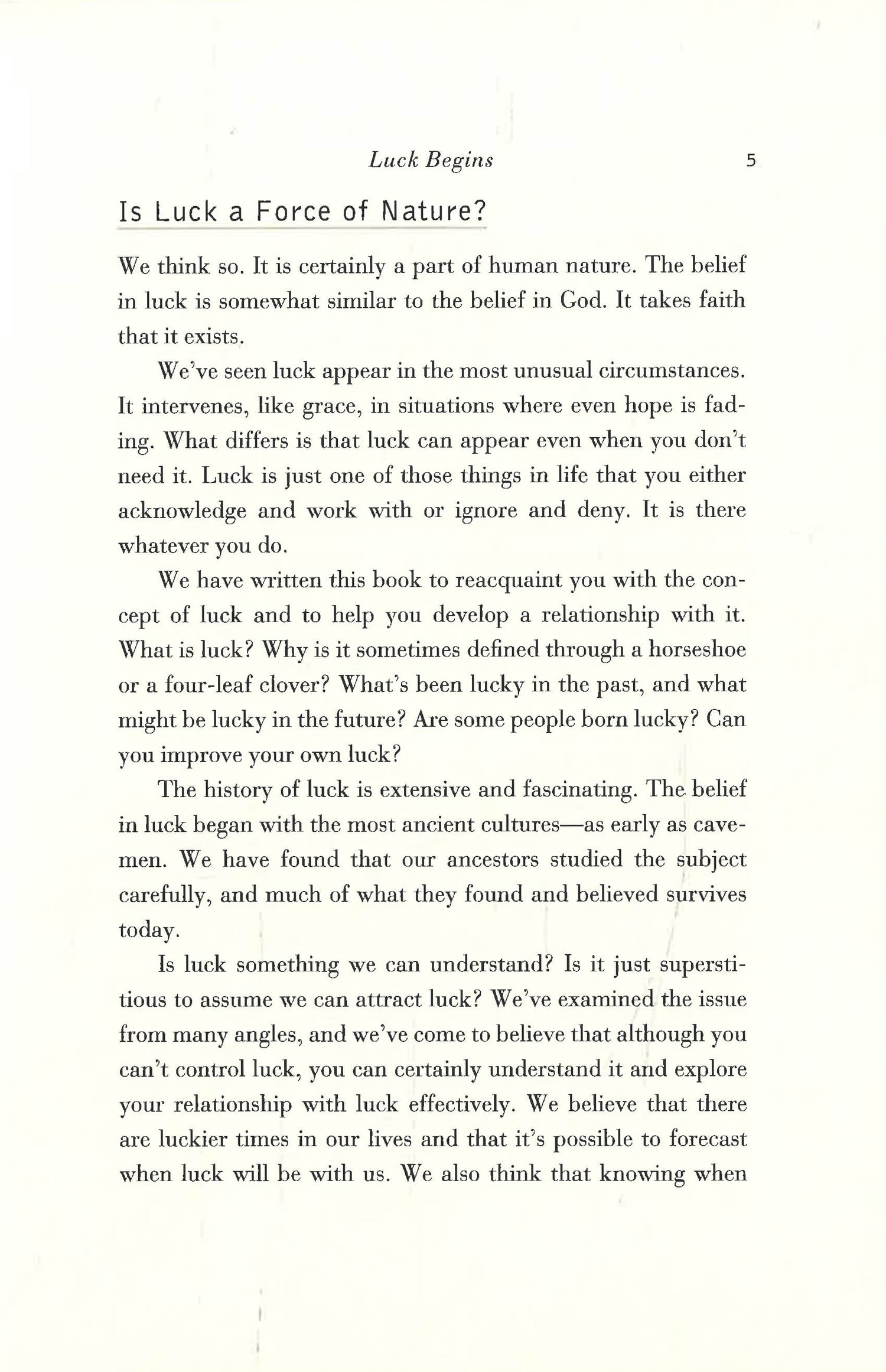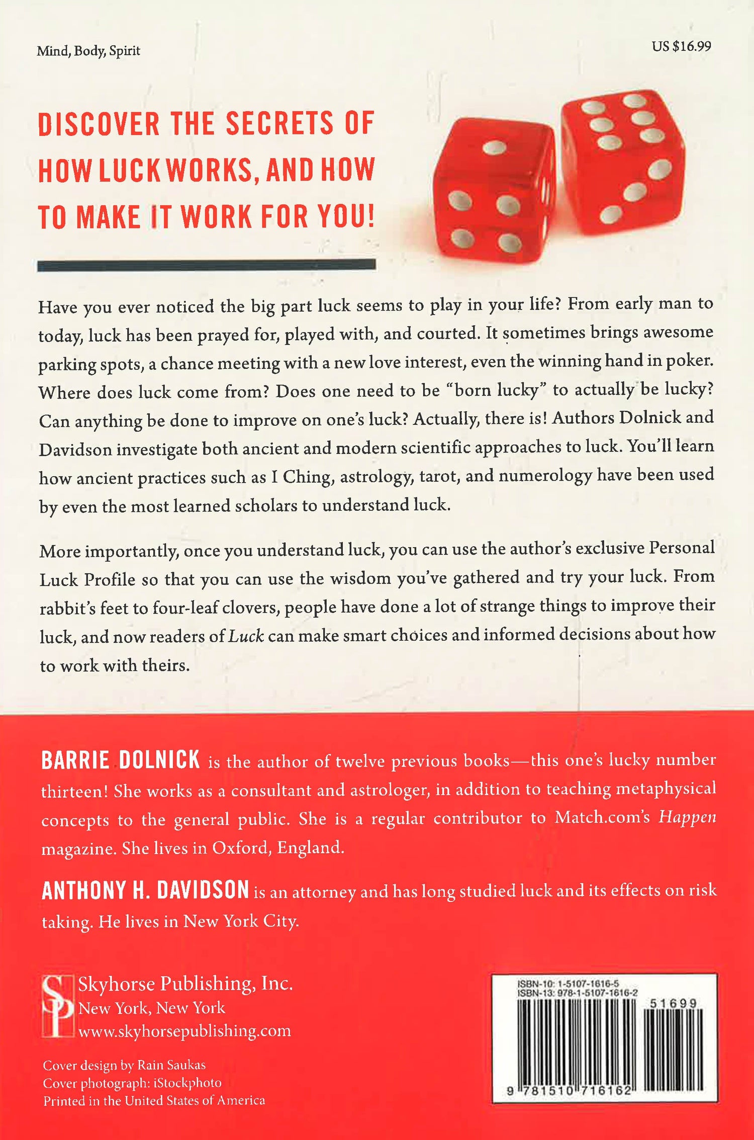 Have you ever noticed the big part luck seems to play in your life? From early man to today, luck has been prayed for, played with, and courted. It sometimes brings awesome parking spots, a chance meeting with a new love interest, even the winning hand in poker. Where does luck come from? Does one need to be "born lucky" to actually be lucky? Can anything be done to improve on one's luck? Actually, there is! Authors Dolnick and Davidson investigate both ancient and modern scientific approaches to luck. You'll learn how ancient practices such as I Ching, astrology, tarot, and numerology have been used by even the most learned scholars to understand luck. More importantly, once you understand luck, you can use the author's exclusive Personal Luck Profile so that you can use the wisdom you've gathered and try your luck. From rabbits feet to four leaf clovers, people have done a lot of strange things to improve their luck, and now readers of Luck can make smart choices and informed decisions about how to work with theirs.