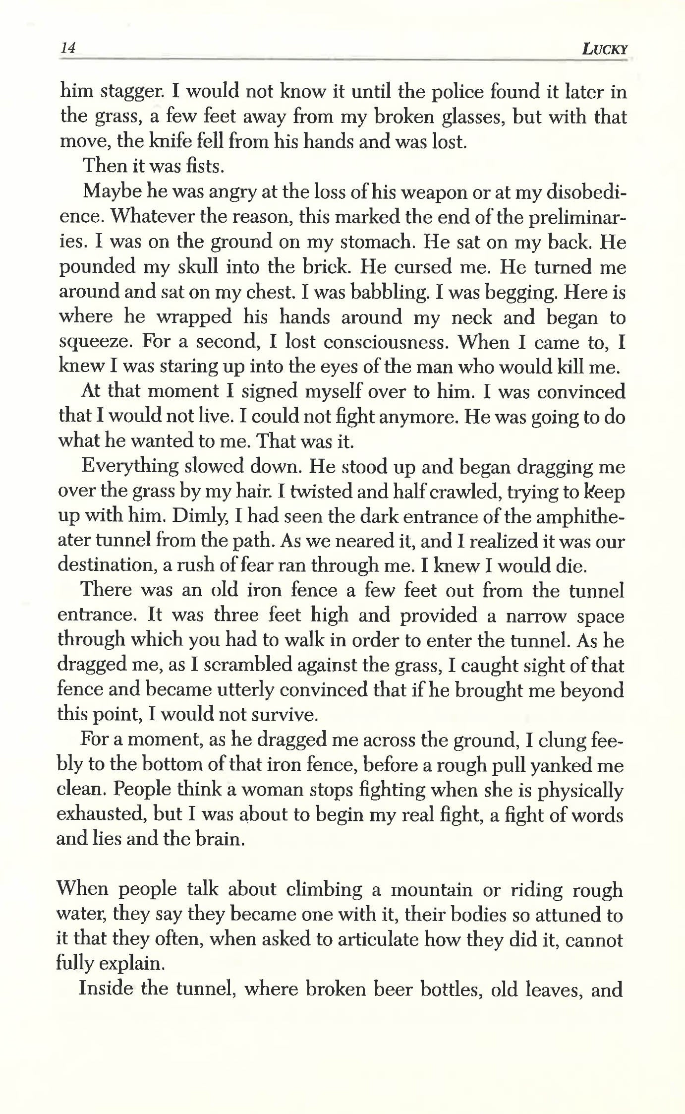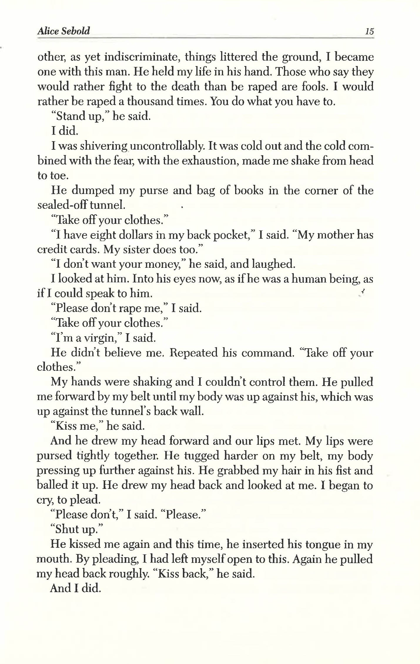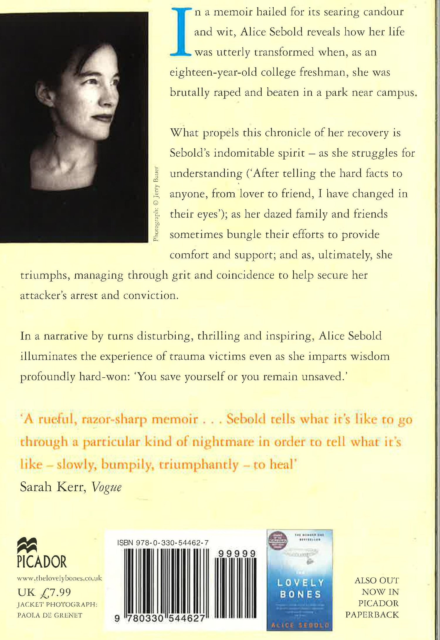In a memoir hailed for its searing candour and wit, Alice Sebold reveals how her life was utterly transformed when, as an eighteen-year-old college freshman, she was brutally raped and beaten in a park near campus. What propels this chronicle of her recovery is Sebold's indomitable spirit - as she struggles for understanding ("After telling the hard facts to anyone, from lover to friend, I have changed in their eyes"); as her dazed family and friends sometimes bungle their efforts to provide comfort and support; and as, ultimately, she triumphs, managing through grit and coincidence to help secure her attacker's arrest and conviction. In a narrative by turns disturbing, thrilling, and inspiring, Alice Sebold illuminates the experience of trauma victims even as she imparts wisdom profoundly hard-won: "You save yourself or you remain unsaved.
