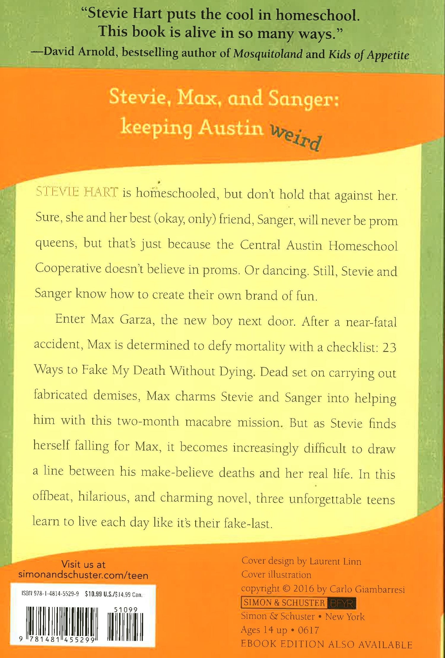 Stevie Hart is homeschooled, but don't hold that against her. Sure, she and her best (okay, only) friend, Sanger, will never be prom queens, but that's just because the Central Austin Homeschool Cooperative doesn't believe in proms. Or dancing. Still, Stevie and Sanger know how to create their own brand of fun.Enter Max Garza, the new boy next door. After a near-fatal accident, Max is determined to defy mortality with a checklist: 23 Ways to Fake My Death Without Dying. Dead set on carrying out fabricated demises, Max charms Stevie and Sanger into helping him with this two-month macabre mission. But as Stevie finds herself falling for Max, it becomes increasingly difficult to draw a line between his make-believe deaths and her real life. In this offbeat, hilarious, and charming novel, three unforgettable teens learn to live each day like it's their fake-last.