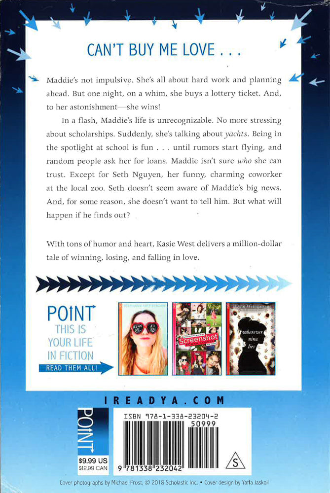 Maddie's not impulsive. She's all about hard work and planning ahead. But one night, on a whim, she buys a lottery ticket. And then, to her astonishment -- She wins! In a flash, Maddie's life is unrecognizable. No more stressing about college scholarships. Suddenly, she's talking about renting a yacht. And being in the spotlight at school is fun . . . until rumors start flying, and random people ask her for loans. Now, Maddie isn't sure who she can trust. Except for Seth Nguyen, her funny, charming coworker at the local zoo. Seth doesn't seem aware of Maddie's big news. And, for some reason, she doesn't want to tell him. But what will happen if he learns her secret? With tons of humor and heart, Kasie West delivers a million-dollar tale of winning, losing, and falling in love.
