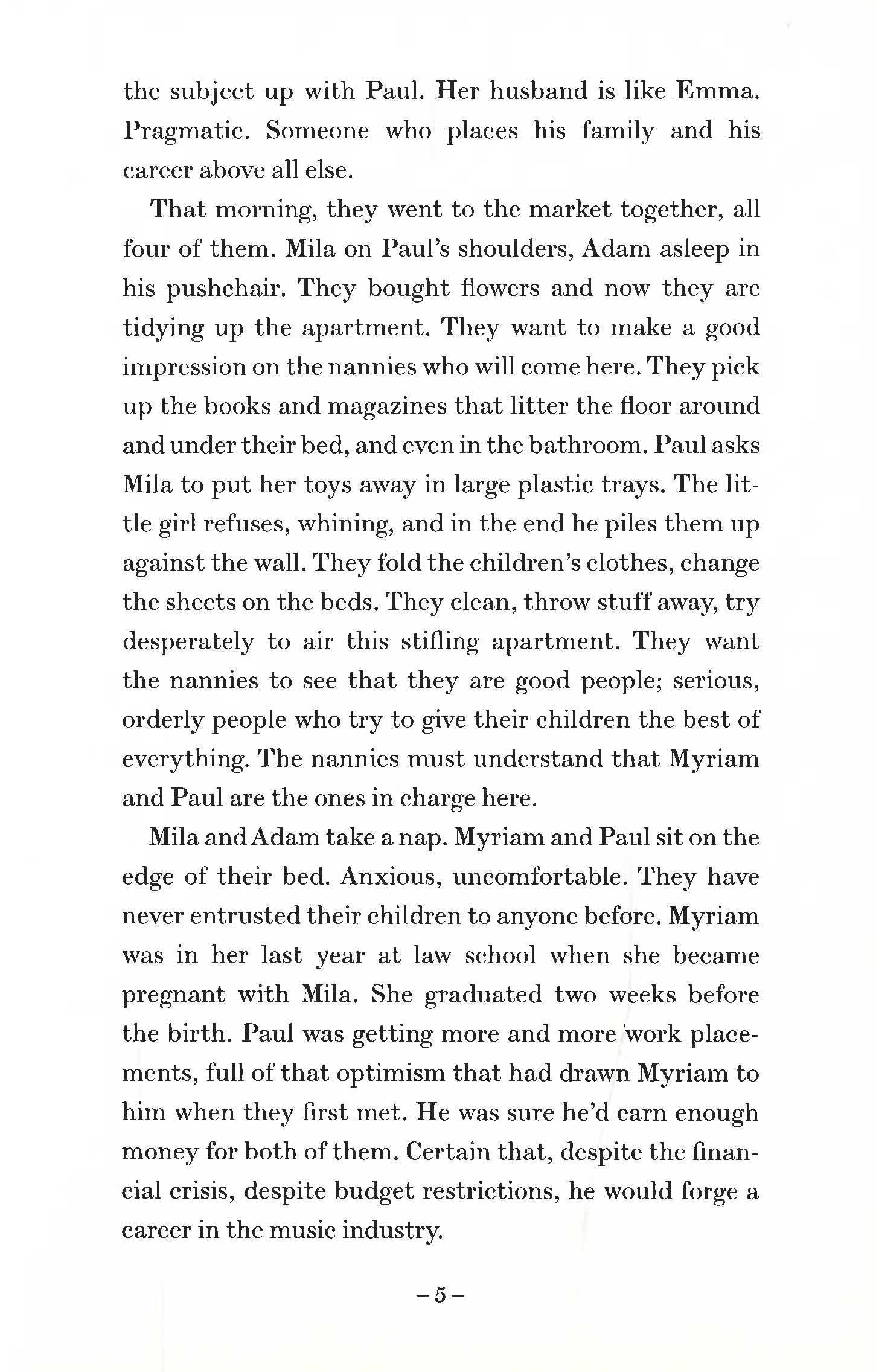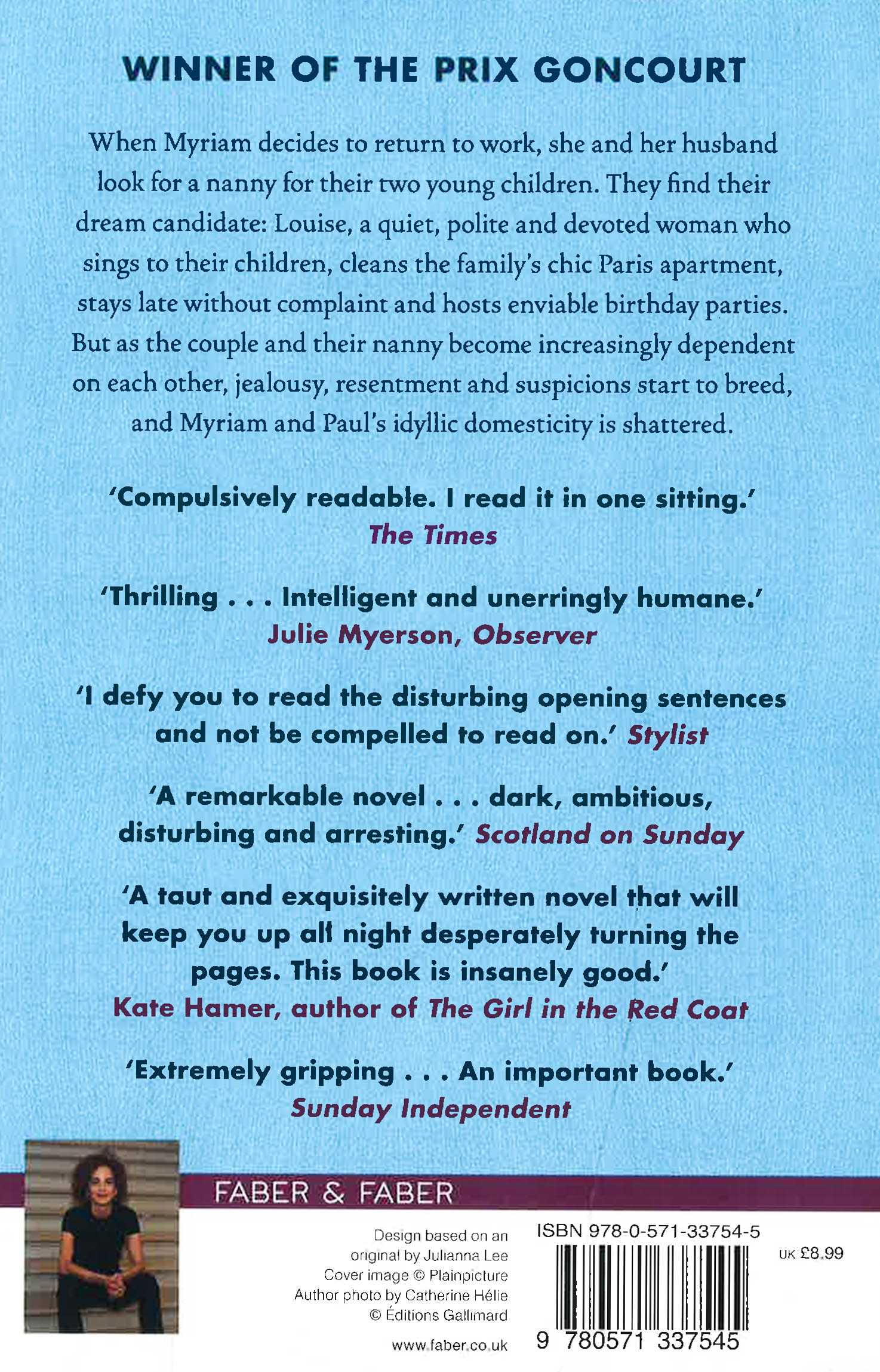 WINNER OF THE DEBUT NOVEL OF THE YEAR AT THE BRITISH BOOK AWARDS 2019 A SUNDAY TIMES TOP 100 NOVEL OF THE TWENTY-FIRST CENTURY The baby is dead. It took only a few seconds. When Myriam, a brilliant lawyer, decides to return to work, she and her husband look for a nanny for their two young children. They never dreamed they would find Louise: a quiet, polite and devoted woman who sings to their children, cleans the family's chic Paris apartment, stays late without complaint and hosts enviable birthday parties. But as the couple and their nanny become more and more dependent on each other, jealousy, resentment and suspicions increase, until Myriam and Paul's idyllic domesticity is shattered . . .