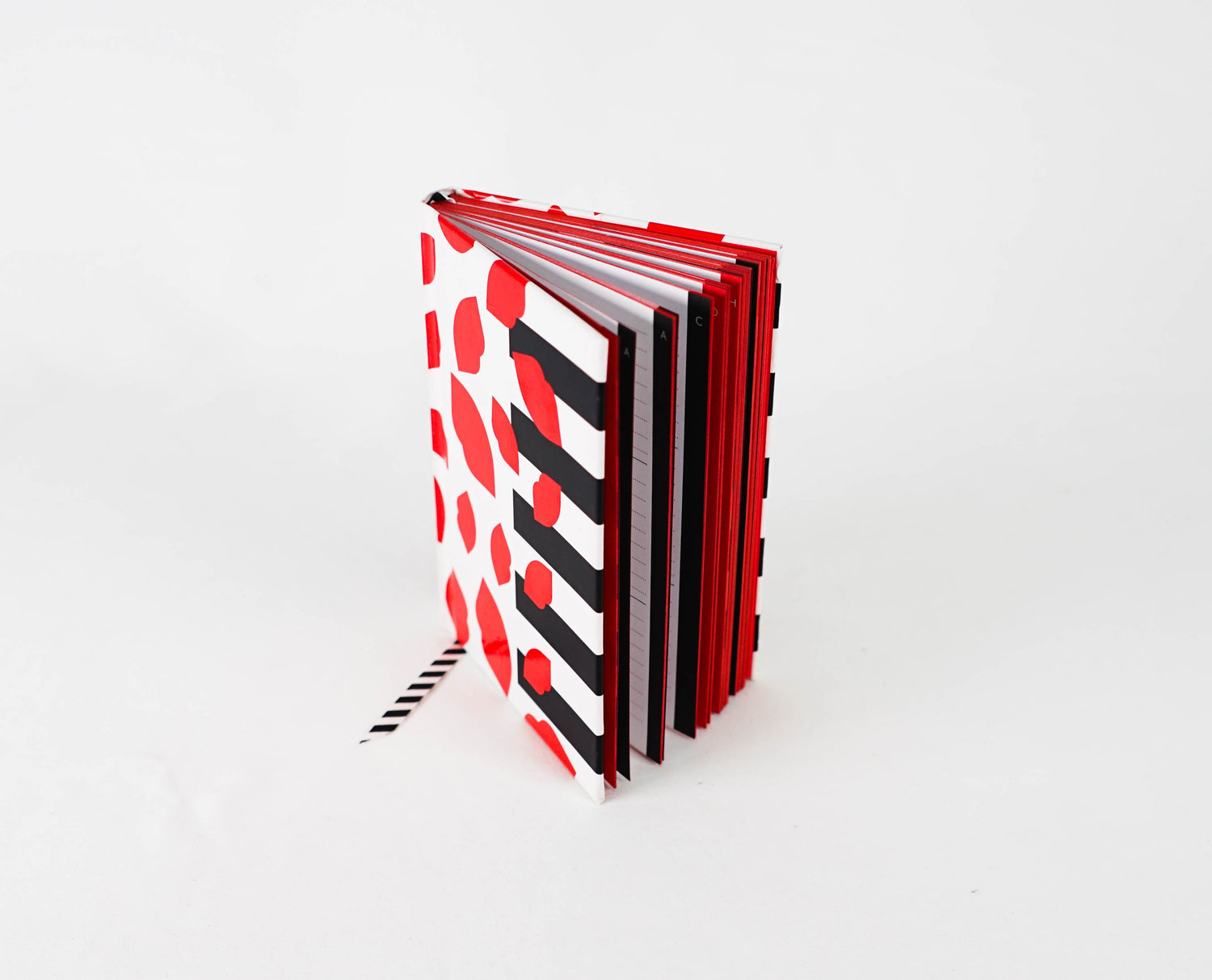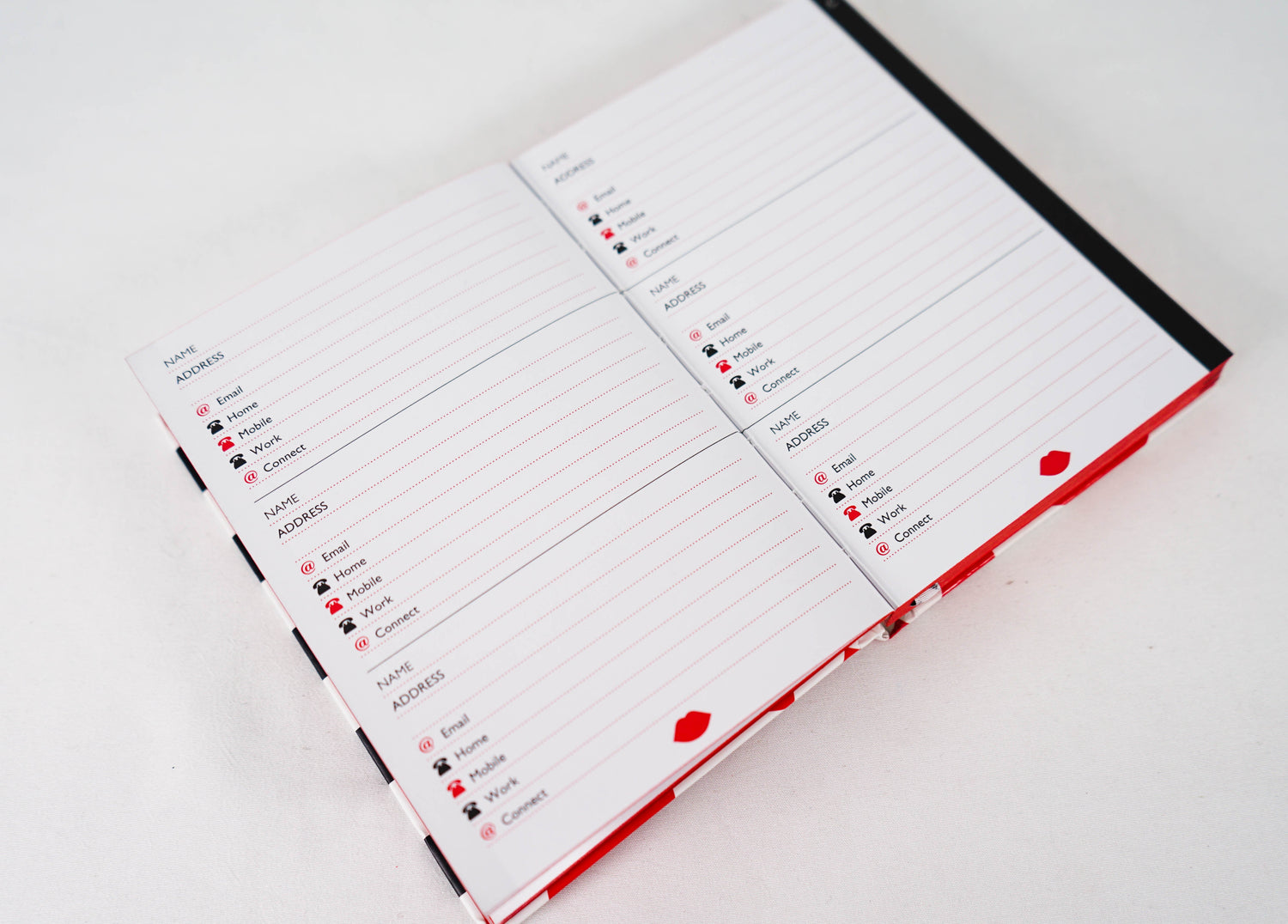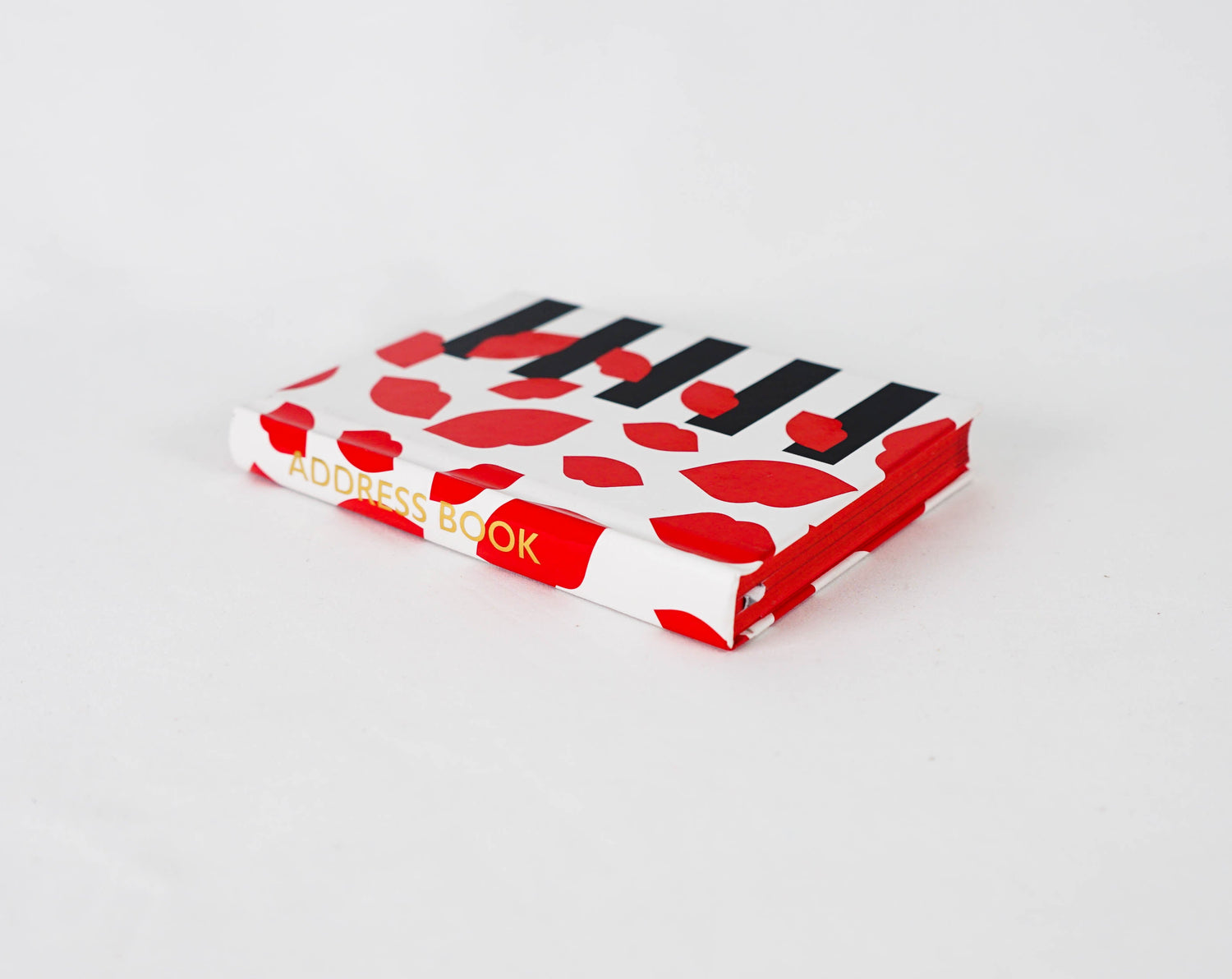 Keep track of all of your contacts in this stylish address book with red edges and a ribbon marker. It also includes four die-cut pockets interspersed throughout the book to hold business cards or tickets.