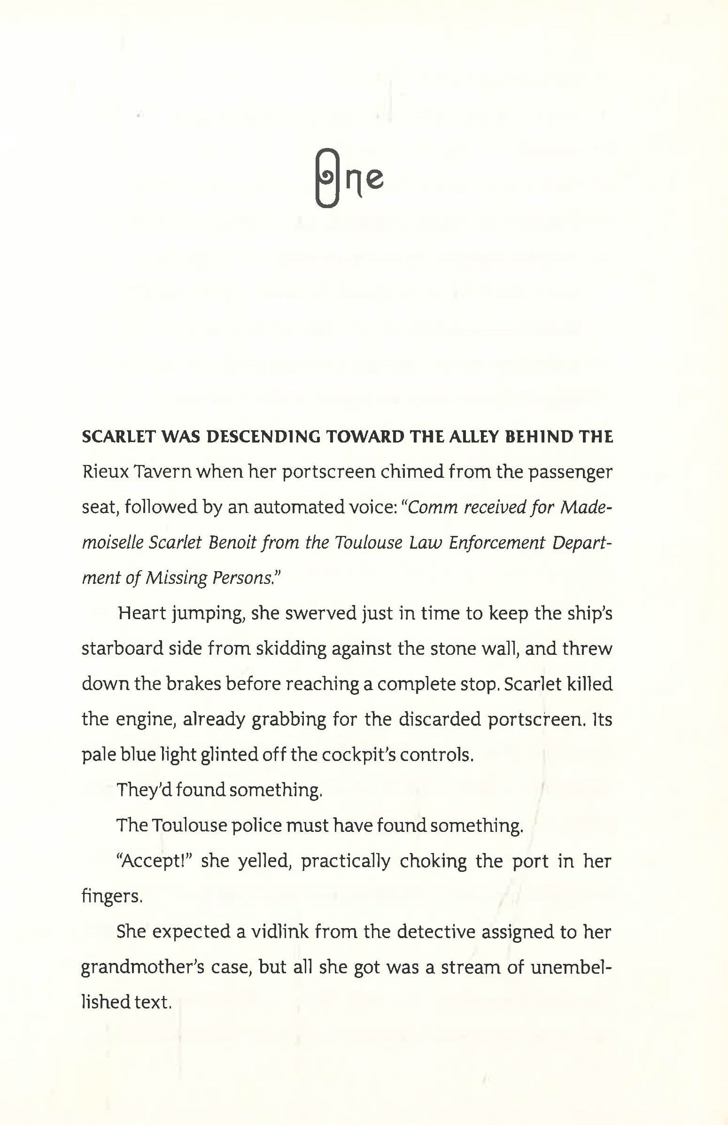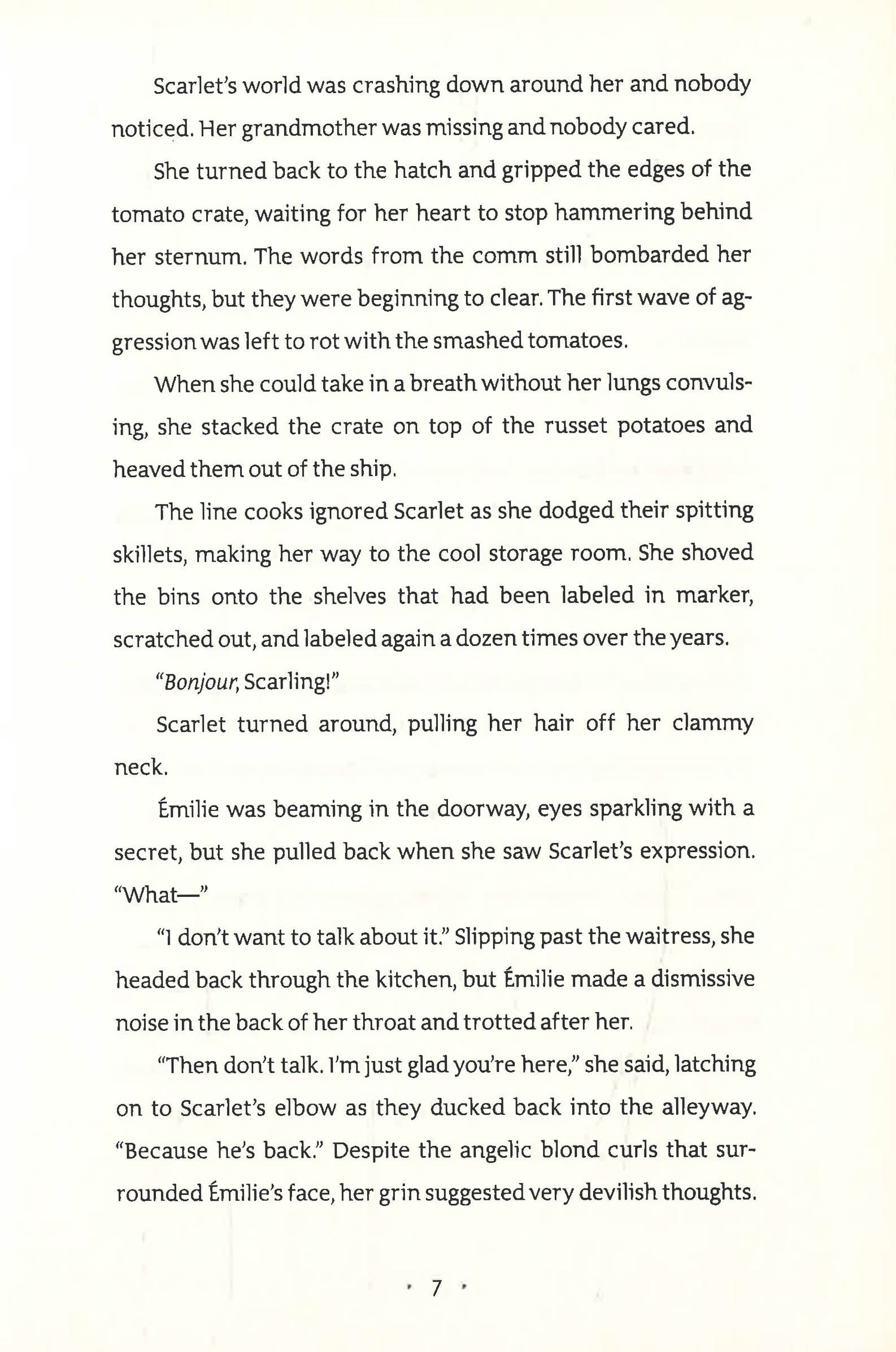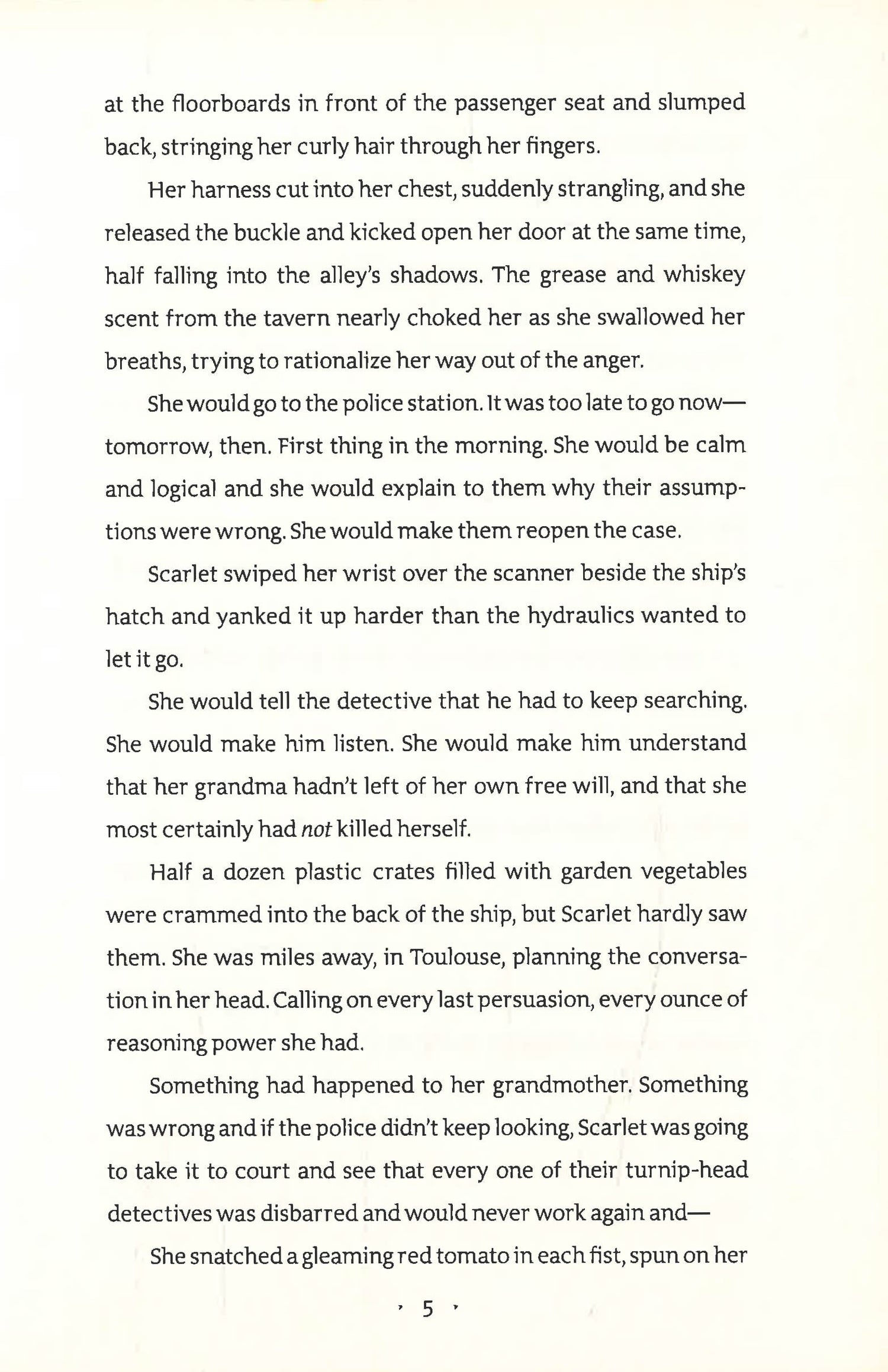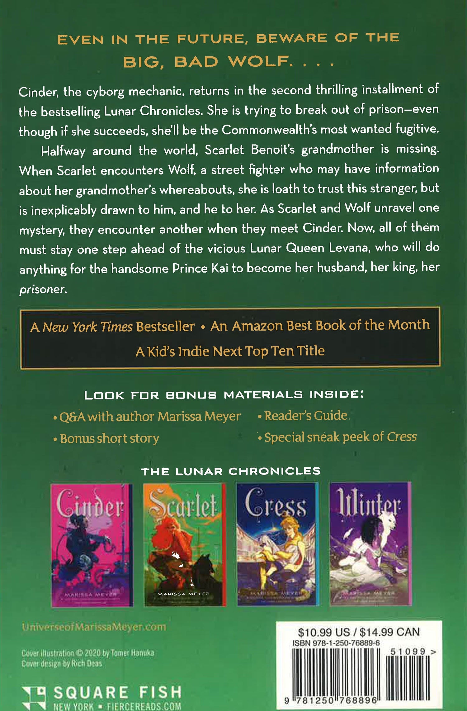 Halfway around the world, Scarlet Benoit's grandmother is missing. It turns out there are many things Scarlet doesn't know about her grandmother, or the grave danger she has lived in her whole life. When Scarlet encounters Wolf, a street fighter who may have information as to her grandmother's whereabouts, she is loath to trust this stranger, but is inexplicably drawn to him, and he to her. As Scarlet and Wolf unravel one mystery, they encounter another when they meet Cinder. Now, all of them must stay one step ahead of the vicious Lunar Queen Levana.
