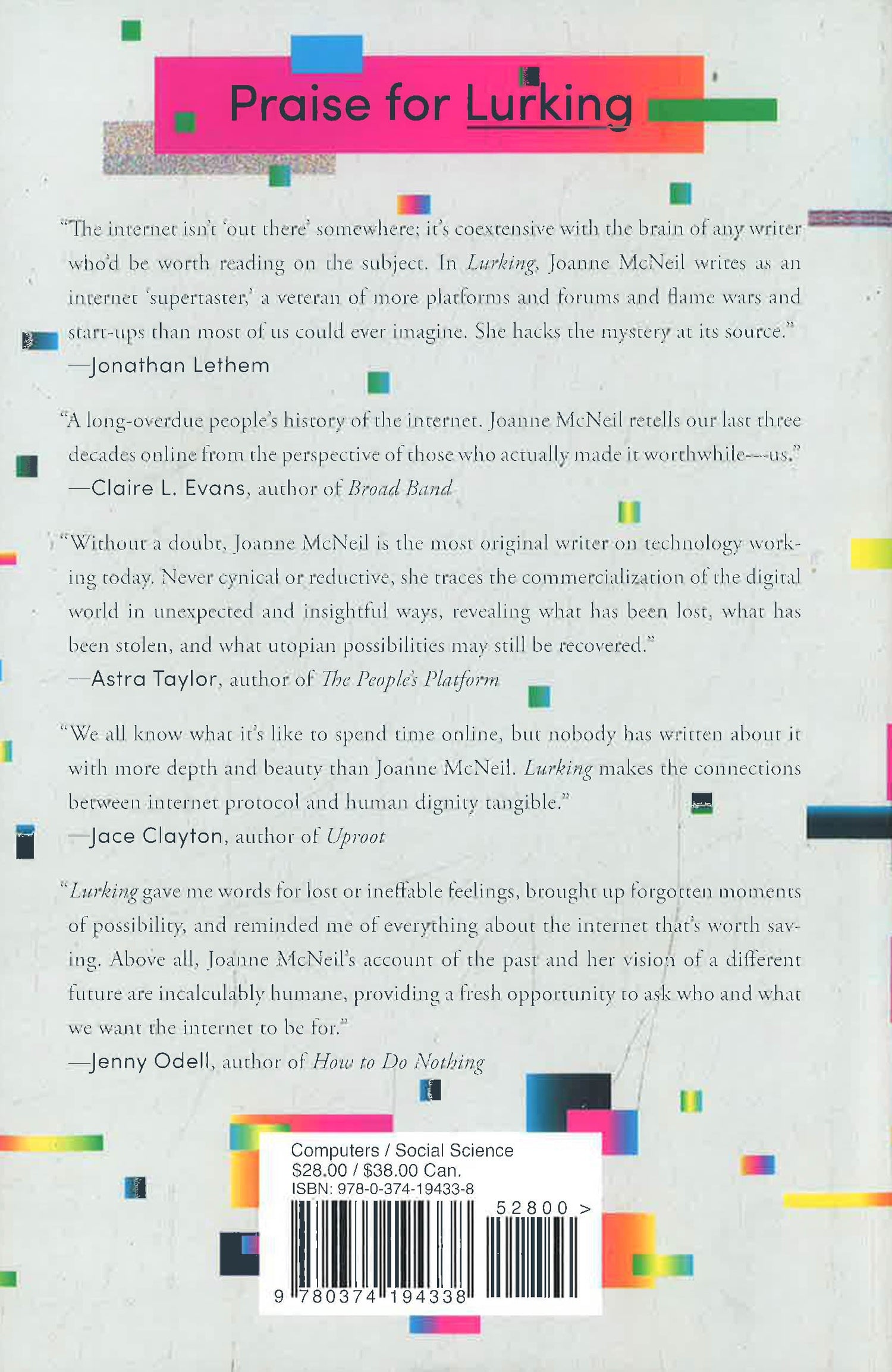 In Lurking, Joanne McNeil digs deep and identifies the primary (if sometimes contradictory) concerns of people online: searching, safety, privacy, identity, community, anonymity, and visibility. She charts what it is that brought people online and what keeps us here even as the social equations of digital life—what we’re made to trade, knowingly or otherwise, for the benefits of the internet—have shifted radically beneath us. It is a story we are accustomed to hearing as tales of entrepreneurs and visionaries and dynamic and powerful corporations, but there is a more profound, intimate story that hasn’t yet been told.
