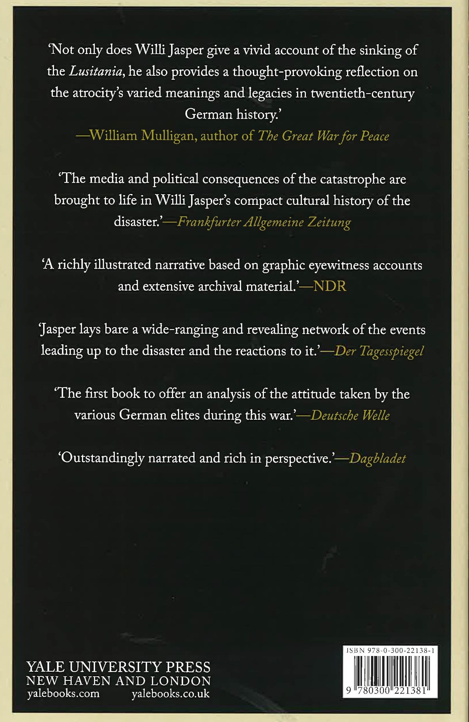 On May 7, 1915, the Lusitania, a large British luxury liner, was sunk by a German submarine off the Irish coast. Nearly 1,200 people, including 128 American citizens, lost their lives. The sinking of a civilian passenger vessel without warning was a scandal of international scale and helped precipitate the United States' decision to enter the conflict. It also led to the immediate vilification of Germany. Though the ship's sinking has preoccupied historians and the general public for over a century, until now the German side of the story has been largely untold. Drawing on varied German sources, historian Willi Jasper provides a comprehensive reappraisal of the sinking and its aftermath that focuses on the German reaction and psyche. The attack on the Lusitania, he argues, was not simply an escalation of violence but signaled a new ideological, moral, and religious dimension in the struggle between German Kultur and Western civilization.