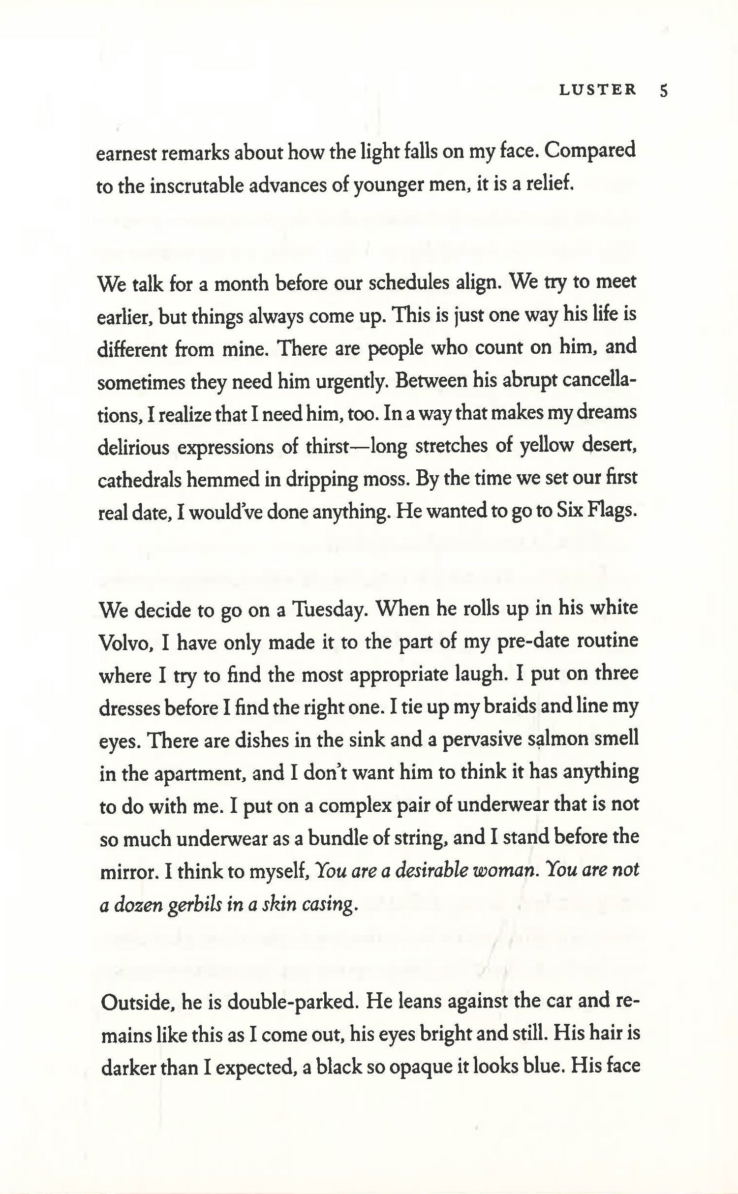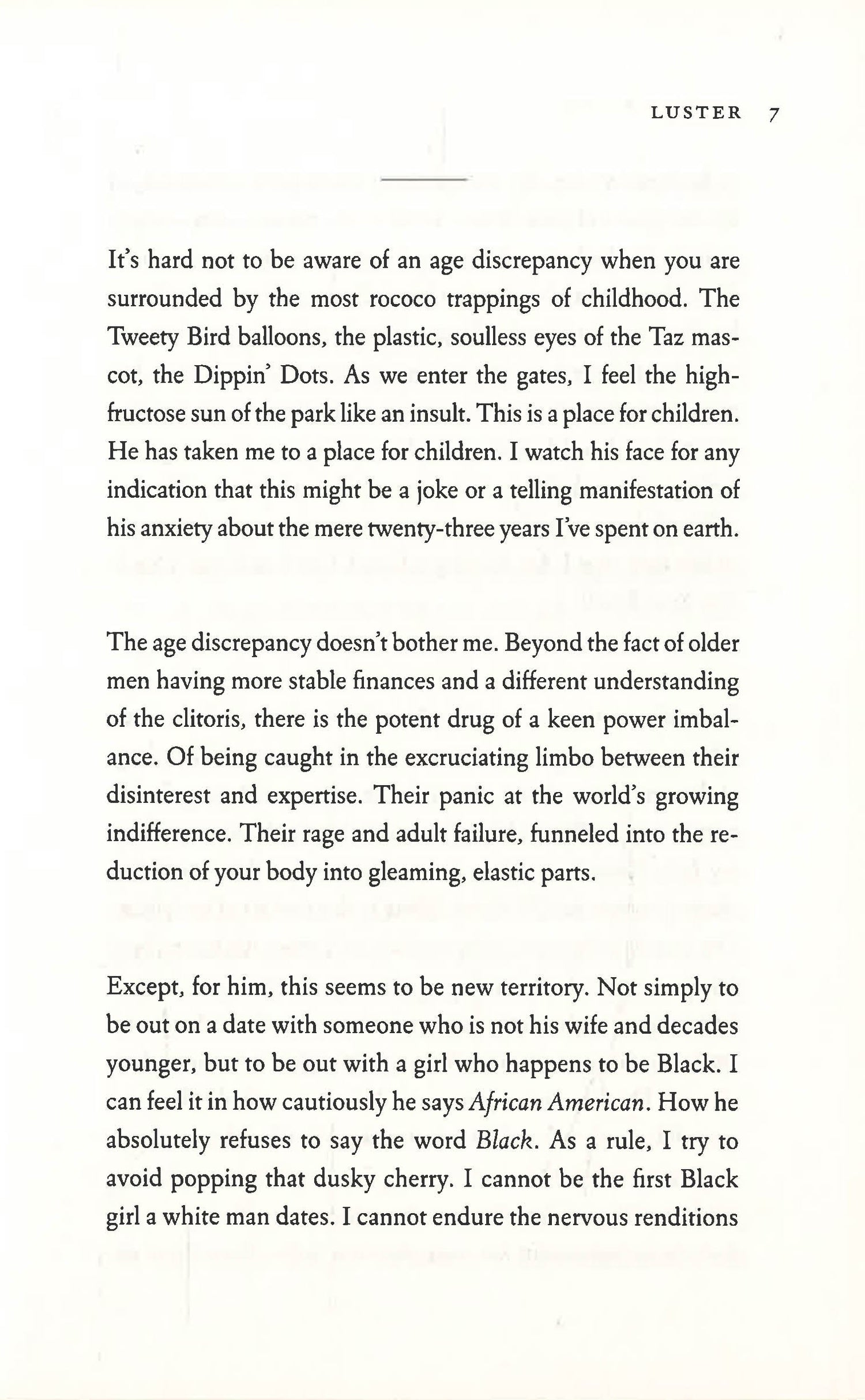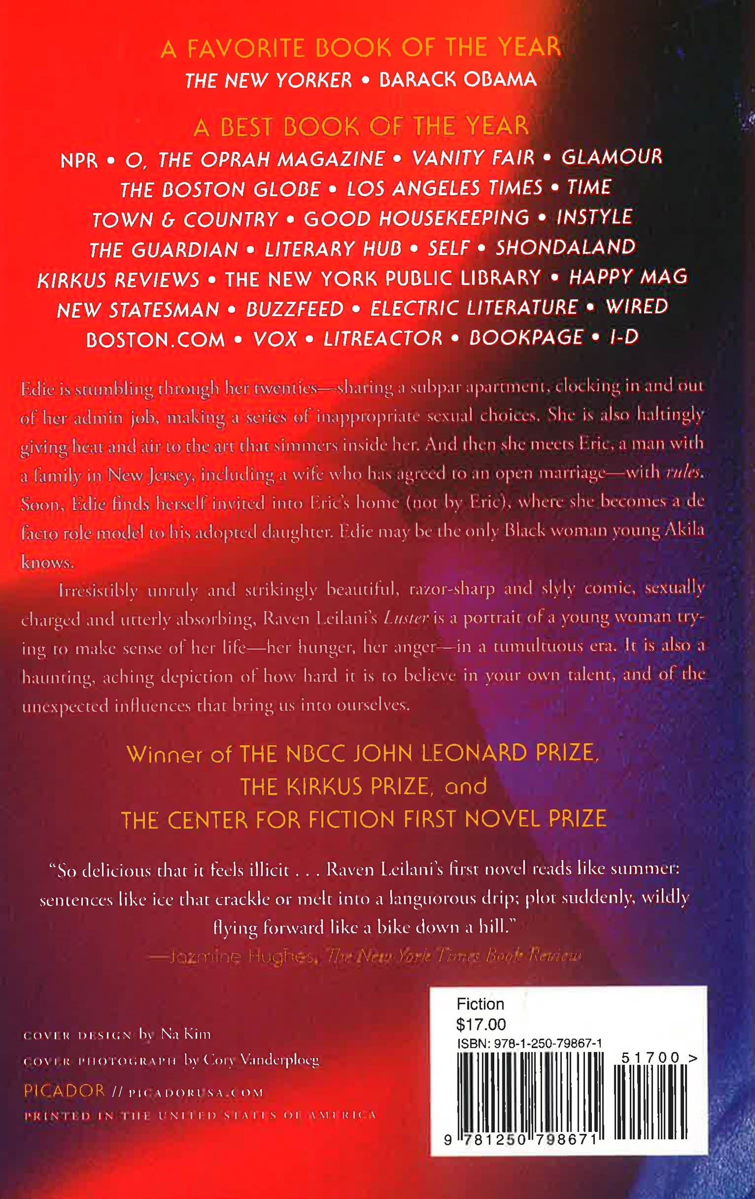 Irresistibly unruly and strikingly beautiful, razor-sharp and slyly comic, sexually charged and utterly absorbing, Raven Leilani’s Luster is a portrait of a young woman trying to make sense of her life―her hunger, her anger―in a tumultuous era. It is also a haunting, aching description of how hard it is to believe in your own talent, and the unexpected influences that bring us into ourselves along the way.