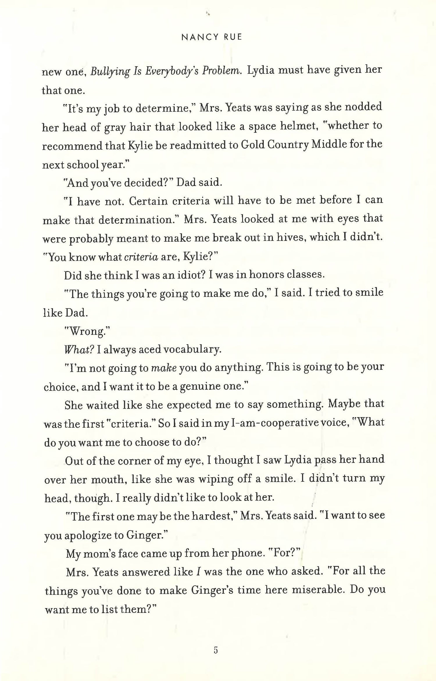 Bullies aren't born mean--through the vicious cycle of mean, bullies aremade. According to the Ambassadors 4 Kids Club, one out of every four students is bullied--and 85% of these situations never receive intervention. Parents, students, and teachers have amped up solving the bullying problem for a networked generation of kids. Written by bestselling author Nancy Rue, each book in the Mean Girl Makeover trilogy focuses on a different character's point of view: the bully, the victim, and the bystander. The books show solid biblical solutions to the bullying problem set in a story for tween girls. Sorry I'm Not Sorrytells the story of Kylie Steppe, former queen bee of Gold Country Middle School. After bullying a fellow GCMS student, Kylie has been expelled--andshehas to attend mandatory counseling. Without her posse to aid her and other peers to torment, Kylie focuses on the person who stole her GVMS popularity crown: Tori Taylor. As Kylie plots revenge on Tori, she attends therapy sessions, where she reveals a few details that might explain why she finds power in preying on her middle school peers. After a rough year with bullying backfire, will Kylie decide to become more empathetic with her peers? It's hard for tweens to imagine why a bully acts the way she does.Sorry I'm Not Sorryshows girls that they hold the power to stop bullying through mutual understanding and acts of love.
