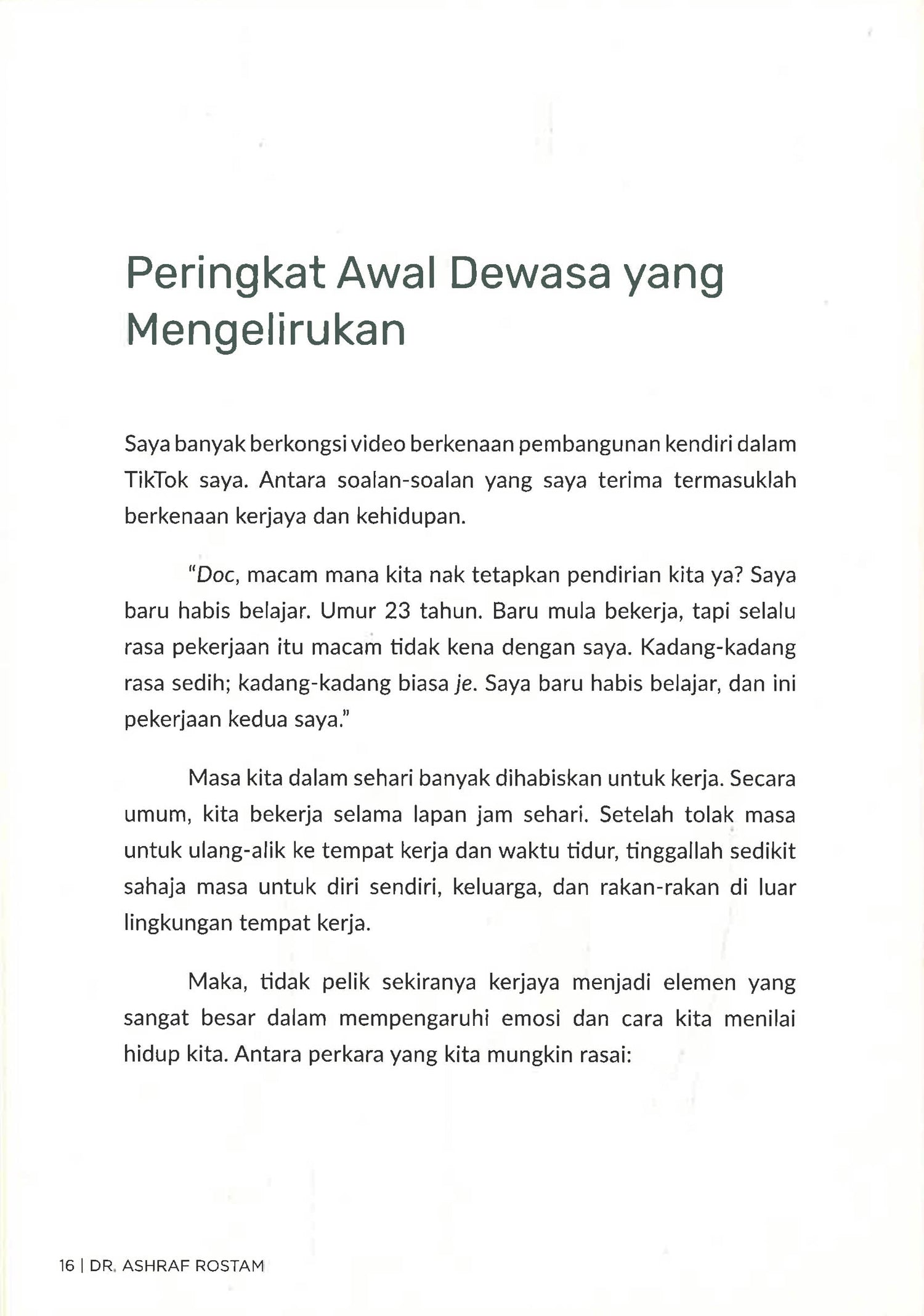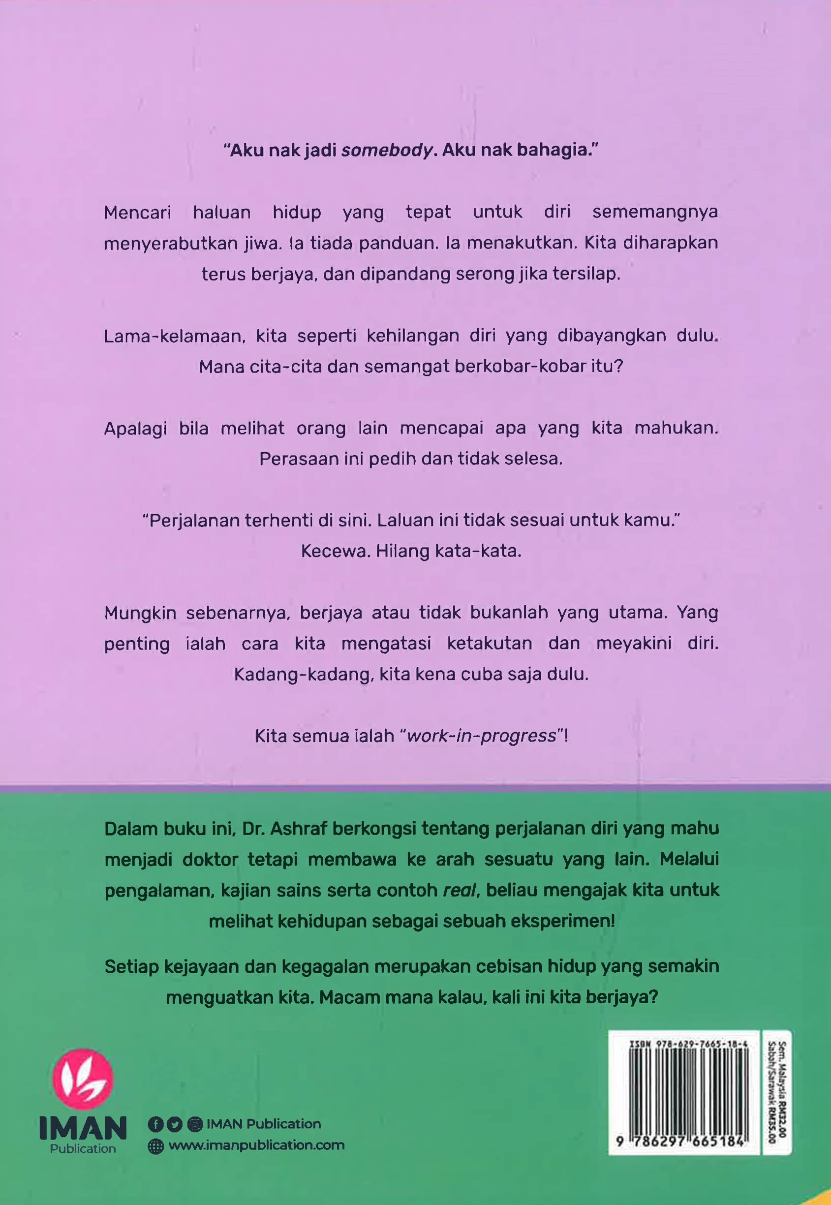 Dalam buku ini, Dr. Ashraf berkongsi tentang perjalanan diri yang mahu menjadi doktor tetapi membawa ke arah sesuatu yang lain. Melalui pengalaman, kajian sains serta contoh real, beliau mengajak kita untuk melihat kehidupan sebagai sebuah eksperimen!