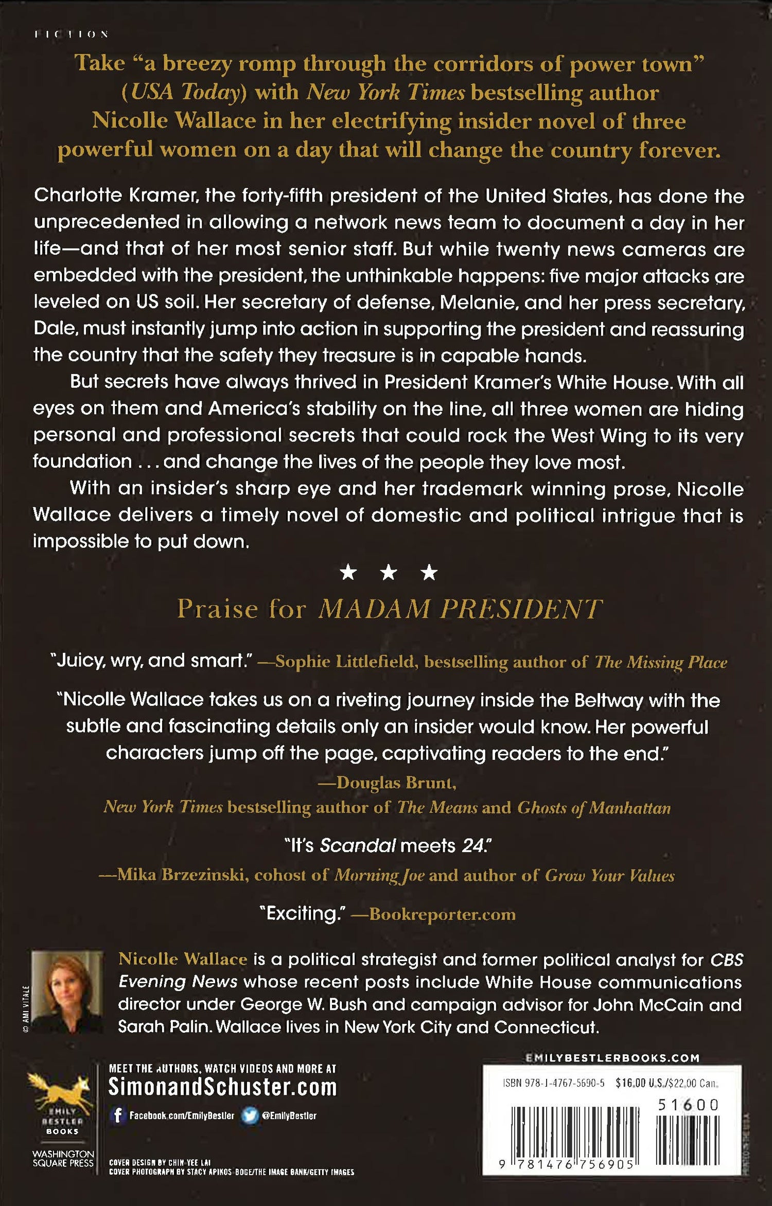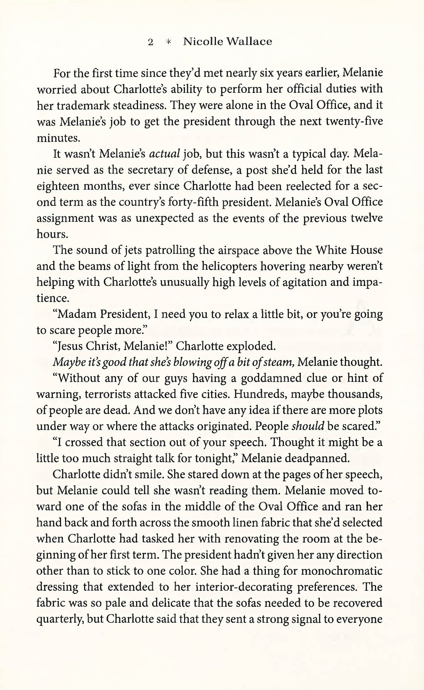 Take a breezy romp through the corridors of power town (USA TODAY) with co-host of The View and former White House Communications director Nicolle Wallace in her electrifying insider novel of three powerful women on a day that will change the country forever. Charlotte Kramer, the 45th President of the United States, has done the unprecedented in allowing a network news team to document a day in her life - and that of her most senior staff. But while twenty news cameras are embedded with the president, the unthinkable happens: five major attacks are leveled on US soil. Her secretary of defense, Melanie, and her press secretary, Dale, must instantly jump into action in supporting the president and reassuring the country that the safety they treasure is in capable hands. But secrets have always thrived in President Kramers White House. With all eyes on them and Americas stability on the line, all three women are hiding personal and professional secrets that could rock the West Wing to its very foundations…and change the lives of the people they love most. With an insiders sharp eye and her trademark winning prose, Nicolle Wallace delivers a timely novel of domestic and political intrigue that is impossible to put down.