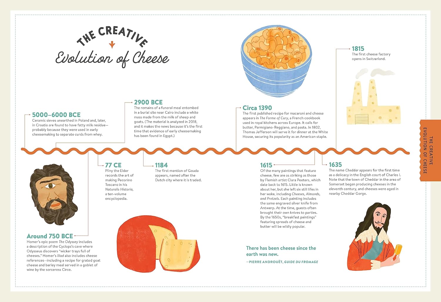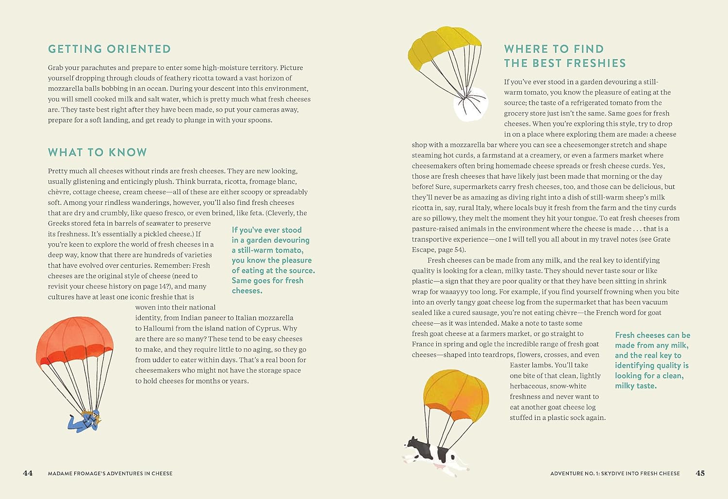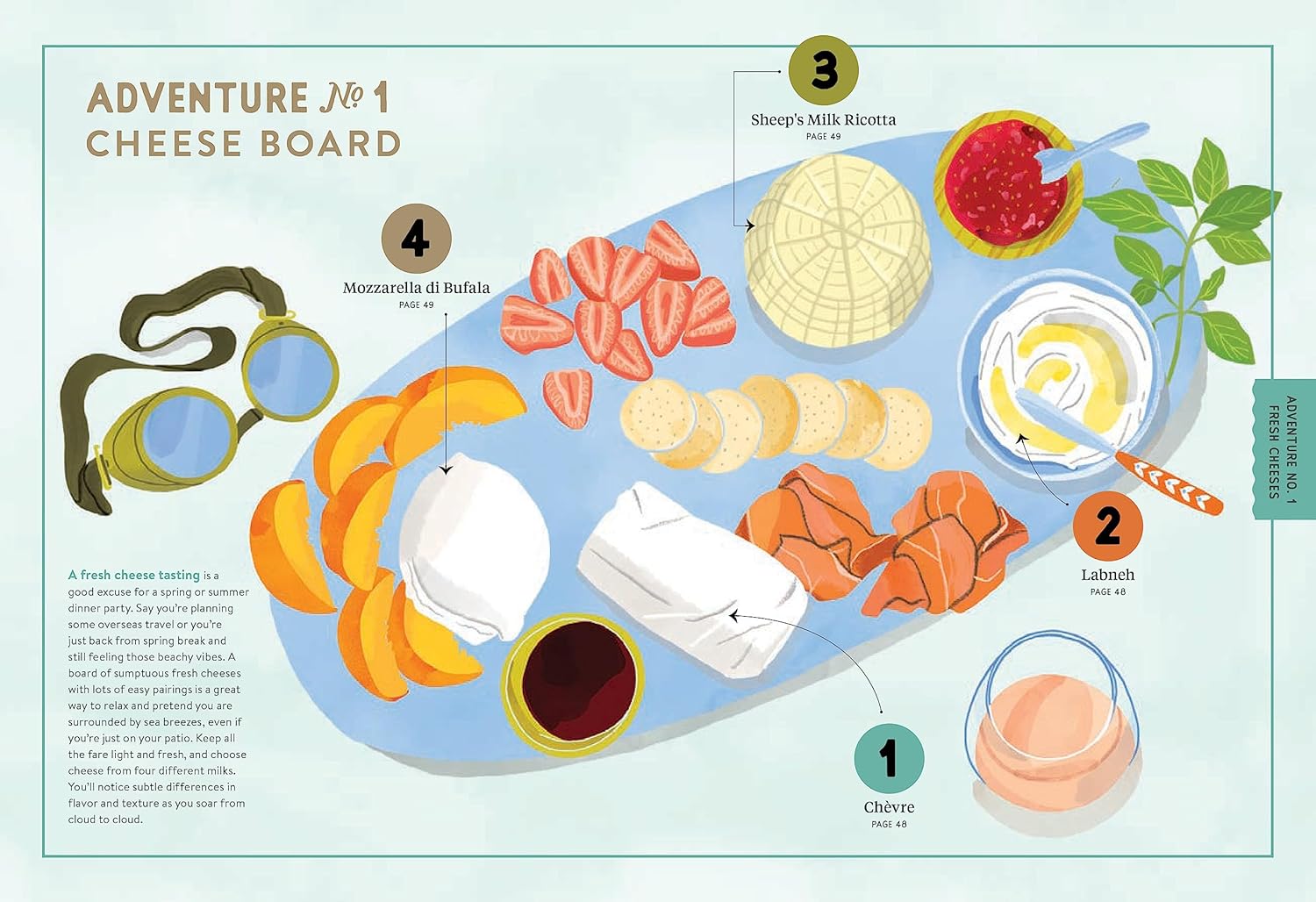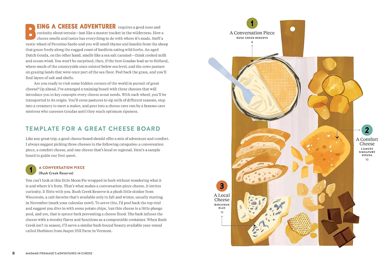 Structured around the concept of eight tasting journeys, Madame Fromage takes us on tours through the cheese world. We skydive into fresh cheeses, like chevres, ricotta, and buffalo mozzarella. Trek through the Alpines, with its Emmentalers and Gruyeres. Go spelunking into stinky cheeses like Taleggio, Pont-l'Eveque, and the rank Langres. Take a geological adventure with aged cheeses, including Parmigiano Reggiano and Manchego, and hop on a blue cheese rock 'n' roll tour-with their piercings and weird markings, these funky gorgonzolas, Roqueforts, and Stiltons are the rock stars of the cheese world. They also pair well with bourbon and elevate a burger, not to mention a wedge salad.