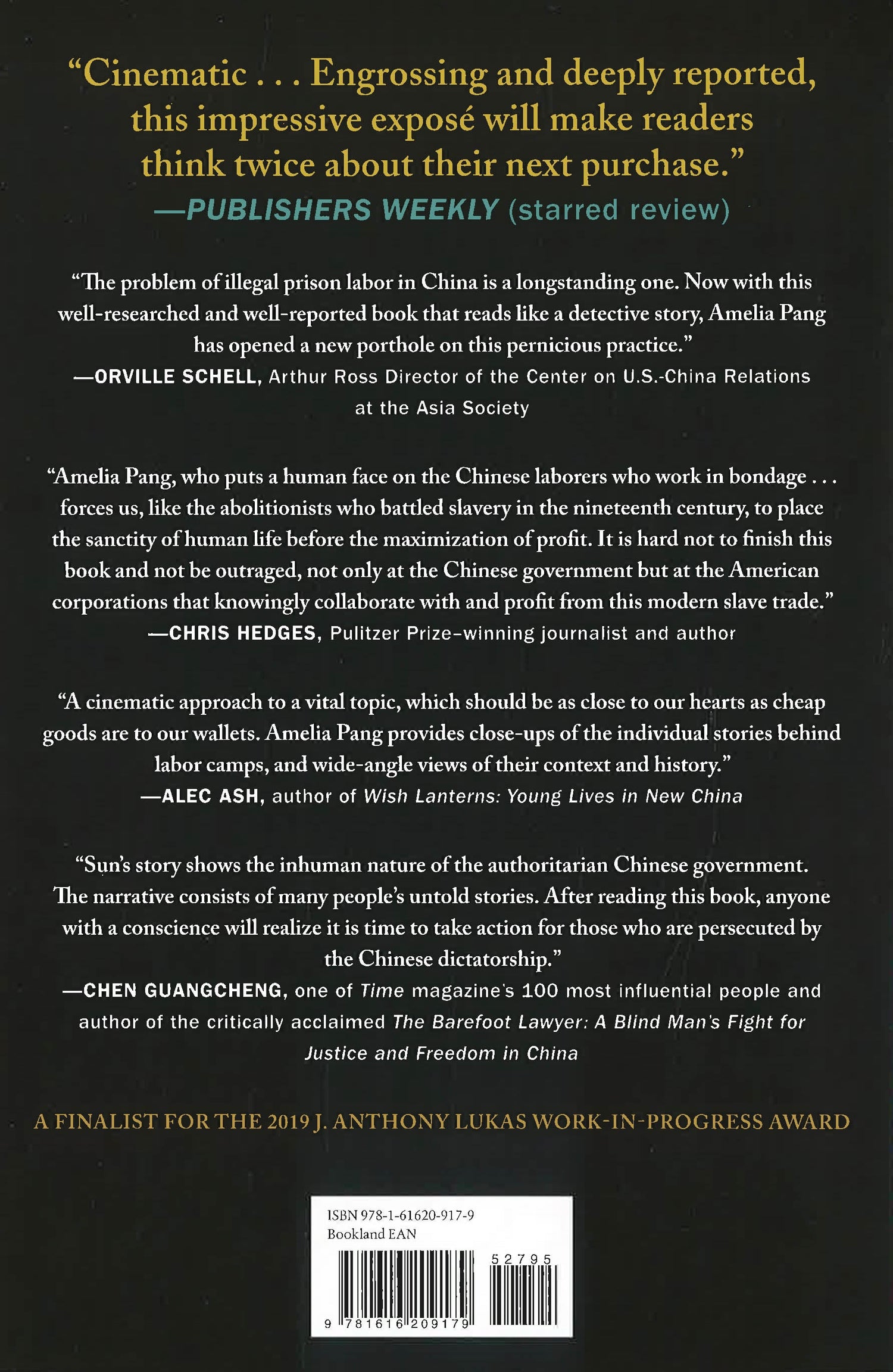 In chasing this story, journalist Amelia Pang has conducted extensive interviews with Sun Yi and the people who knew him. She also identified and interviewed others who endured similar horrors, and who inflicted them. And she traveled to China to follow falsified supply chains herself, tracking trucks from labor camps to warehouses. The story she uncovers is a call to action, urging the American consumer to ask more questions and demand more answers from the companies they patronize.