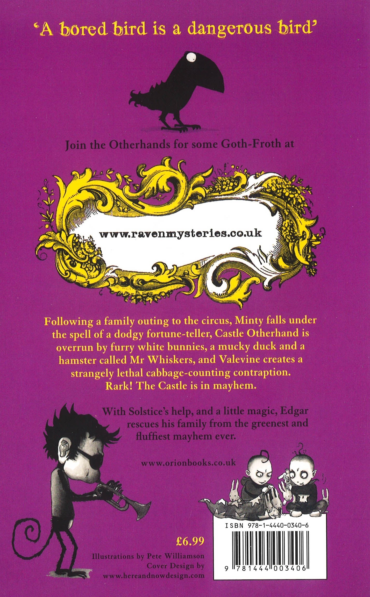 Join the wonderfully weird Otherhand family and their faithful guardian, Edgar the raven, and discover the dark secrets of Castle Otherhand. A trip to the circus has far-reaching consequences for the Otherhands when Fellah goes missing. Before long the Castle is plagued by a duck, a suspect fortune teller, and several cartloads of lethal cabbages. The family is preoccupied: Valevine is busy inventing a cabbage-counting machine; Minty is waiting to hear the secrets of the universe; and Solstice has discovered that Cudweed is concealing three hundred and forty-two rabbits in his bedroom. When chaos strikes and thieves infiltrate the Castle, it falls to Edgar to extract his family from a very fluffy predicament. Dedicated website on Raven Mysteries: www.ravenmysteries.co.uk